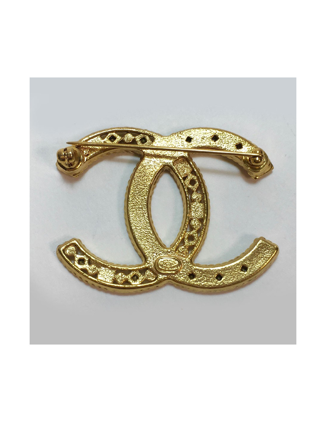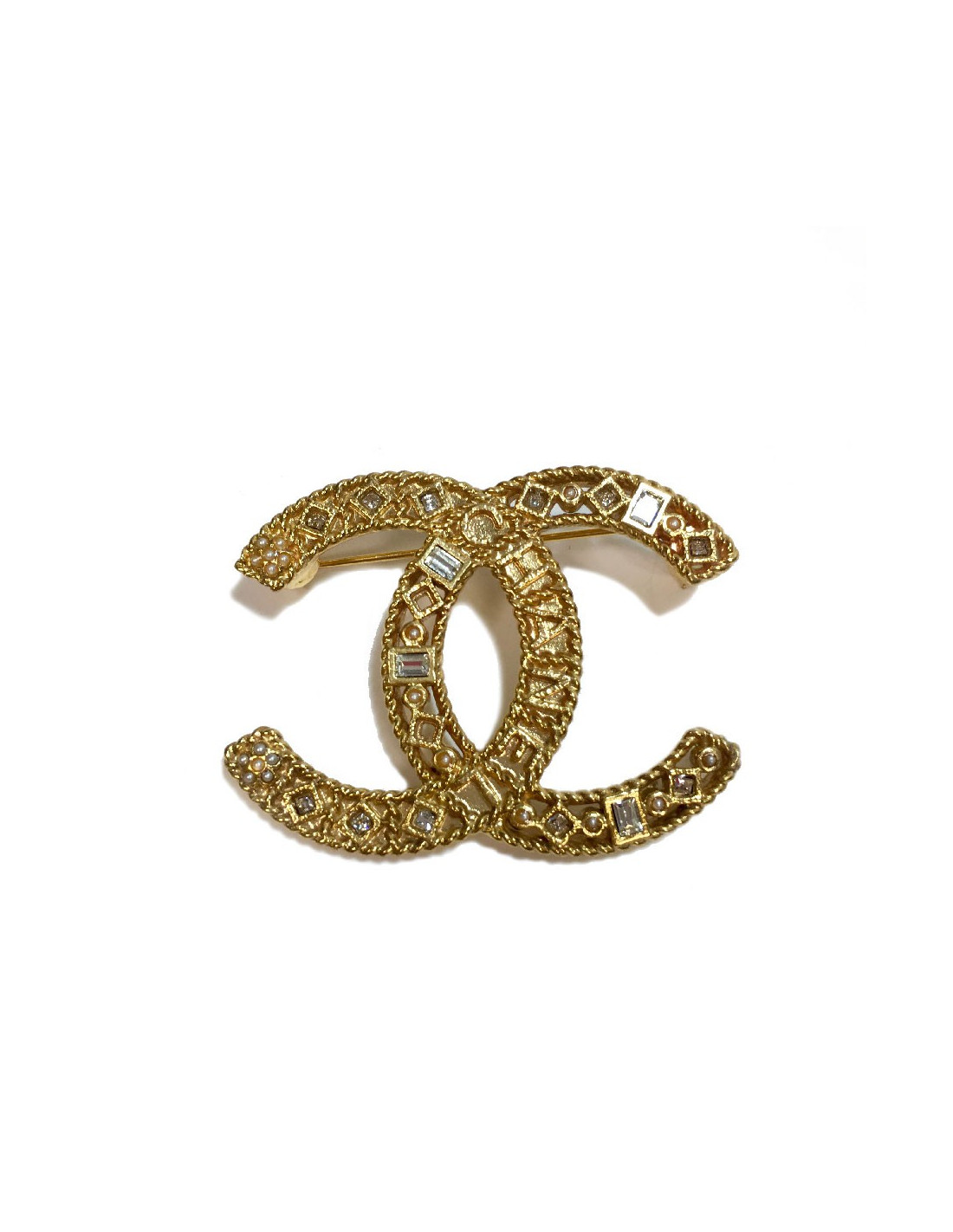 Broche Chanel CC en métal doré et strass