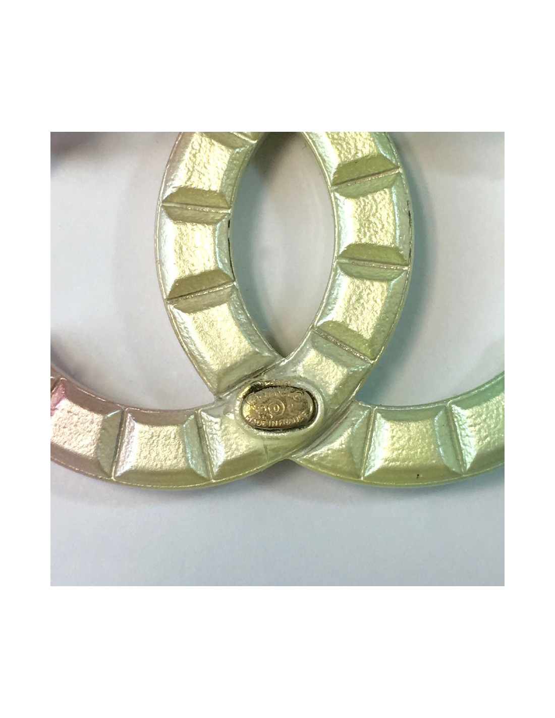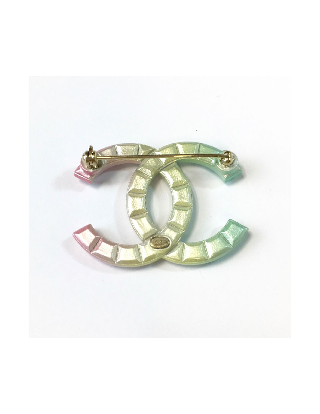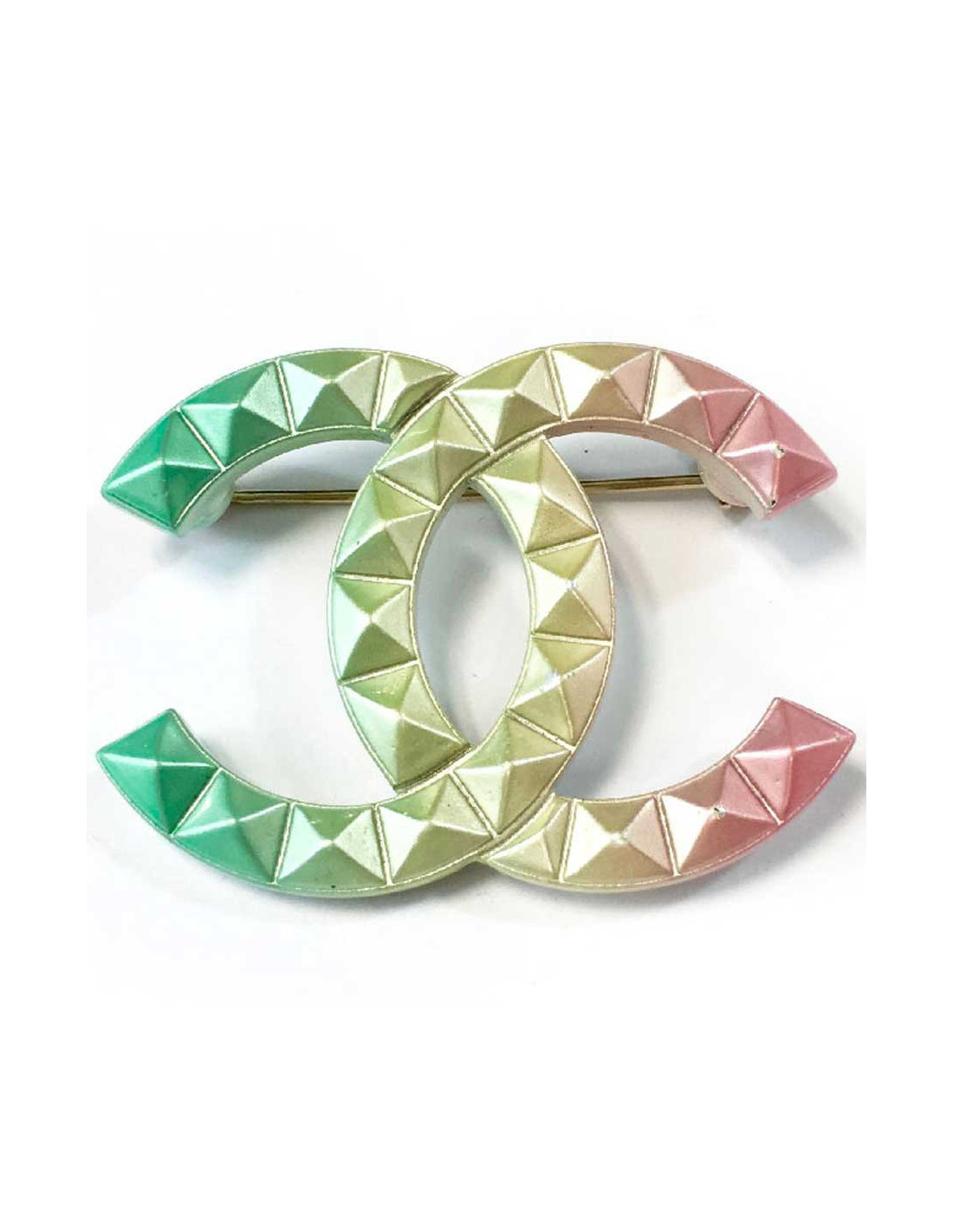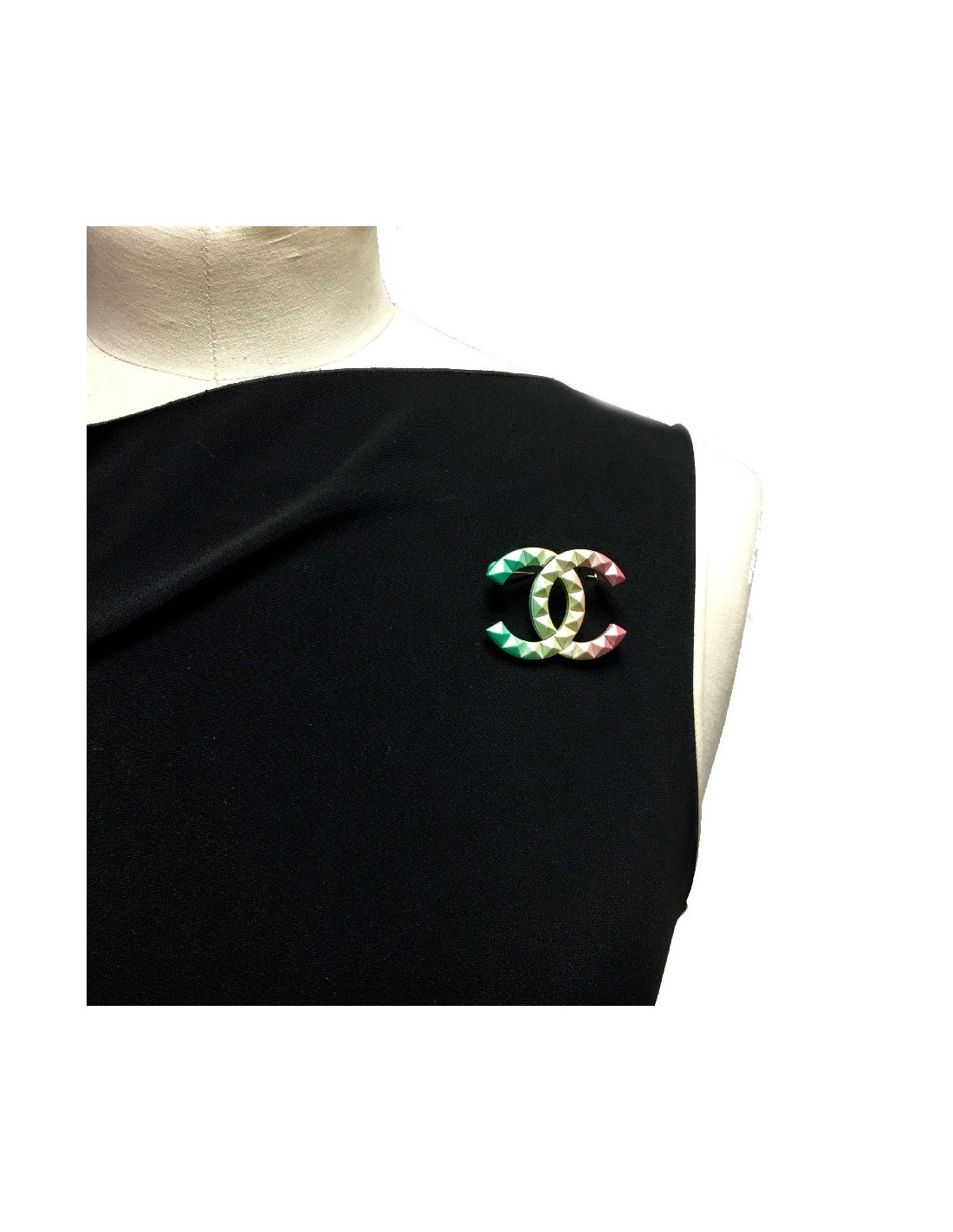 L'une des broches les plus connues de la maison Chanel, la Broche CC Chanel. Celle-ci est originale car elle est tout d'abord en métal tricolore et ensuite son motif est en pointe de diamant.
