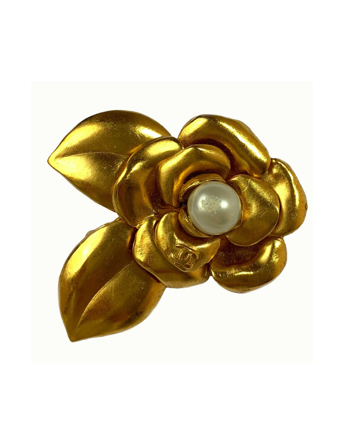 Broche de la maison Chanel représentant un des symboles de la marque : le camélia. La broche est sertie d'une perle nacrée. c'est un bijou vintage, qui, porté décalé sera dans la tendance.