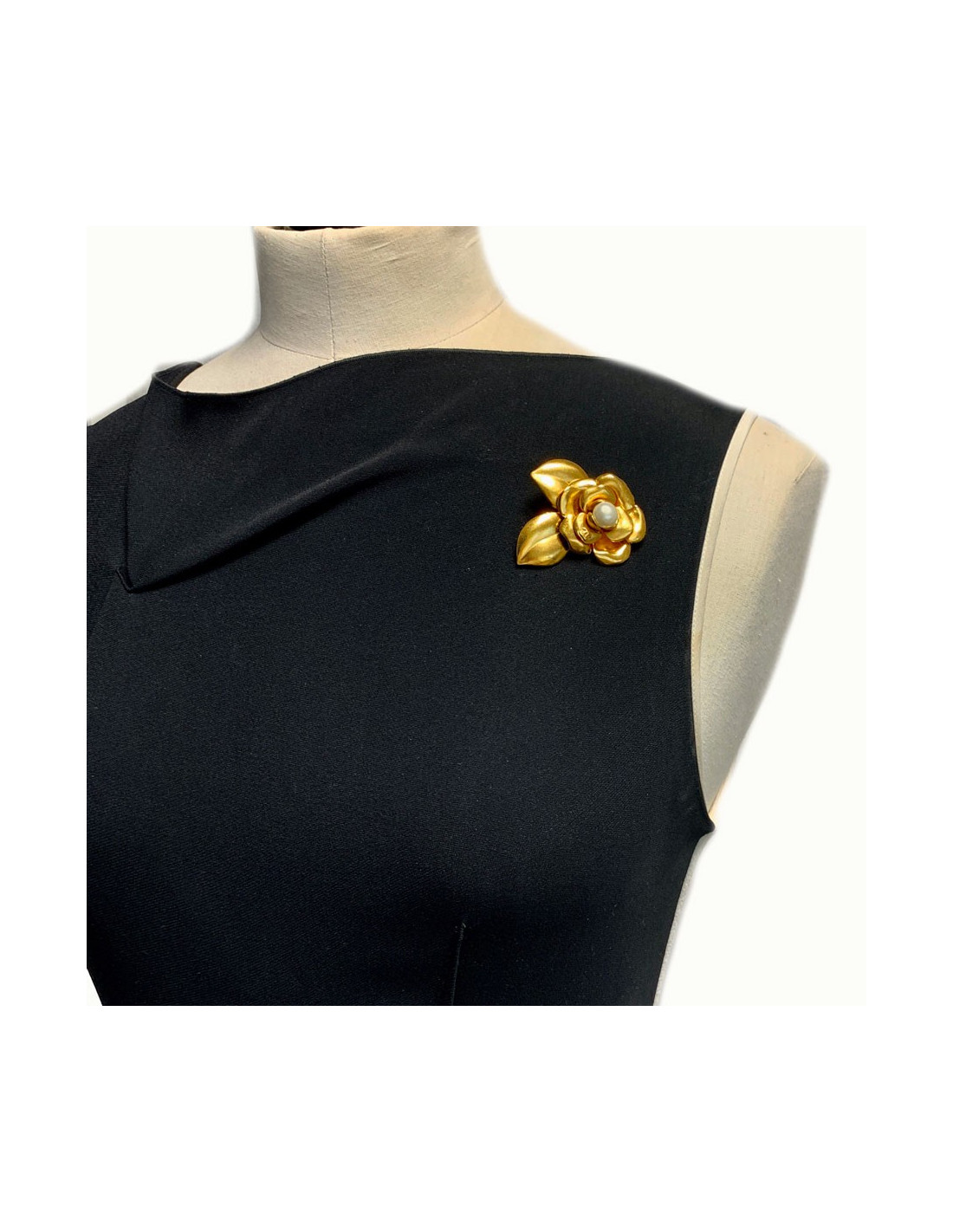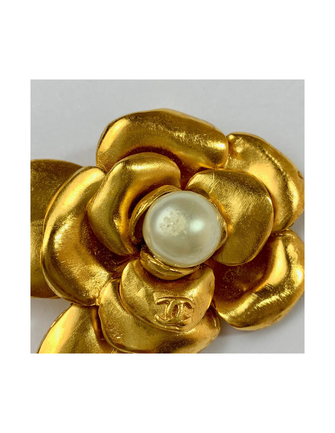 Quelques détails sur cette broche CHANEL camélia dorée et perle