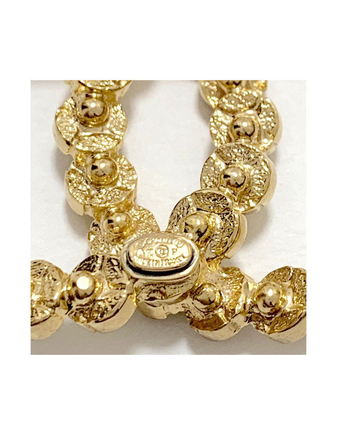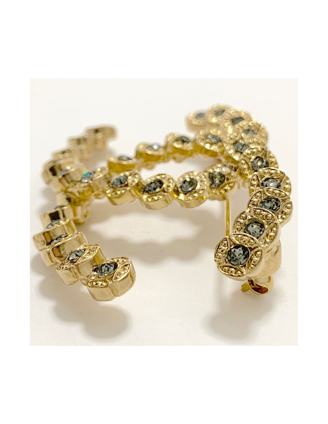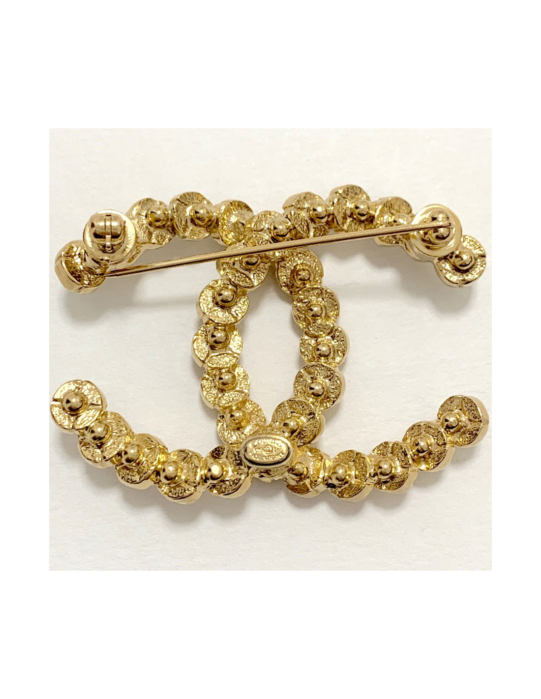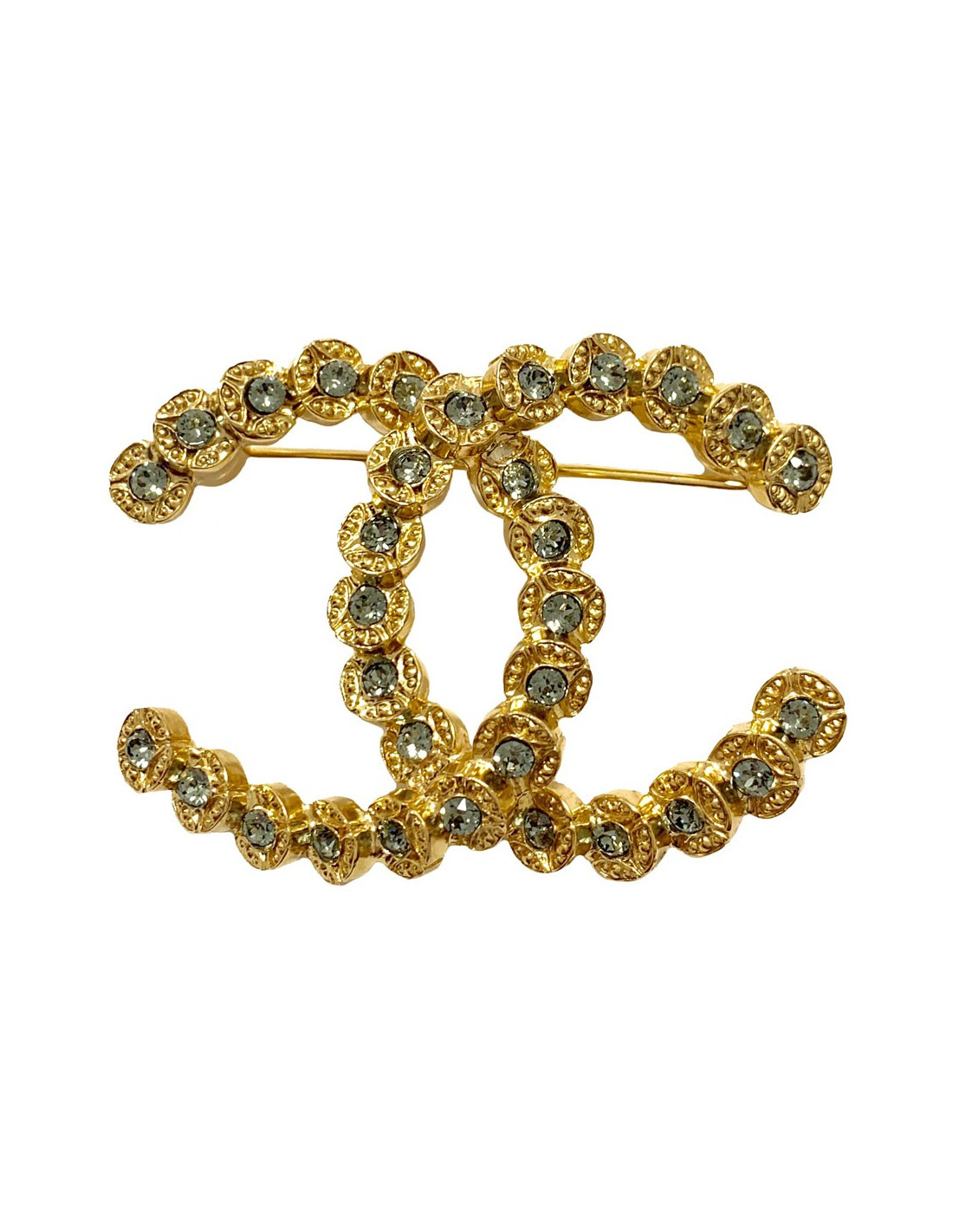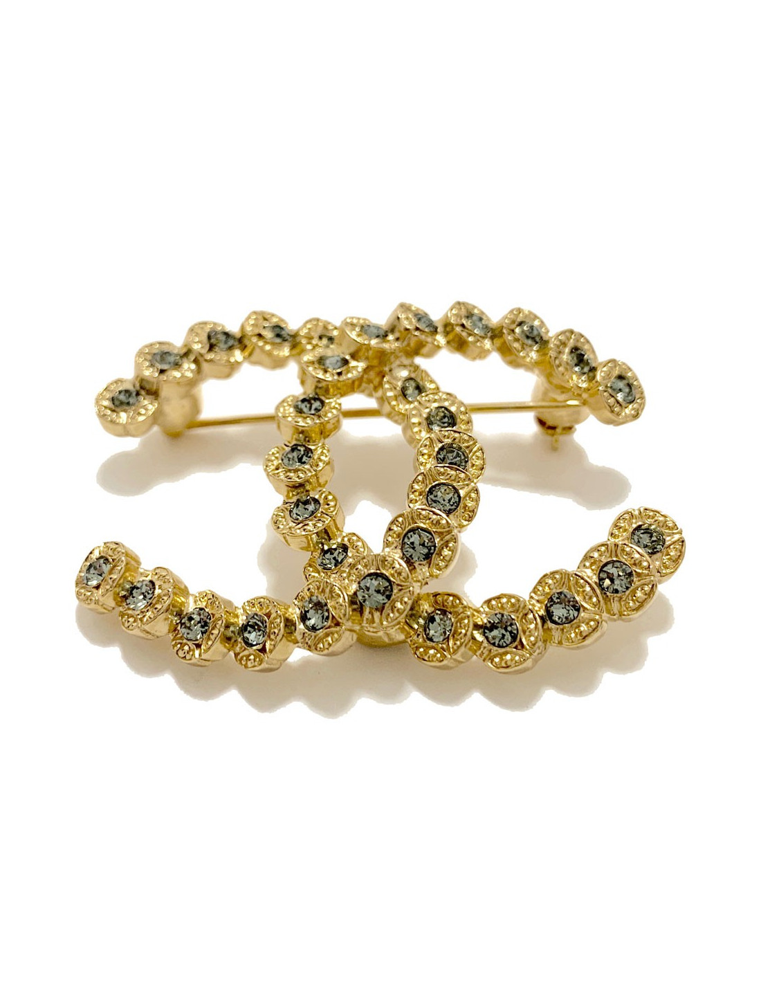 Superbe bijou de la Maison CHANEL, broche CC en métal doré sertie de strass ronds de couleur grise. Vous pouvez l'accrocher à votre veste, votre t-shirt, sur un chapeau ou une écharpe.