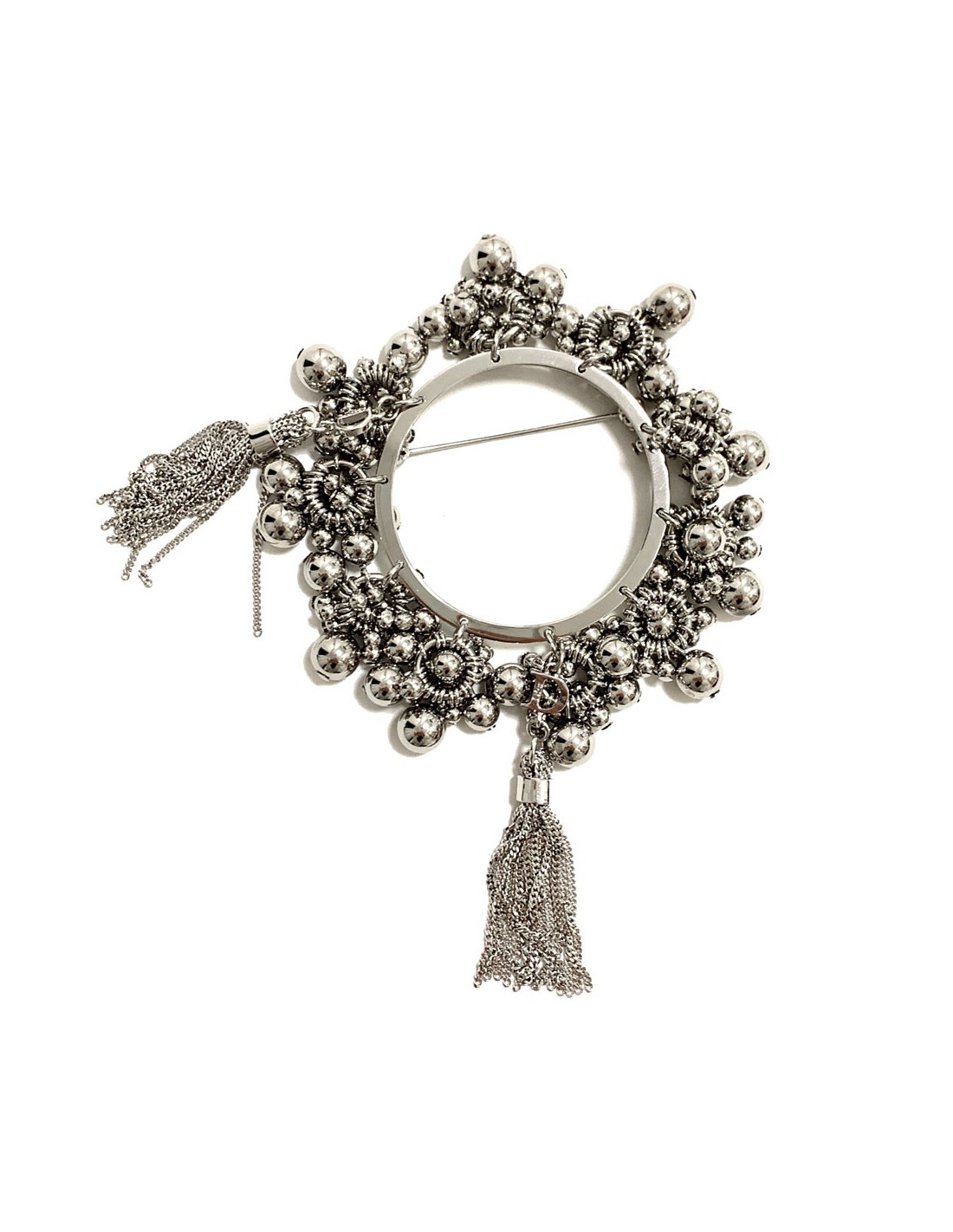 Très jolie broche de la Maison DIOR, ronde avec de petites boules argentées et des chaines argentées tout autour. Elle donnera du pep's à vos tenues.