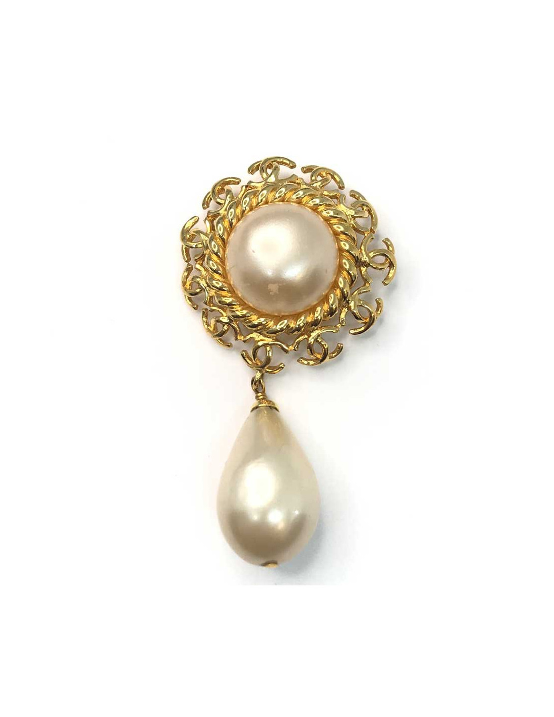 La broche représente une boule nacrée entourée d'une frise de CC en métal doré à l'or fin. Elle laisse suspendre une grosse perle nacrée. A porter par exemple sur un pull, au col de votre chemisier ou encore sur votre veste pour une petite touche vintage. Les bijoux vintage Chanel sont très recherchés en ce moment, c’est le moment d’acquérir le vôtre.