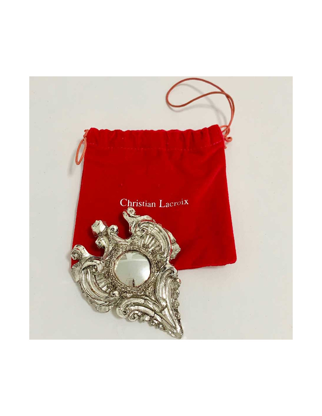 Ravissante broche Christian Lacroix, forme gothique, en métal avec un miroir au centre. Au dos elle est gravée Noël 2007 avec le stamp de la marque. Elle peut aussi être mis en pendentif avec son crochet. Elle est en très bon état.