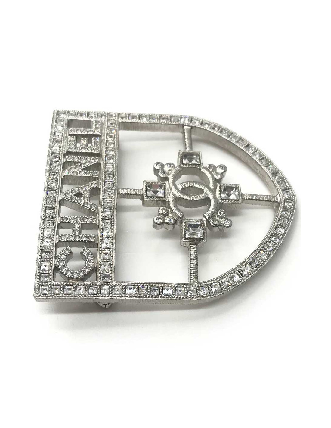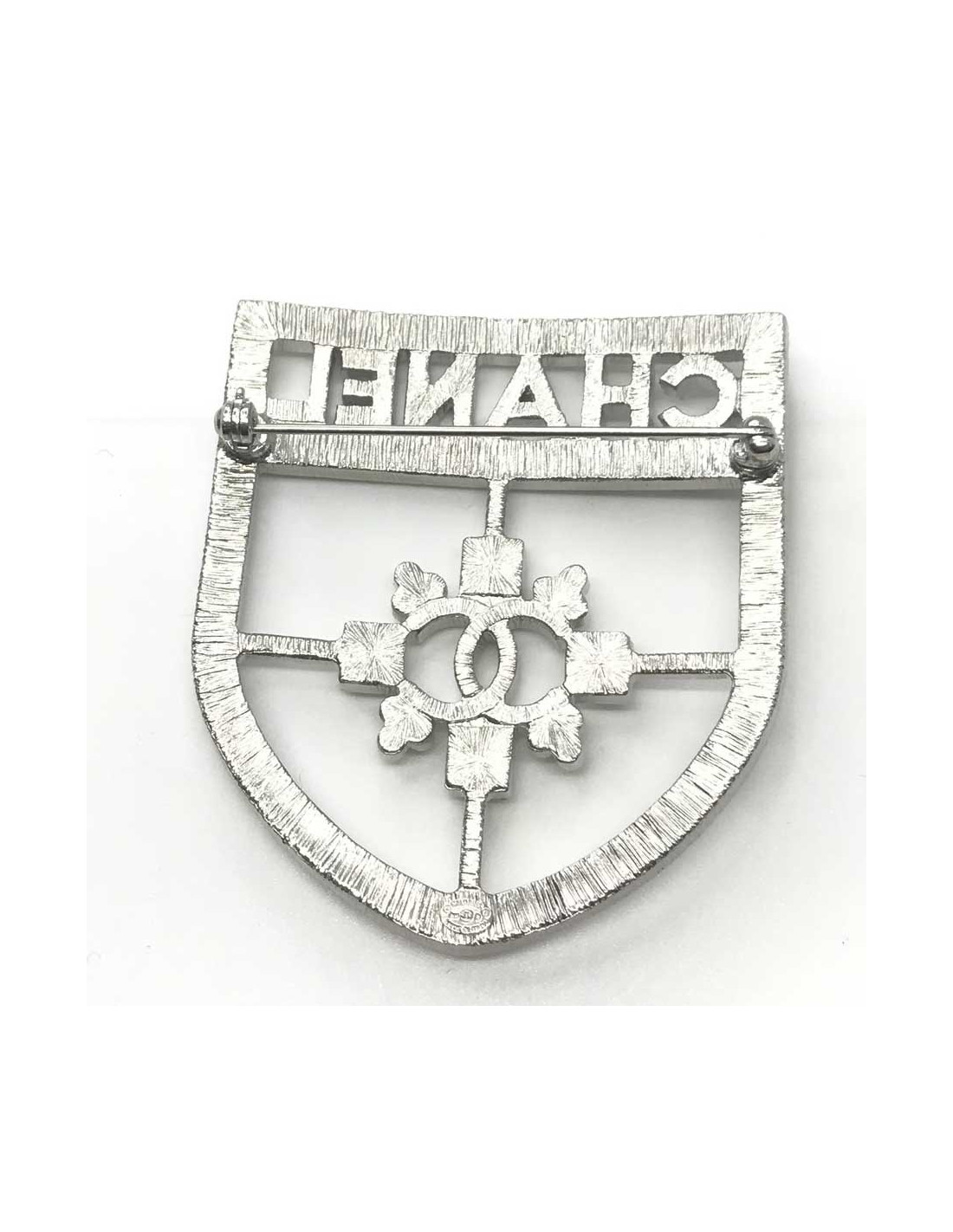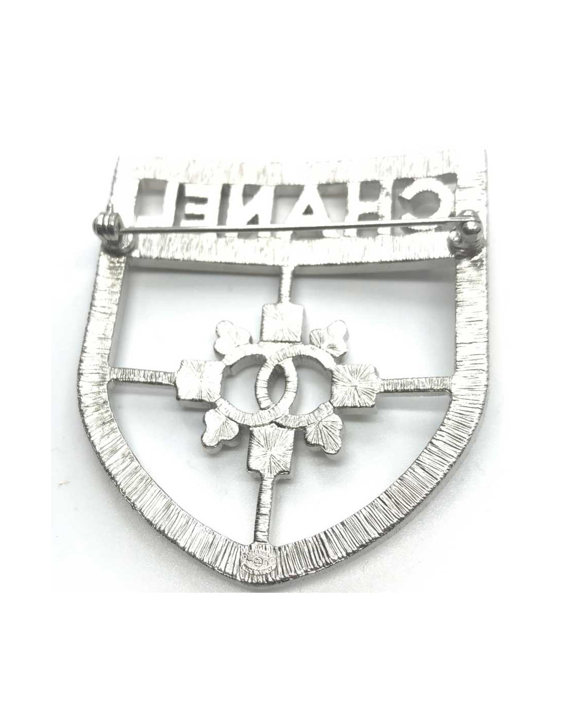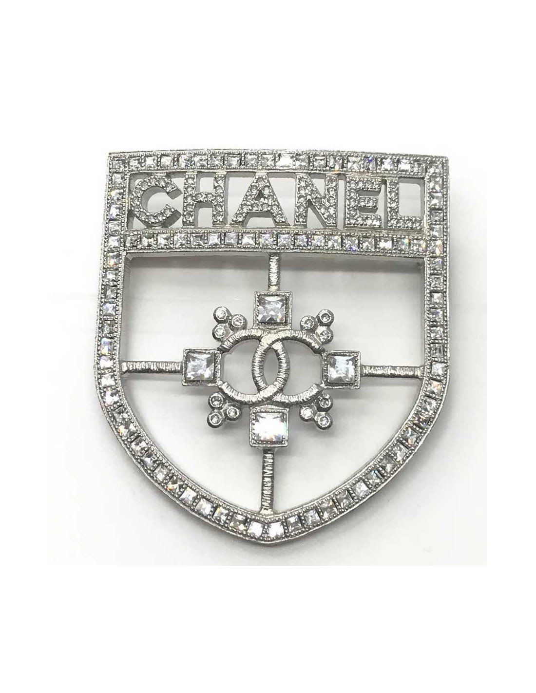 La broche est issue de la Maison CHANEL. En métal argenté, elle est entièrement sertie de strass et représente un écusson avec l'inscription CHANEL en haut de la broche, et l'emblème CC de la marque en son centre. Présence de la pastille Chanel à l’arrière de la broche.