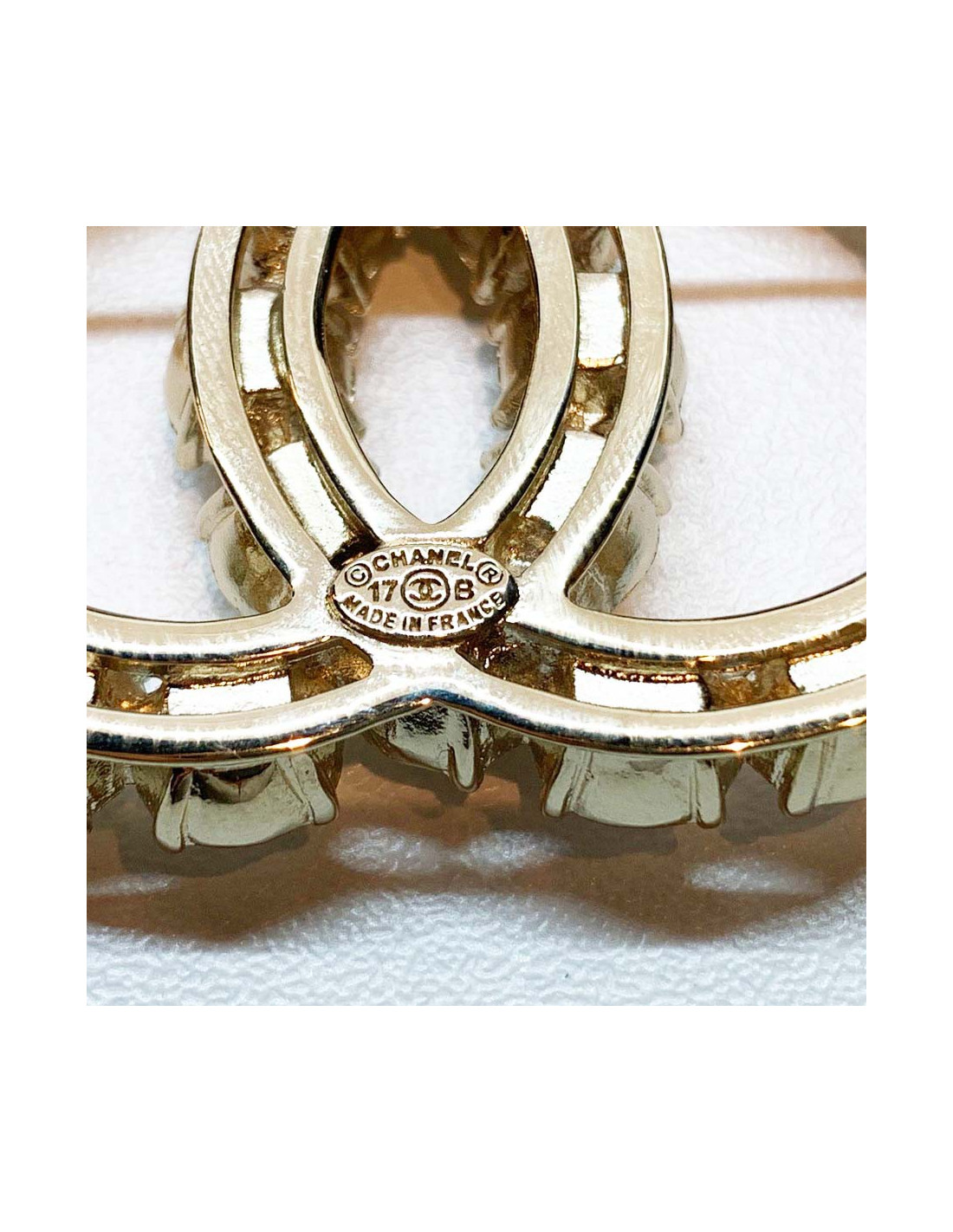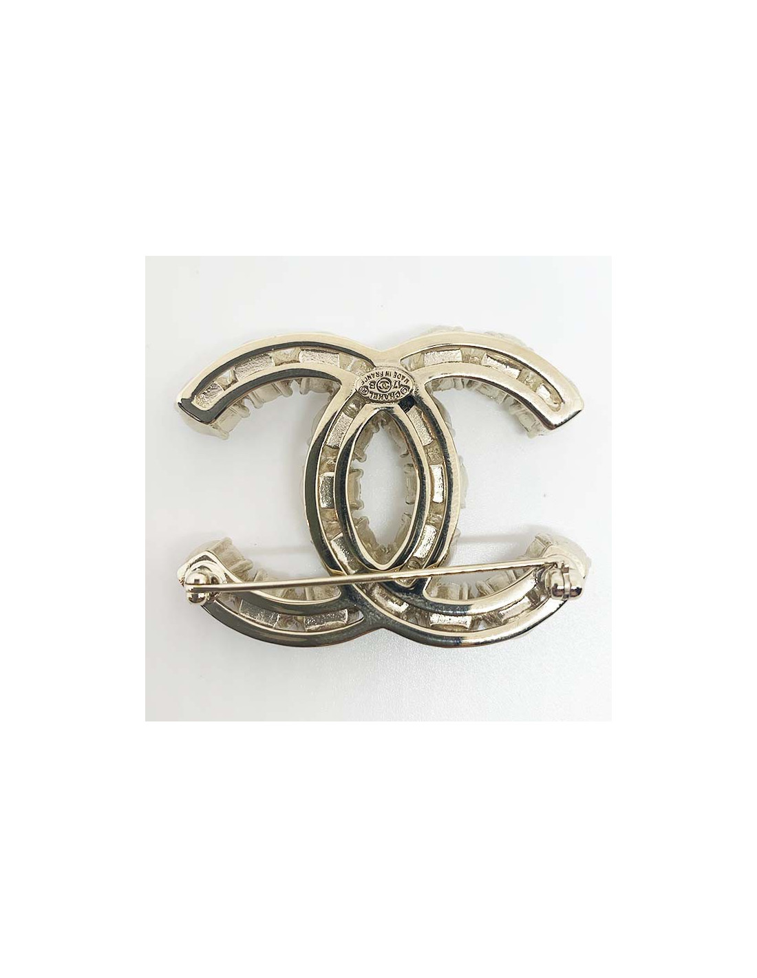La broche est issue de la Maison CHANEL et représente l'emblème CC de la marque. Le premier C étant composé de perles nacrées et le deuxième de brillants roses pâles.