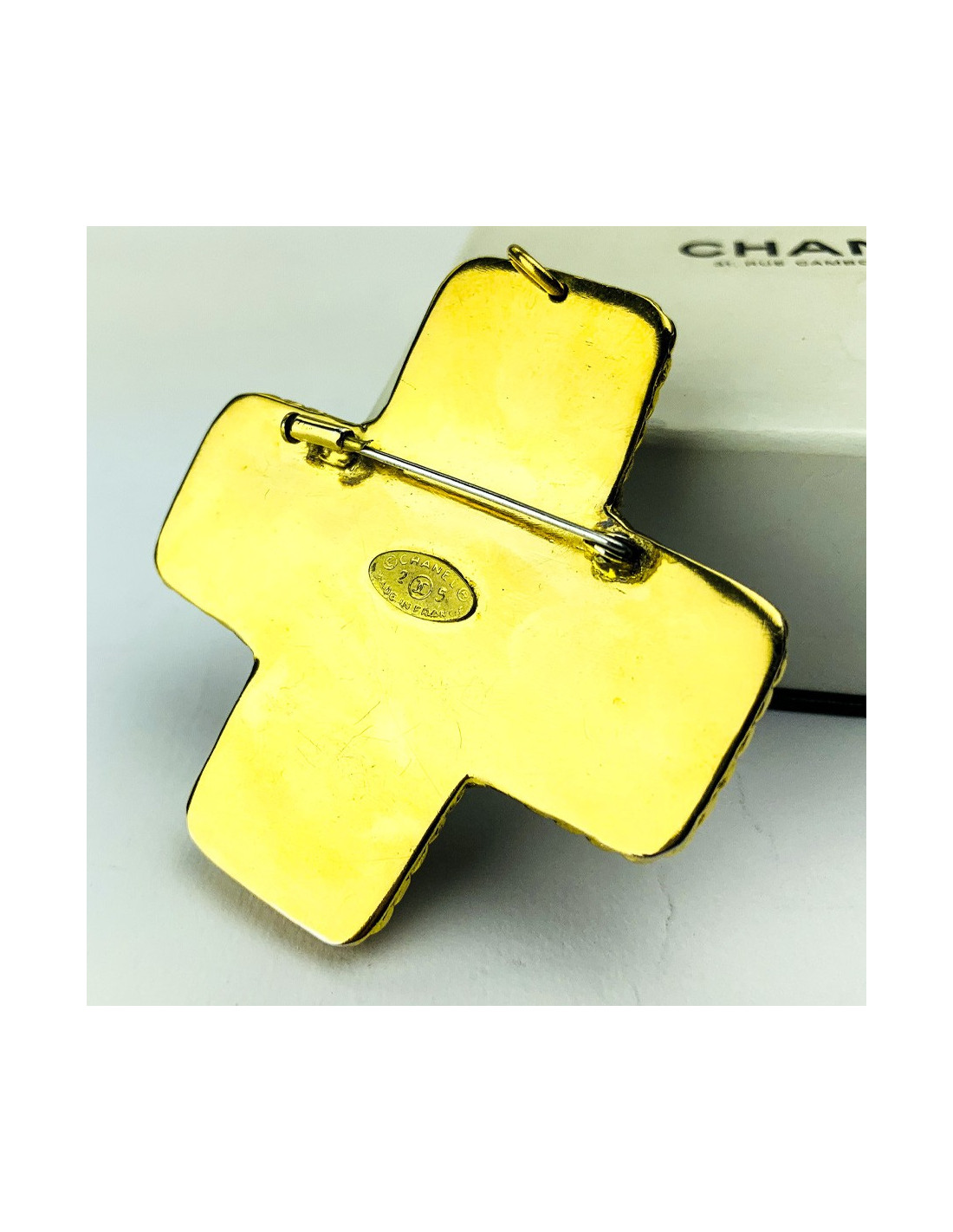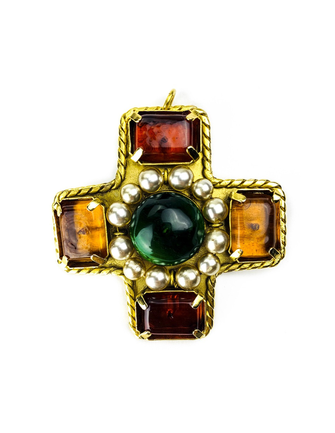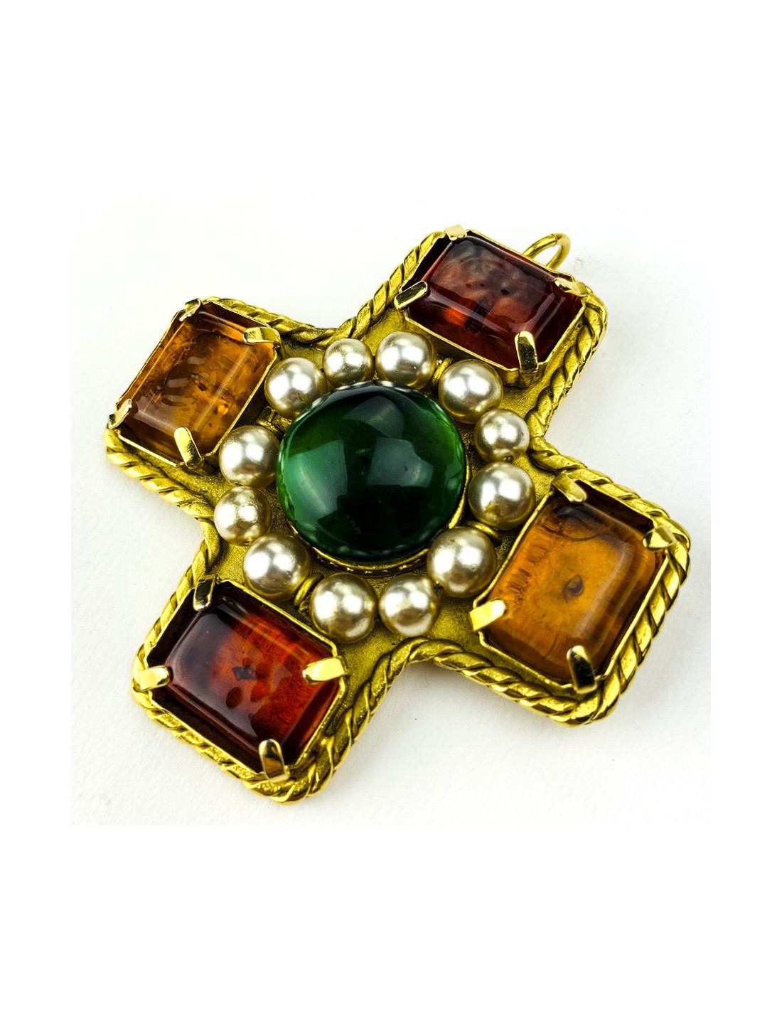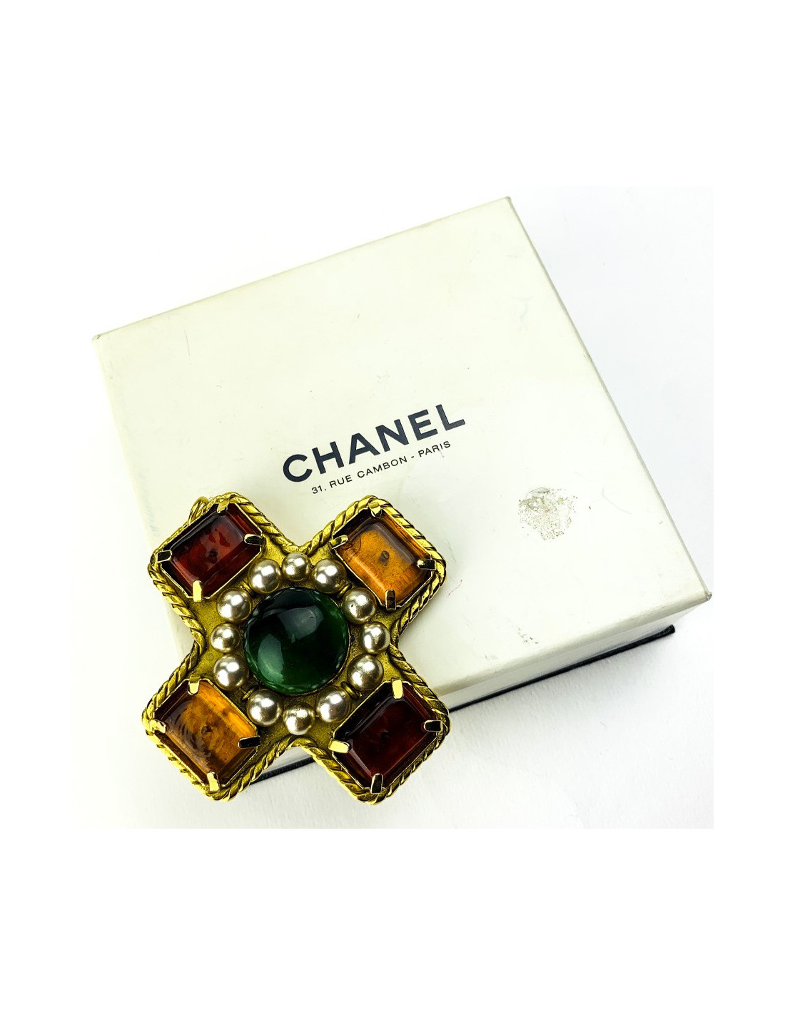 La broche est un bijou CHANEL. Elle représente une croix avec sur chaque branche un rectangle de pâte de verre dans les tons orange. En son centre nous découvrons une boule de pâte de verre verte encerclée de perles.