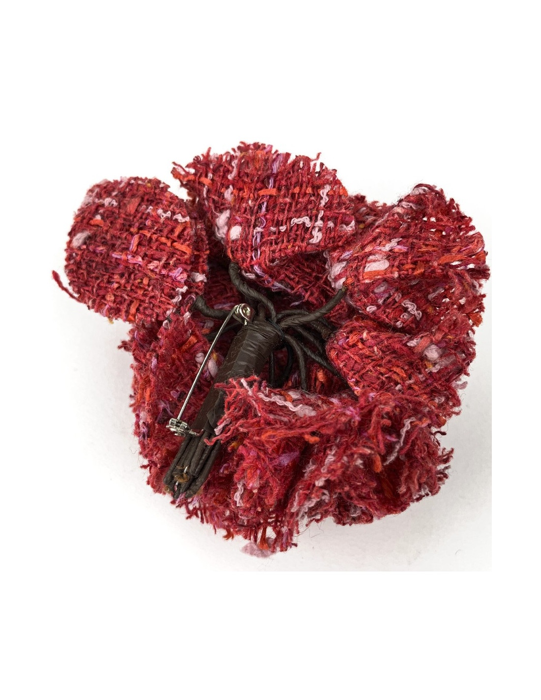 La broche est de la Maison CHANEL. Elle représente un camélia en tweed rouge, orange, rose.
