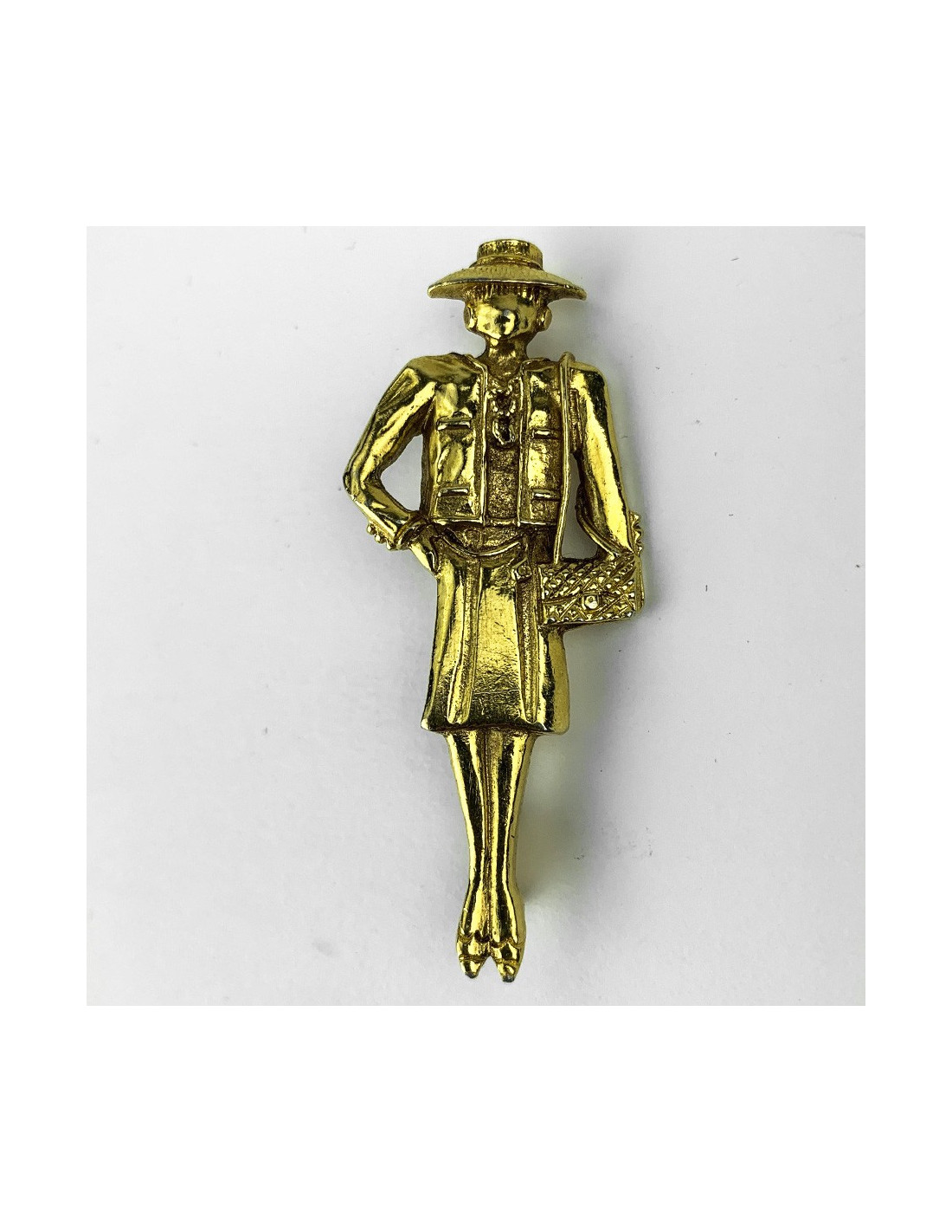 La broche est un bijou signé CHANEL. Elle représente Gabrielle Chanel, dite Coco, en tailleur, chapeau, collier, chaussures et sac matelassé Chanel.