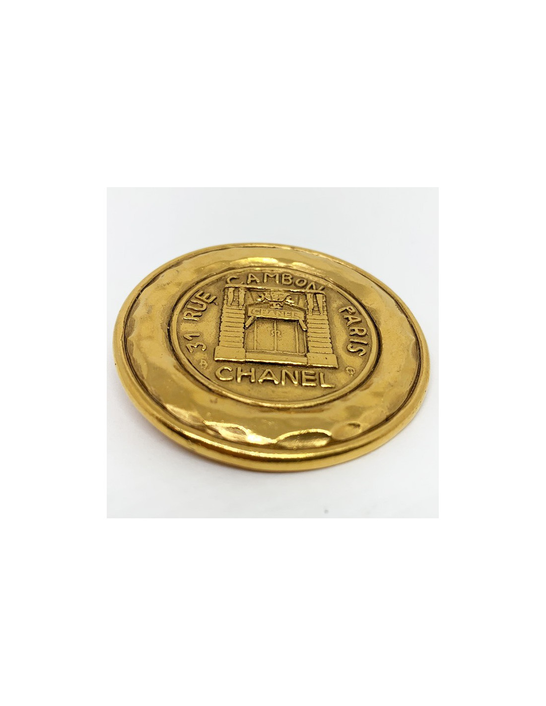 La broche est une pièce vintage de la Maison CHANEL. Elle est de forme ronde en métal doré à l'or fin et au contour martelé. Au centre de la broche, nous découvrons gravé dans le métal, le dessin de la devanture du magasin CHANEL, ainsi que la mention de sa célèbre adresse : 31 Rue Cambon Paris.