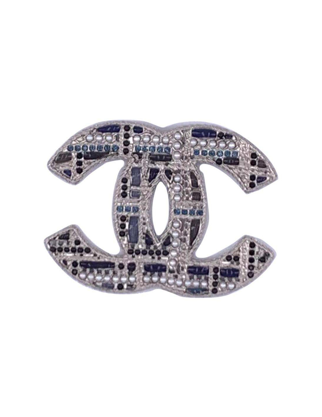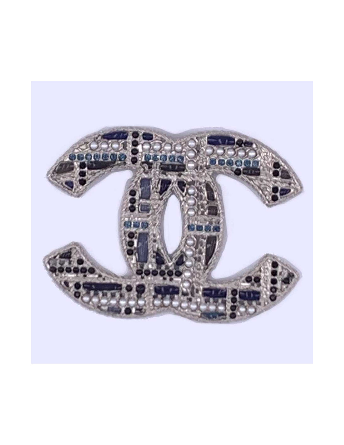 La broche est superbe. Le CC de la marque Chanel est ici en version grand modèle, en métal argentée comme base, sur lequel viennent s'incruster petites perles nacrées, noires, et des strass bleu verts.