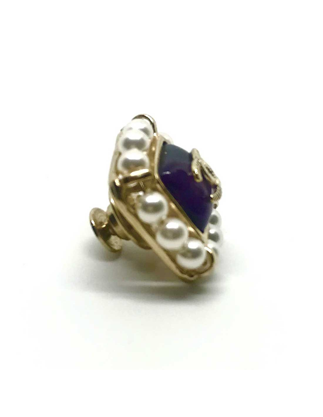 Le pin's est de la Maison CHANEL. De forme carrée et sur base de métal doré à l'or fin, repose en son centre un cabochon de résine améthyste sur lequel repose l'emblème de la marque CC. Tout sont contour est serti de perles nacrées.