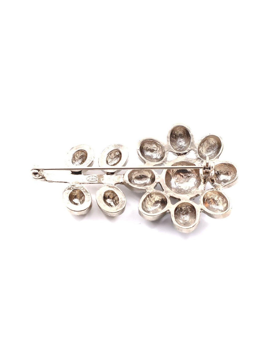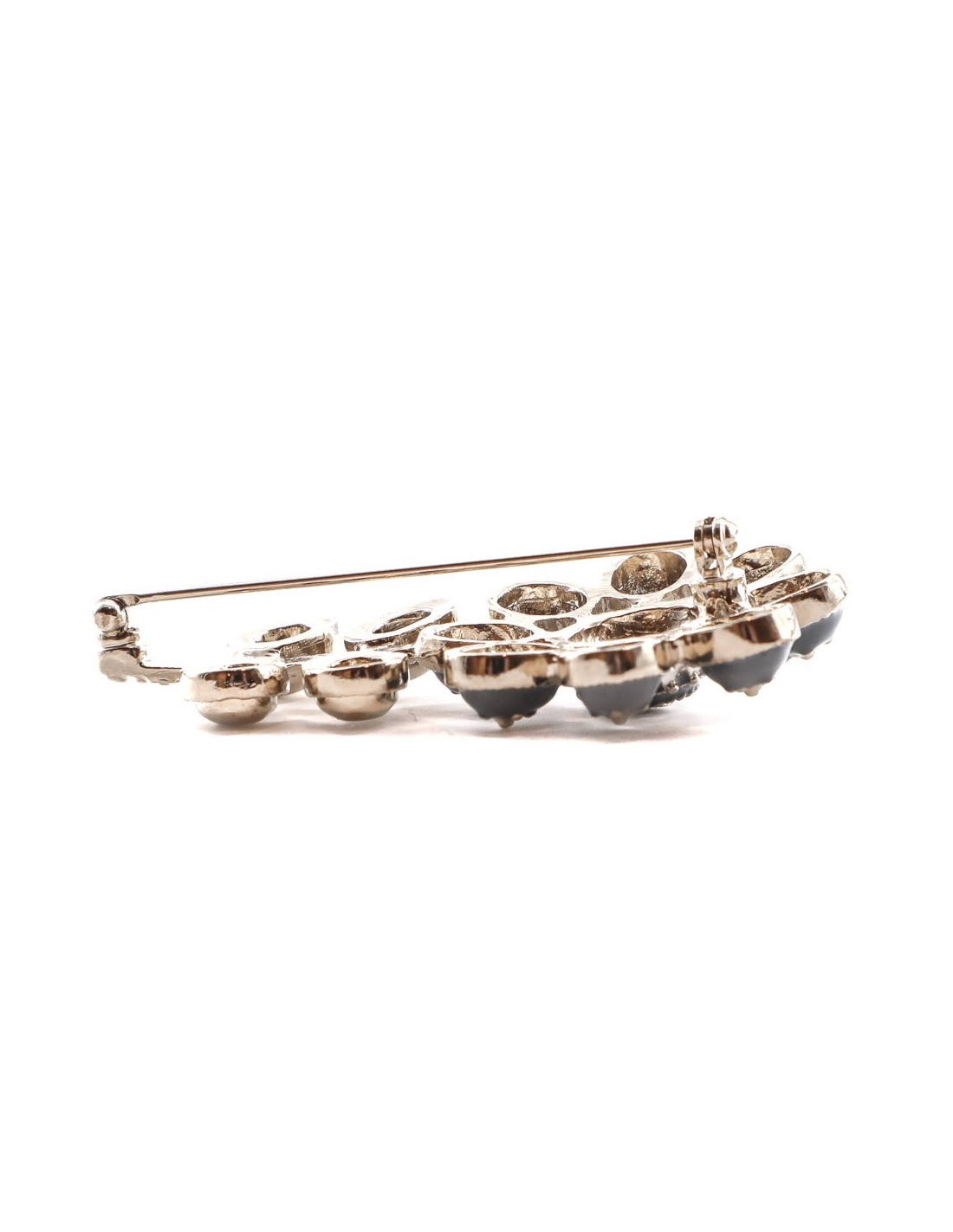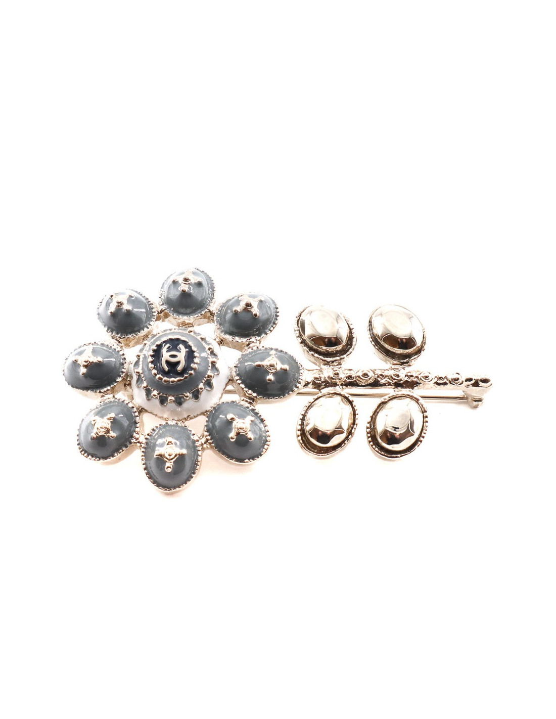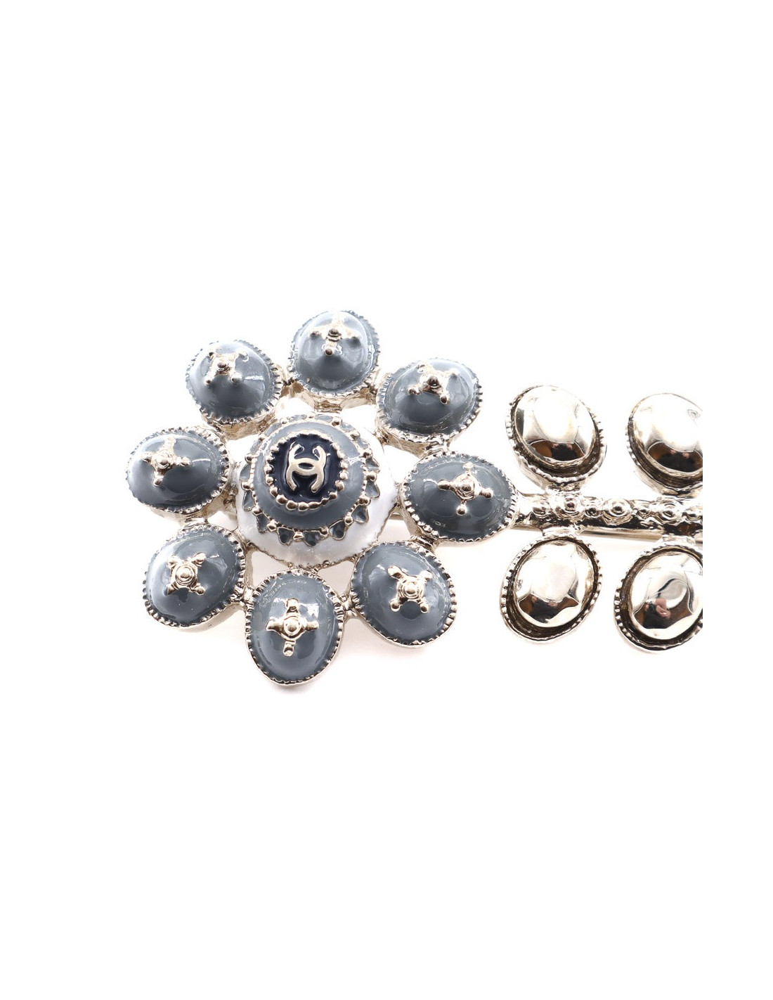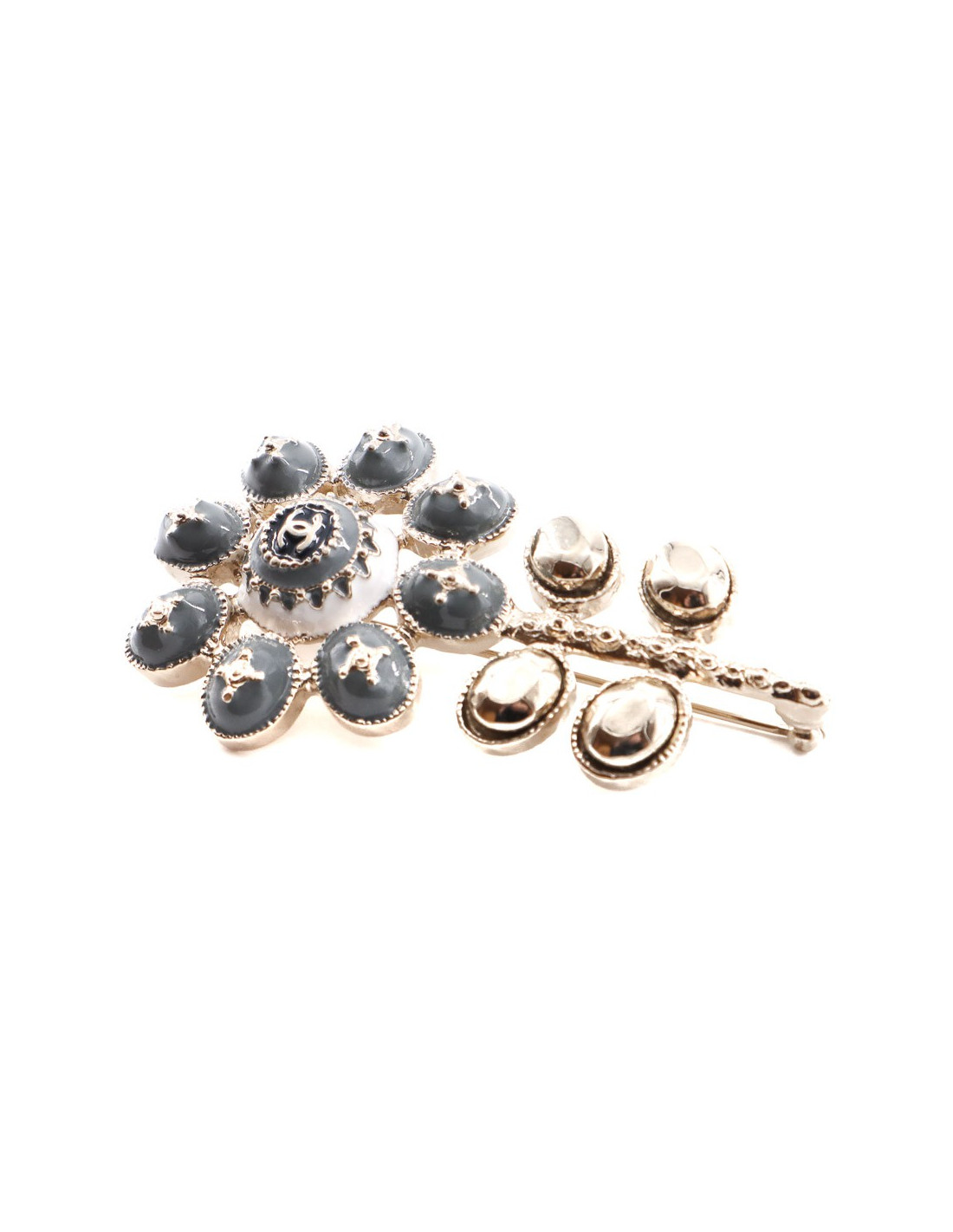 Le bijou est de la Maison CHANEL. Il représente une fleur, supposément une marguerite dont la tige est en métal doré à l'or fin et les pétales d'une couleur gris/bleu superbe. Le coeur de la fleur arbore l'emblème CC de la marque sur fond noir émaillé.