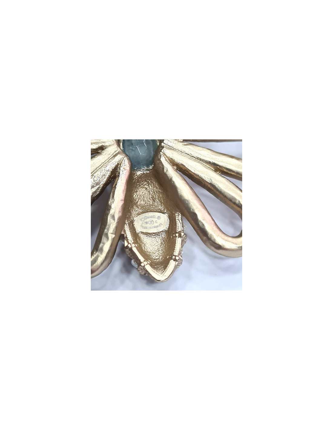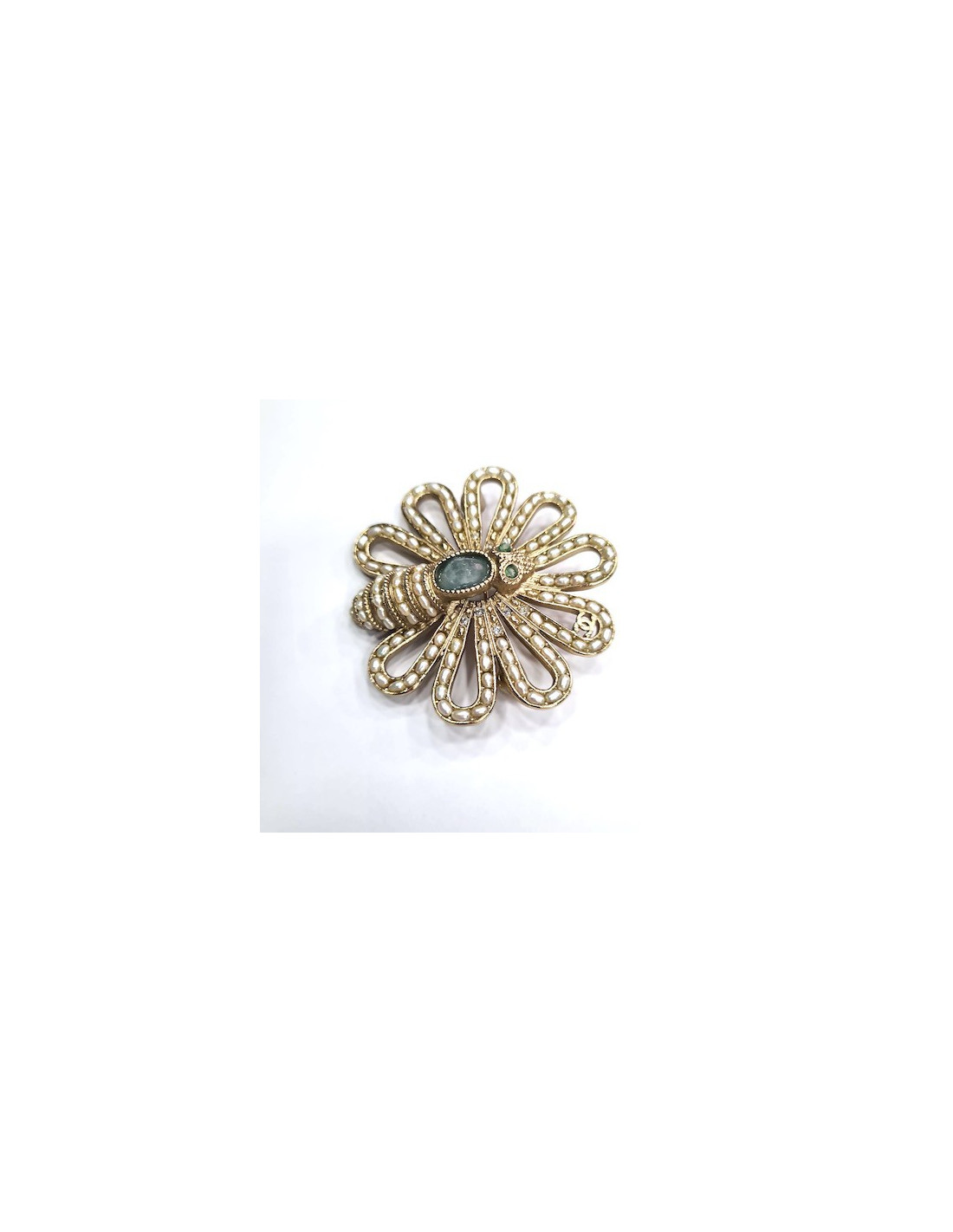 La broche est un bijou magnifique de la Maison CHANEL. Sur une base de métal doré à l'or fin se dessine un papillon dont les ailes sont serties d'une succession de perles nacrées et dont le corps et les yeux sont incarnés par du quartz vert pâle. Une des ailes perlée comporte le CC de la marque. Toute l'élégance CHANEL se retrouve dans cette broche d'un raffinement rare.