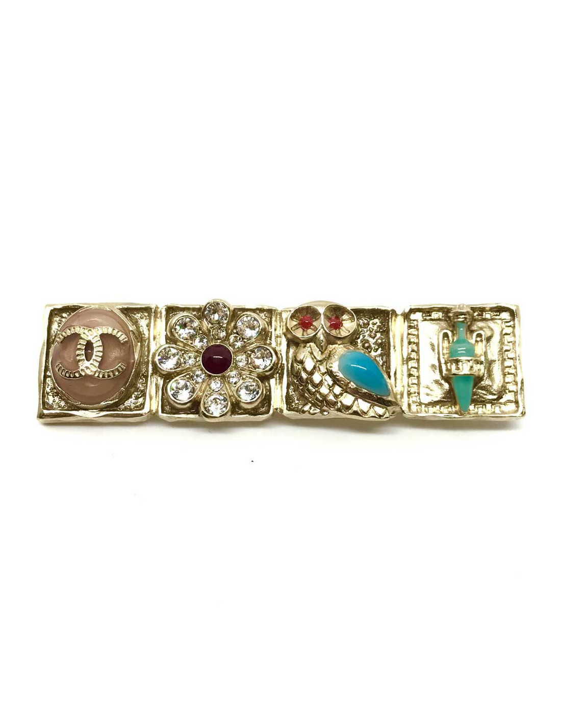 Superbe broche en forme de barrette de la Maison Chanel. On y aperçoit une perle ovale vieux rose sur laquelle est apposée un CC doré, puis une fleur en strass, un ravissant hibou aux yeux rouges et aile turquoise en résine et enfin une amphore en résine vert céladon. Elle est très raffinée, elle se porte aisément sur à peu près tout : du tee-shirt à la veste, en passant par le bonnet ou la casquette et nouvelle tendance dans vos cheveux en le fixant avec un élastique.