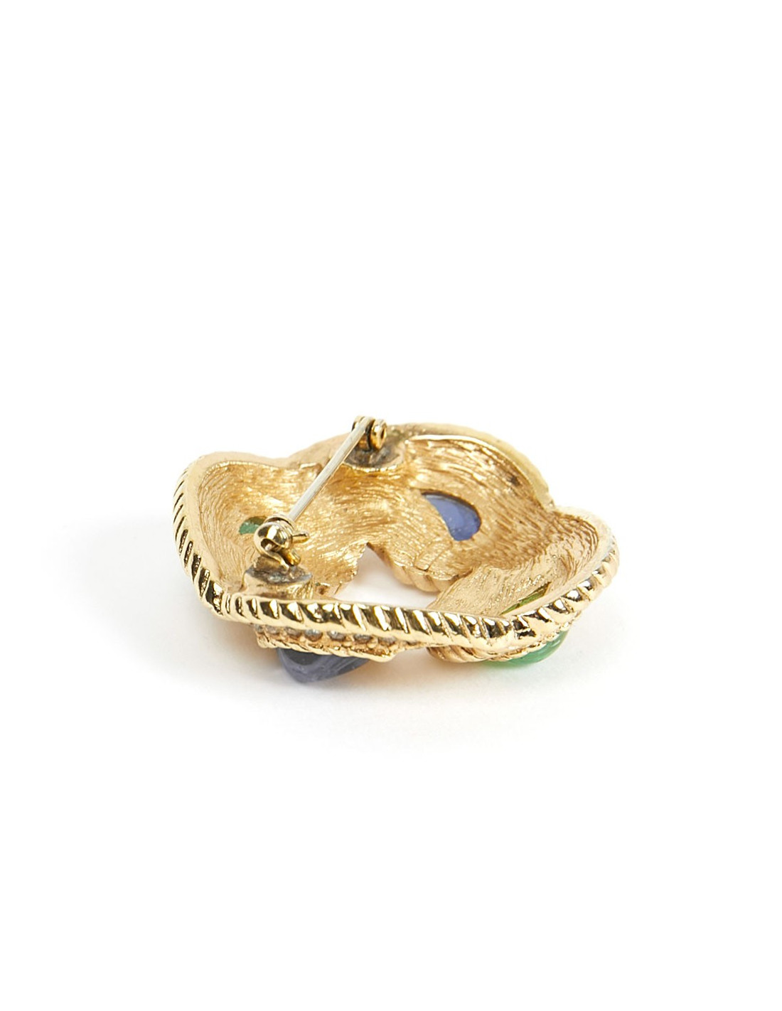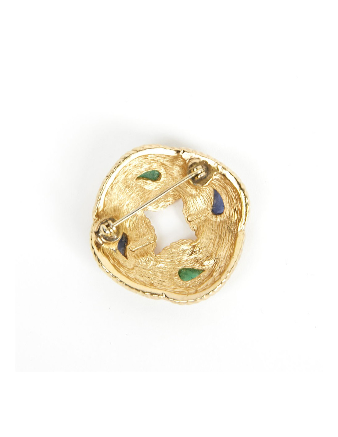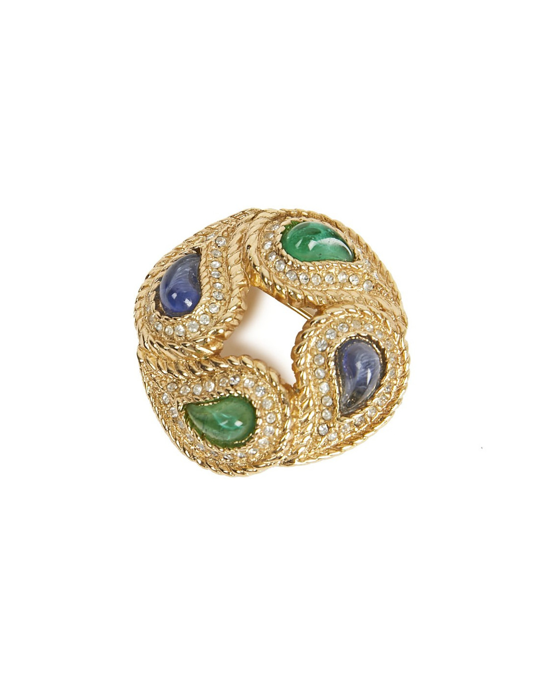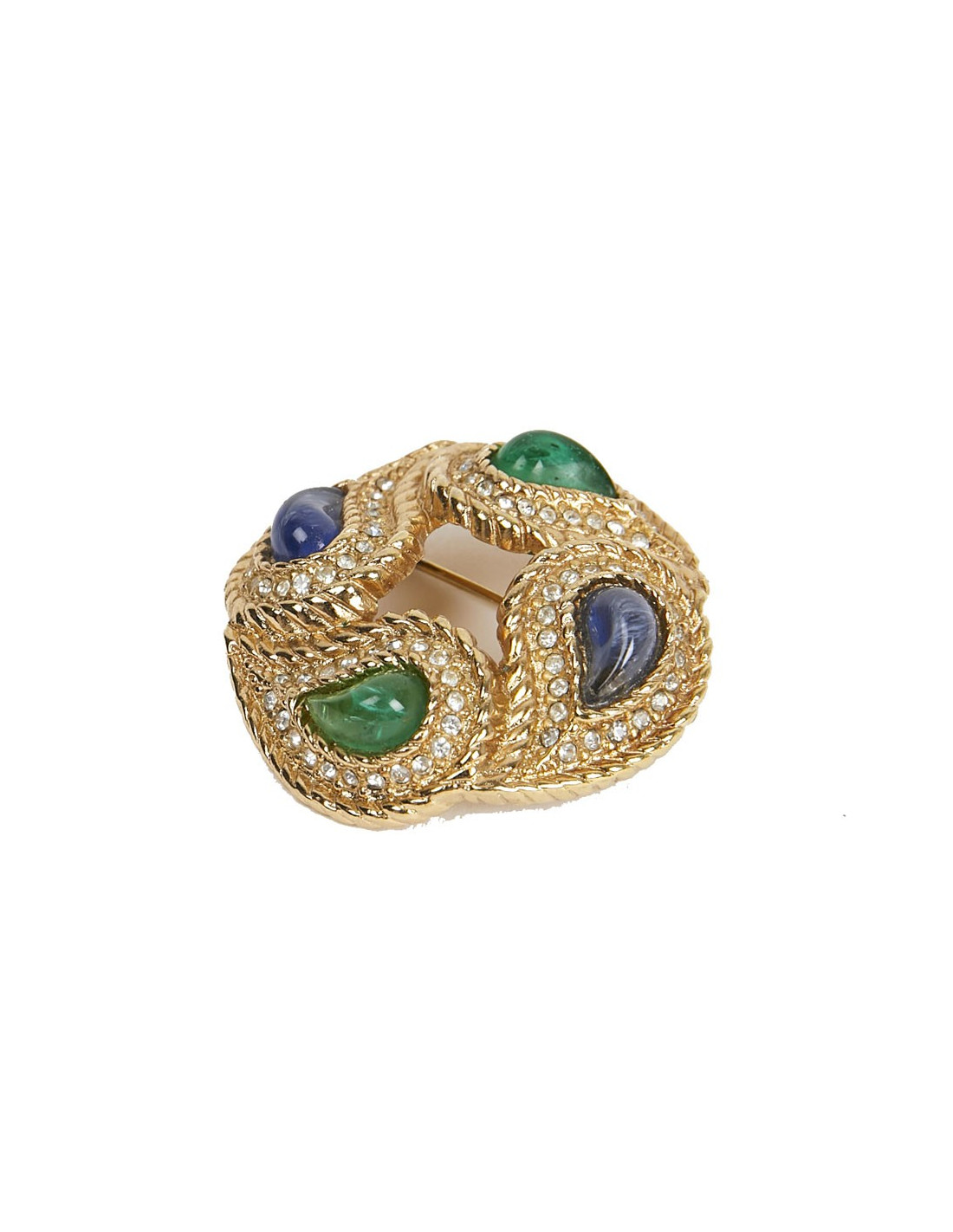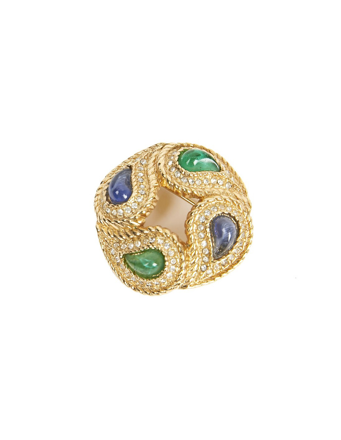 Lumineuse broche vintage, avec strass et pate de verre translucide sur métal doré.