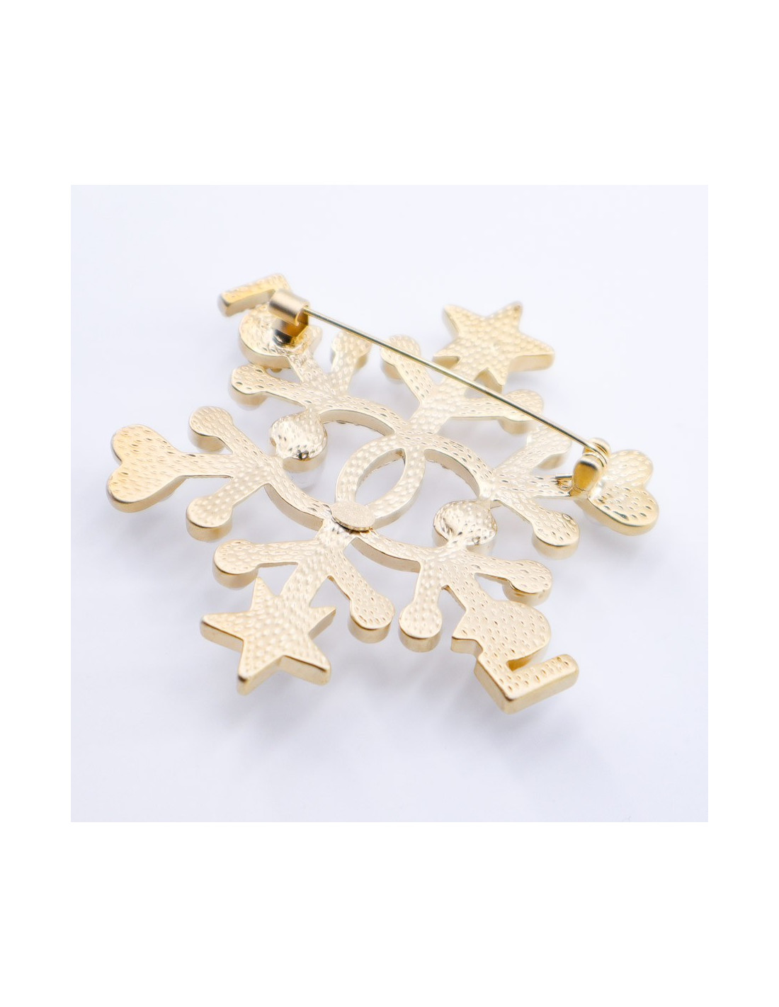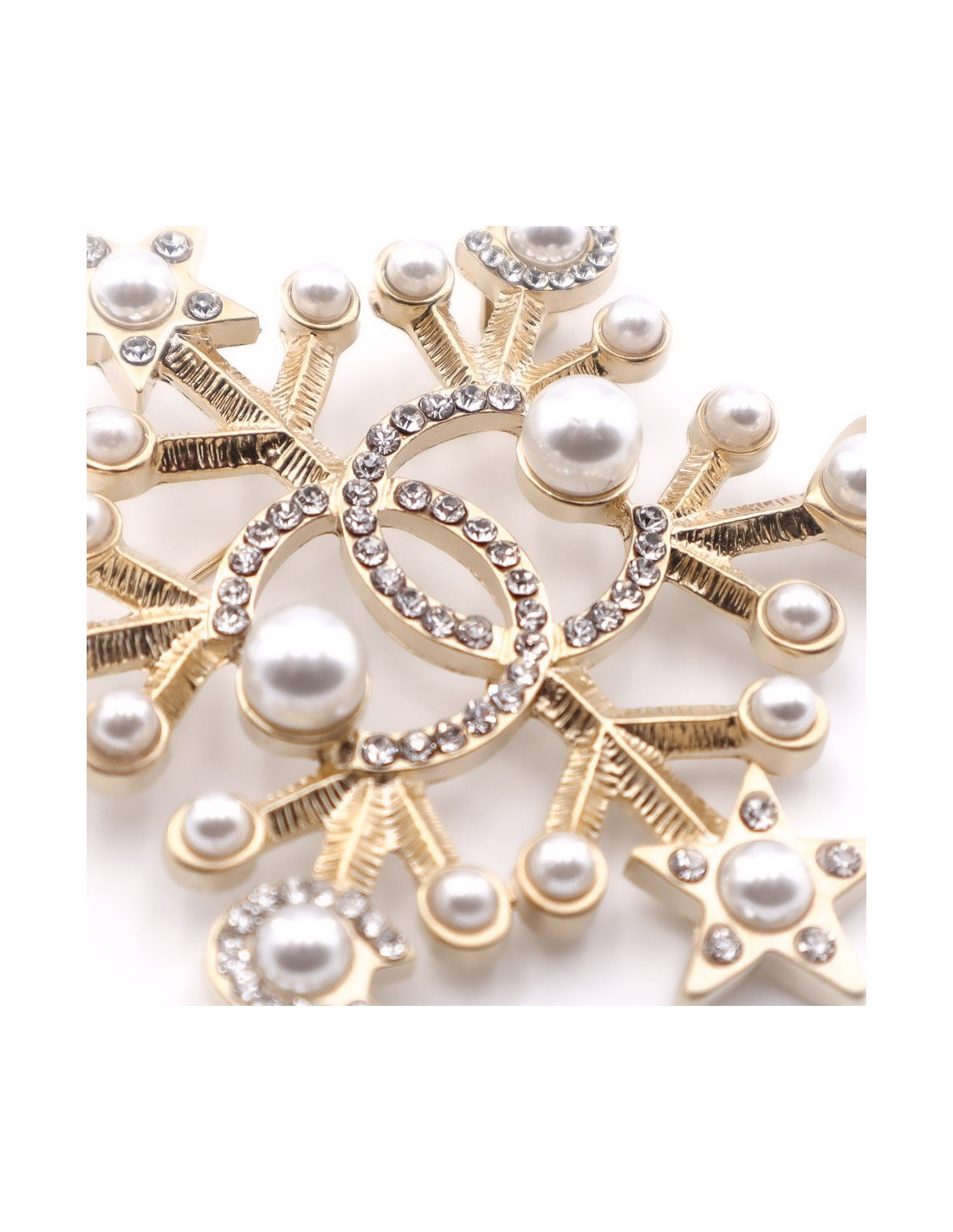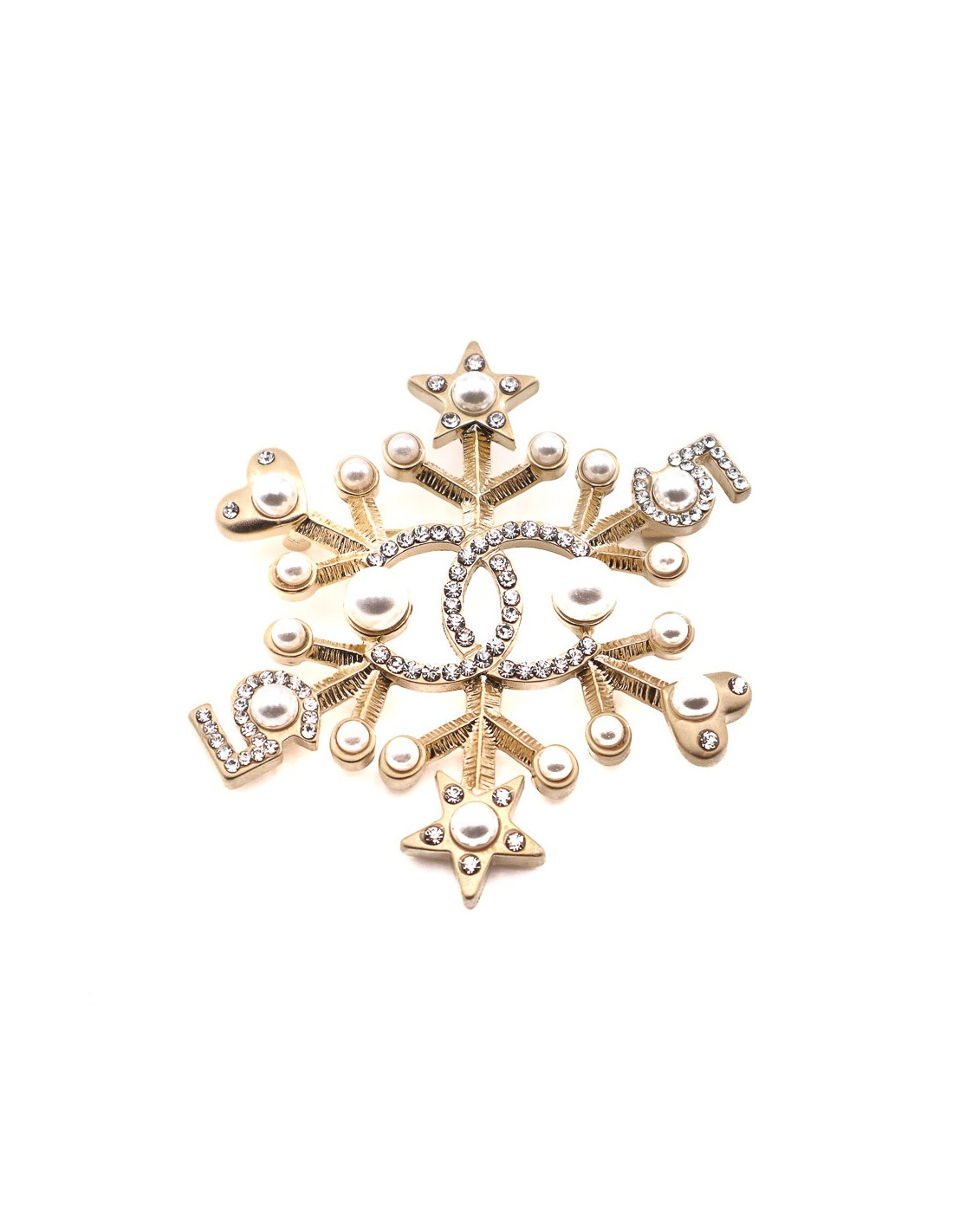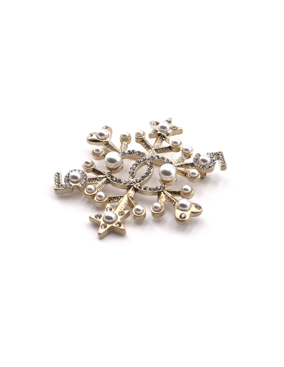 Superbe bijou de la Maison CHANEL. Une broche en forme d’étoile de neige sur une base en métal doré à l'or fin, sur laquelle sont sertis perles nacrées et strass. Chaque extrémité de la broche se finit par un motif de petite étoile puis de petit coeur. Au centre de la broche, un CC important serti de strass.
