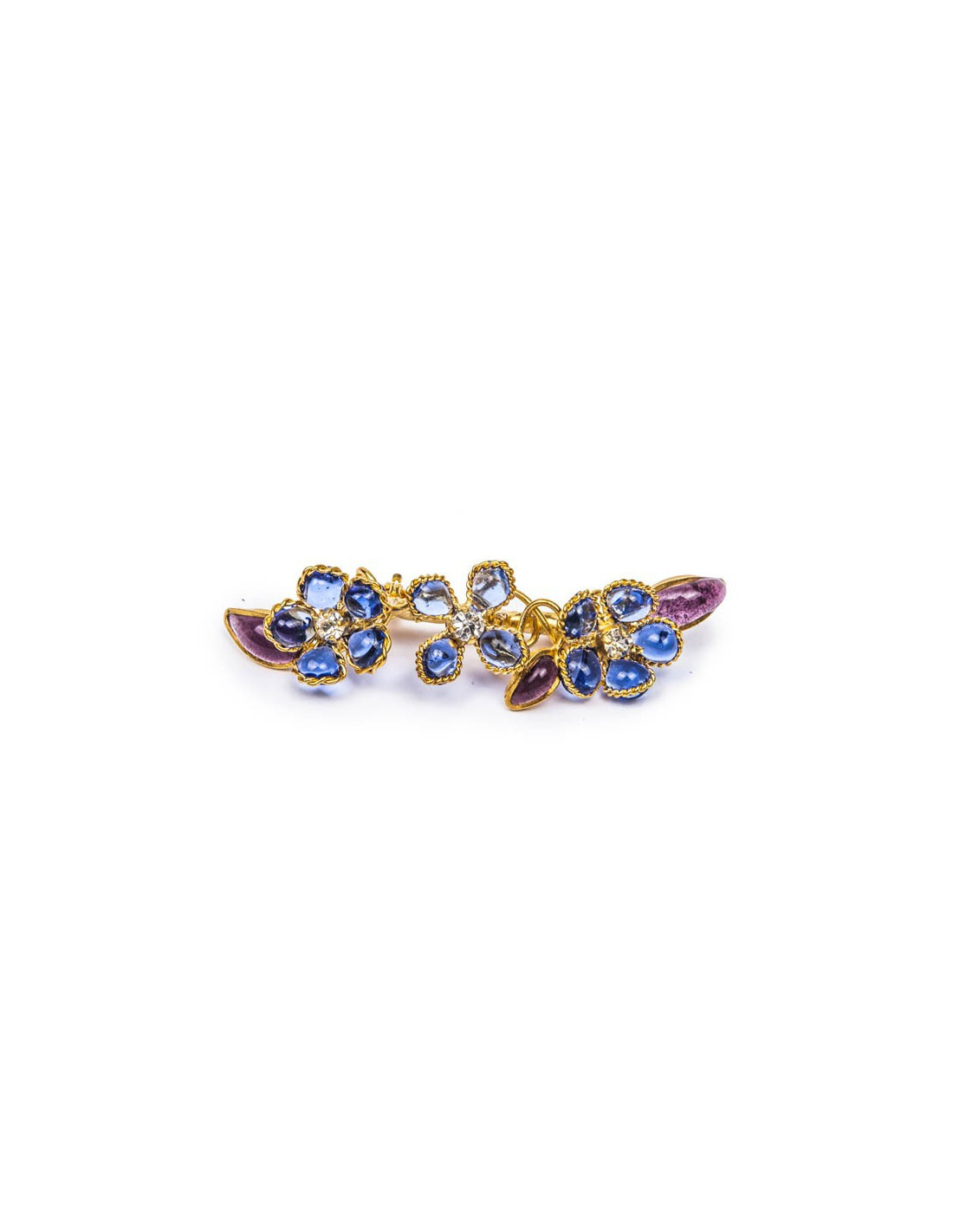 Broche fleurettes réalisée à partir de 2 fils entrelacés très fins, Marguerite de Valois en métal doré. Elles sont en pâte de verre bleu saphir et améthyste avec au centre un brillant Swarovski. Bijou entièrement fabriqué à la main dans les ateliers de la marque.