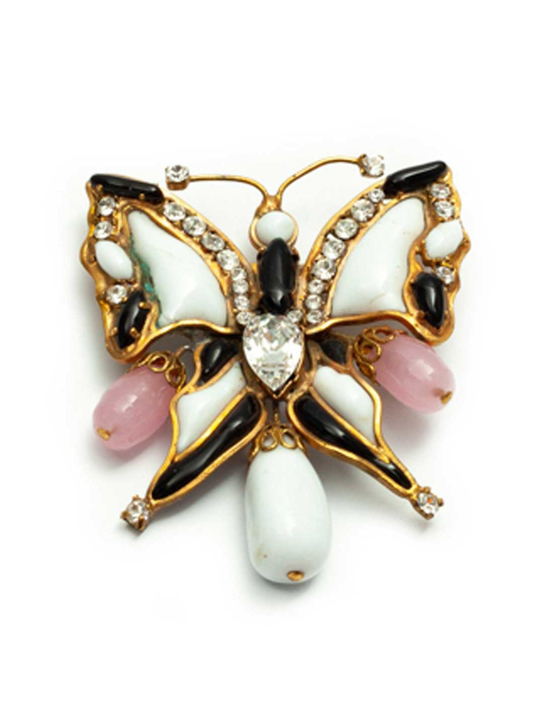 Magnifique broche papillon Marguerite de Valois Couture fabriquée en 2006. Monture en métal doré à l'or fin, en pâte de verre blanc, rose et noir. Jamais portée.