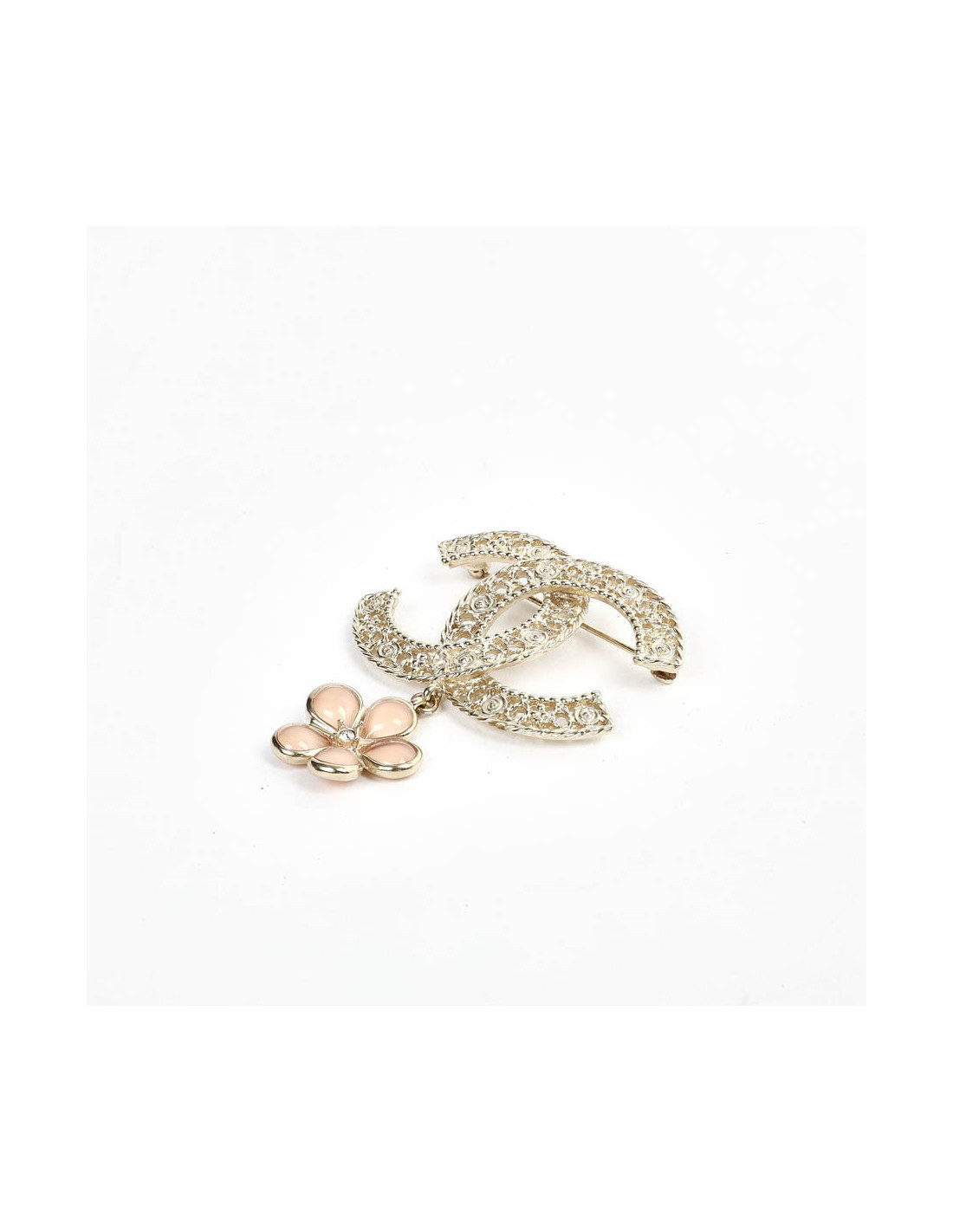 Broche CHANEL dble C et fleurette rose
