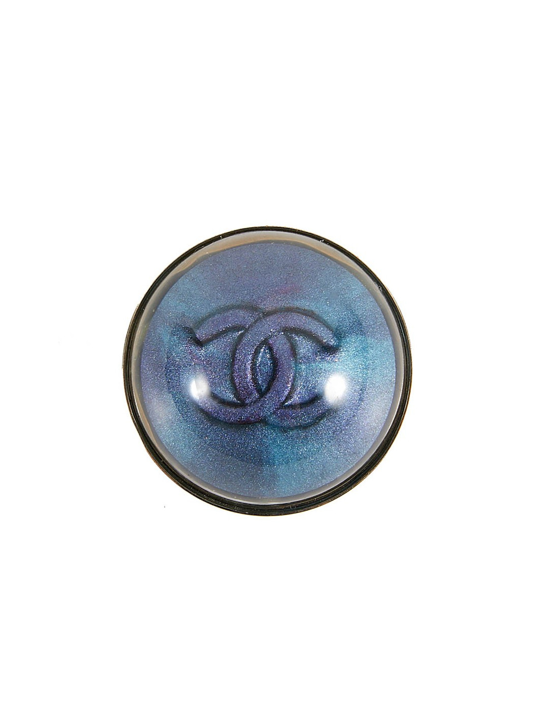 Broche en demi lune bleu dégradé avec un double C au centre. l'arrière est en métal argent.