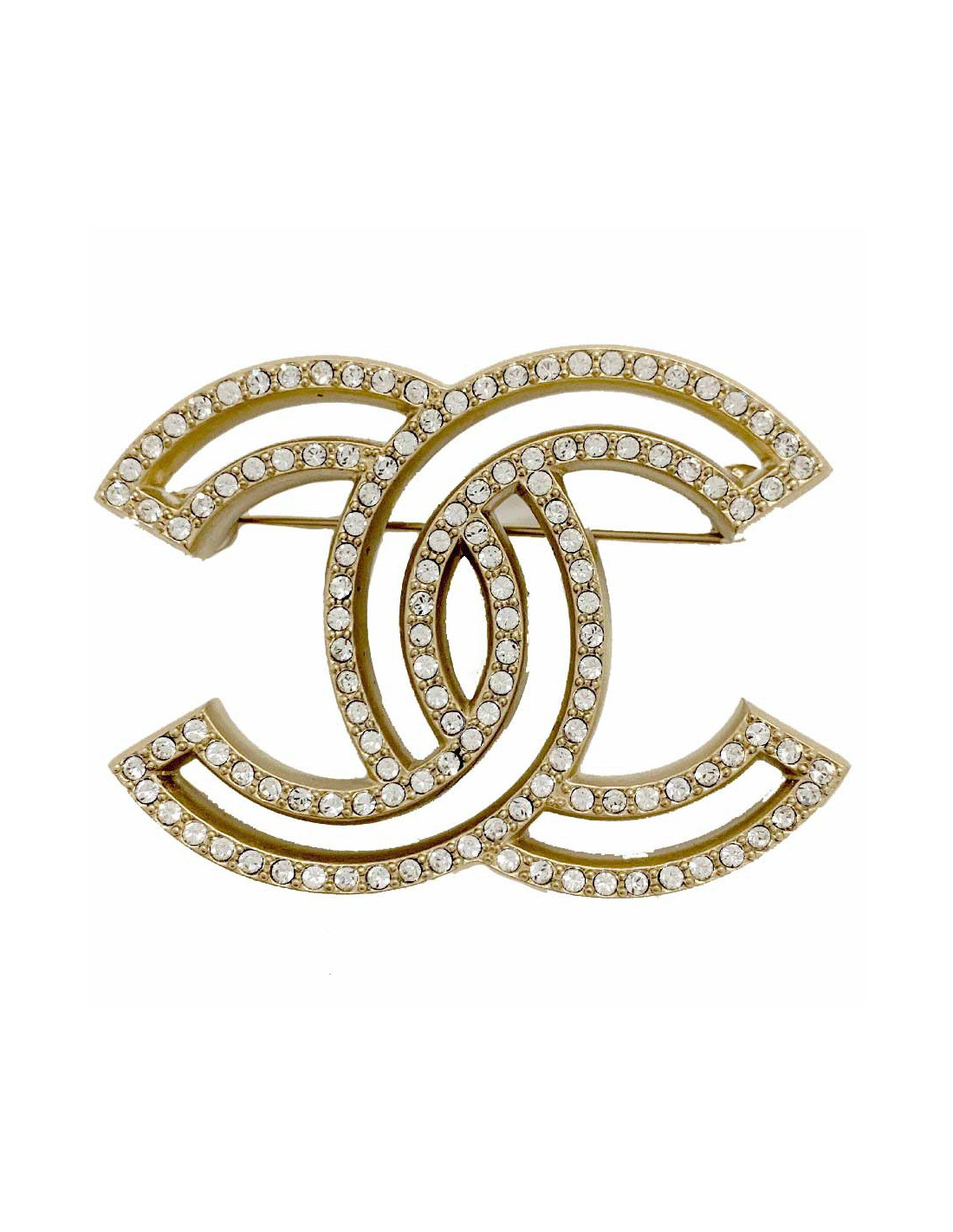 Superbe broche Chanel double C en métal doré mat serti de strass. Etat neuf. La pastille de la marque est présente à l’arrière du bijou.