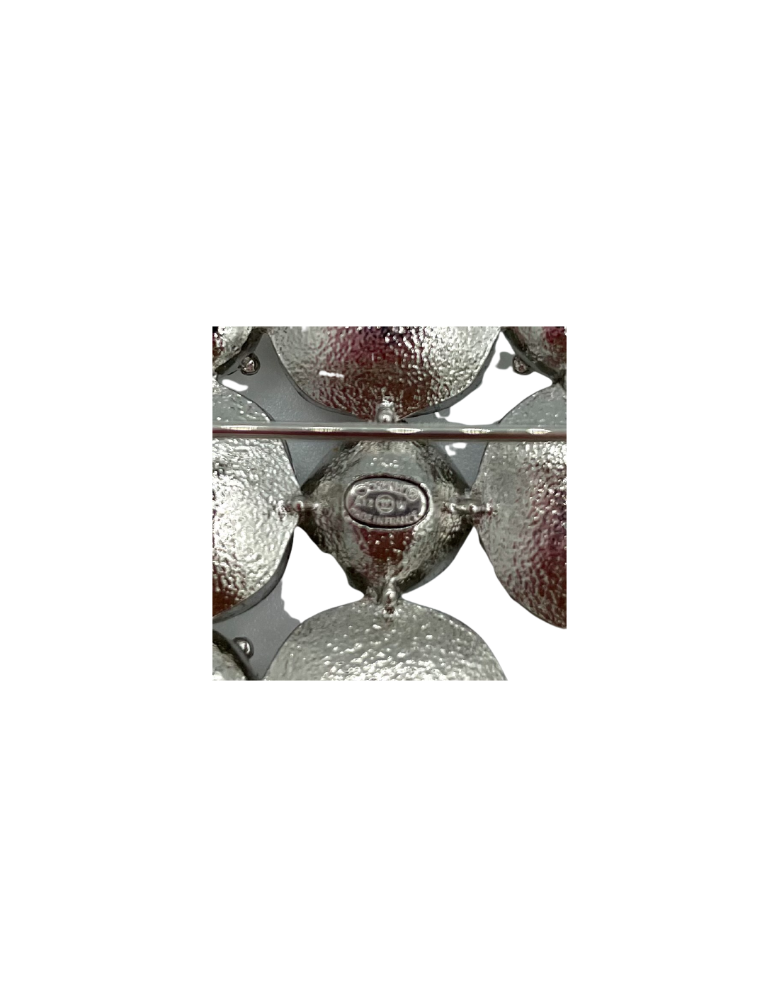 Derniers articles en stock BROCHES Broche CHANEL CC chaîne CHANEL 36144 550,00 € Broche CHANEL CC ruthénium Condition : très bon étatPays de fabrication : FranceMatière : métal argent et résineCouleur : argenté mat, blancDimensions : 5 x 4 cmBijouterie : métal argent ruthéniumStamp : ouiAnnée : 2022Détails : résine blanche et métal argent mat entrelacés pour rappeler les chaînes des iconiques bandoulières des sacs Chanel. Livrée dans... Ajouter au panier