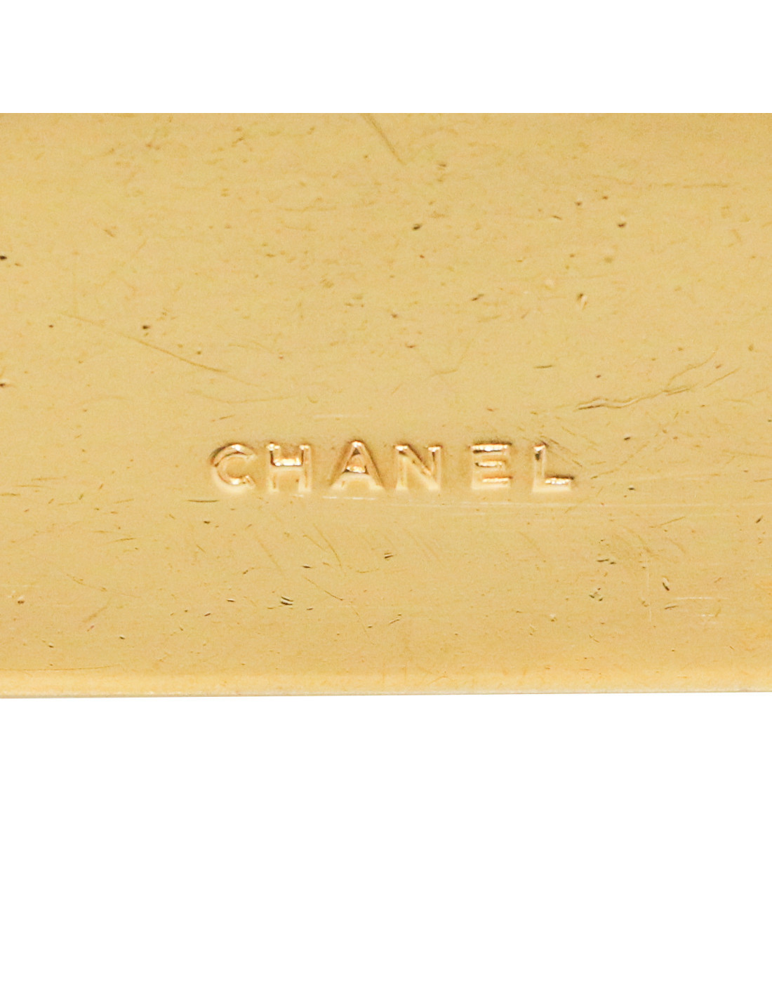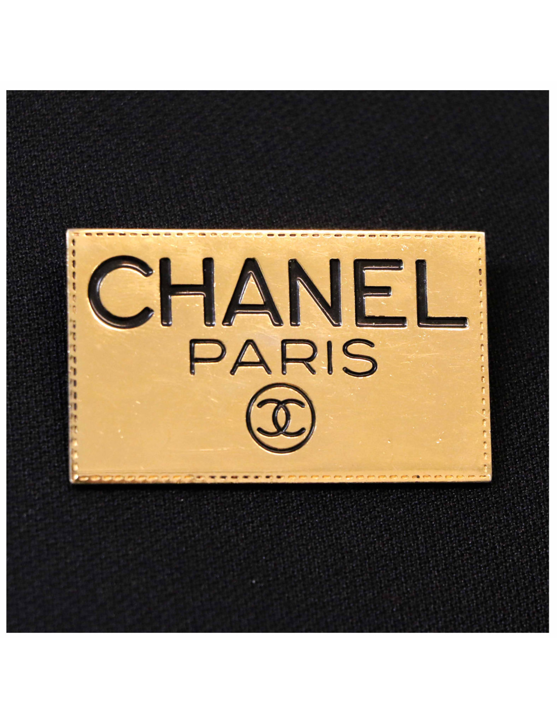 Détails : broche plaque rectangulaire "CHANEL PARIS" gansée d'un effet surpiqure qui nous rappelle les sacs. Micro rayures sur la dorure. La tige est légèrement déformée.