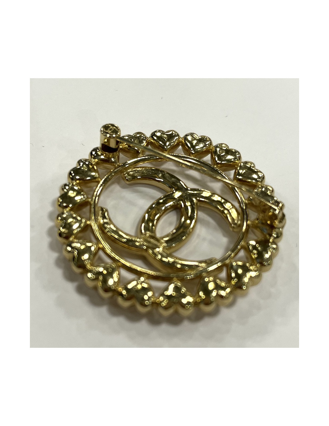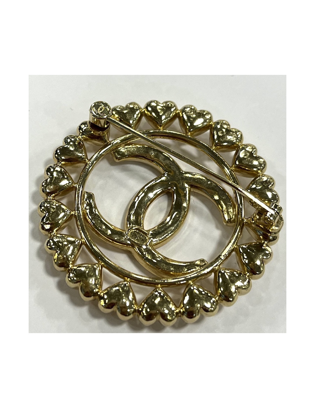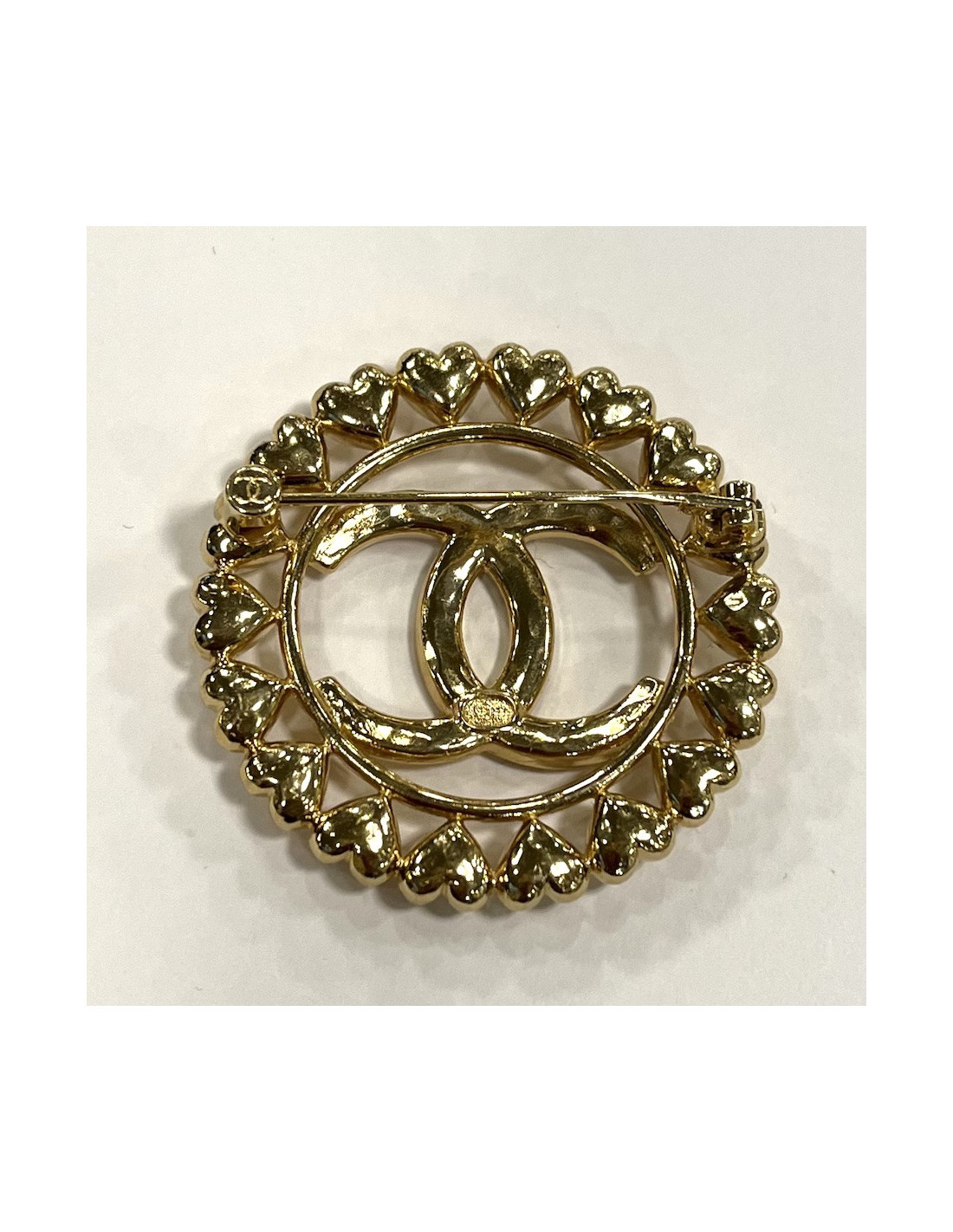 Détails : broche dorée avec logo CC entouré de coeurs