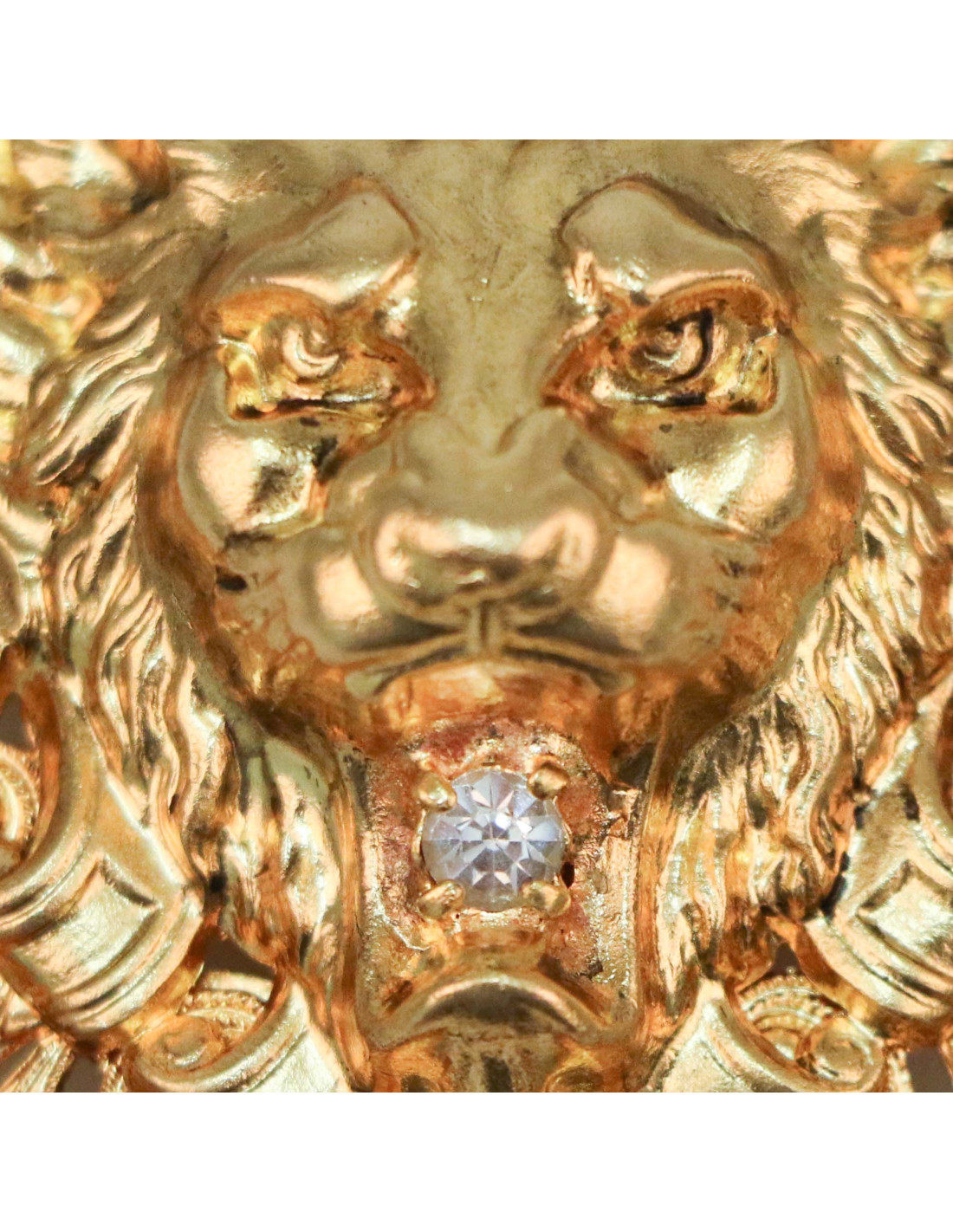 Détails : superbe broche réalisée à la main : une tête de lion retenant un brillant entouré de cabochons en forme de goutte colorés et strass.