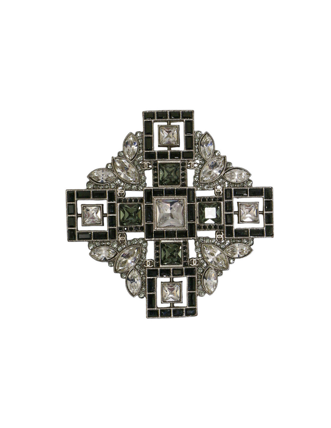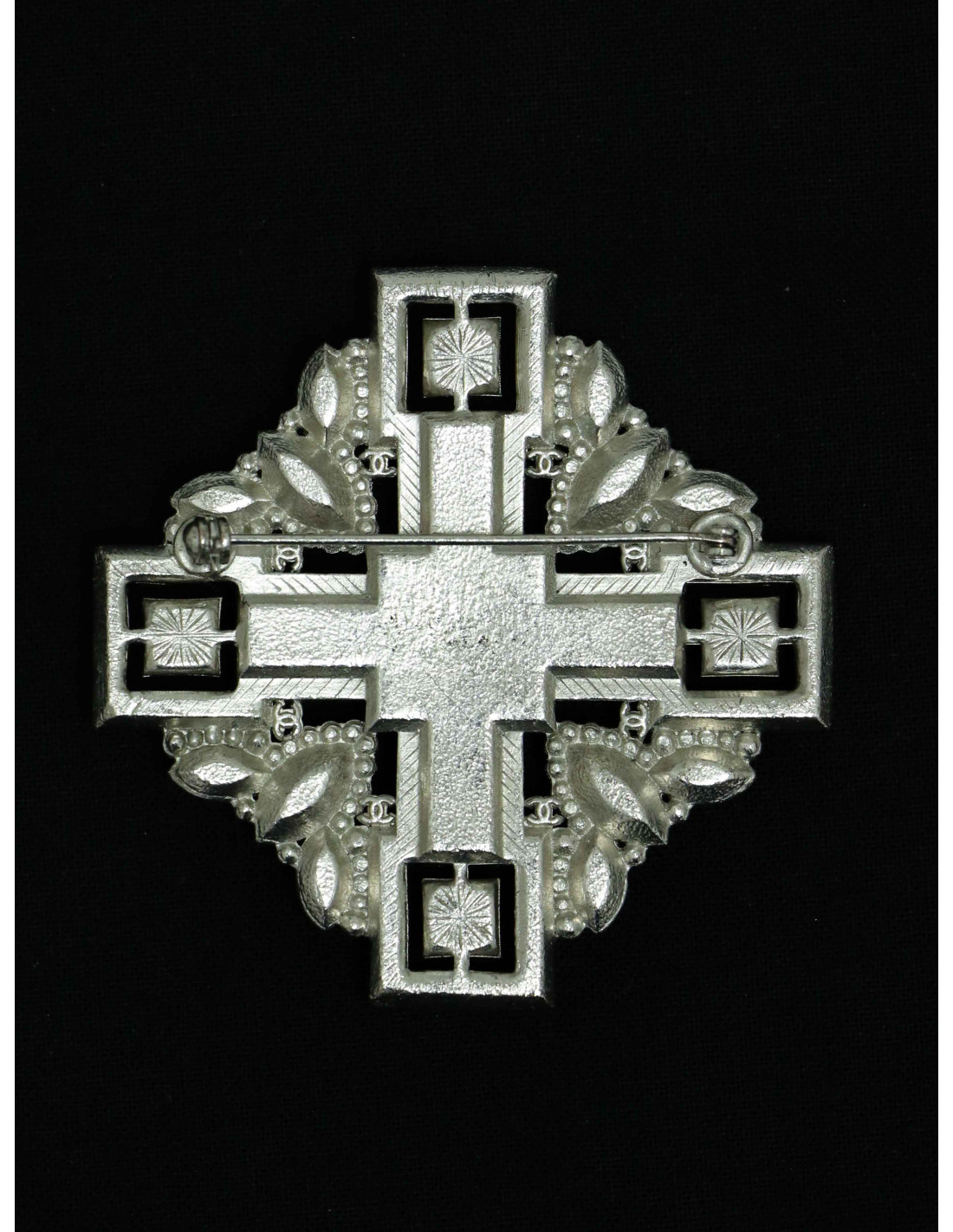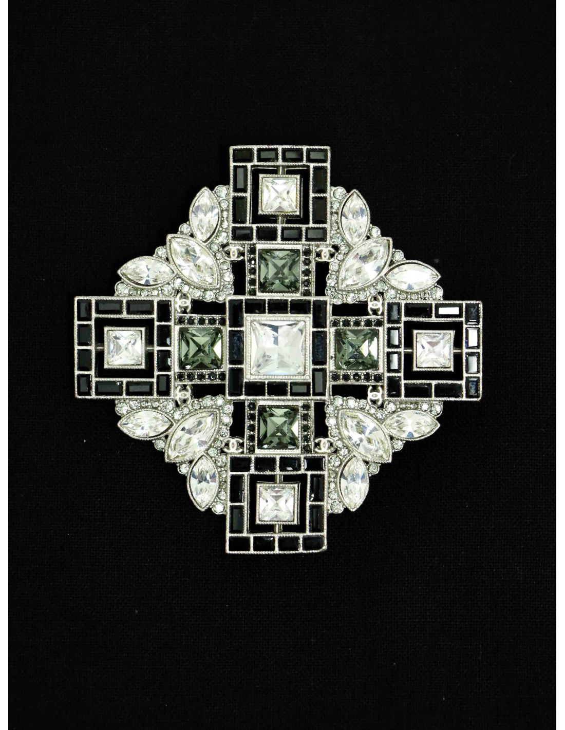 Détails : broche croix incrustées de cristaux transparents et noirs, petits CC discrets