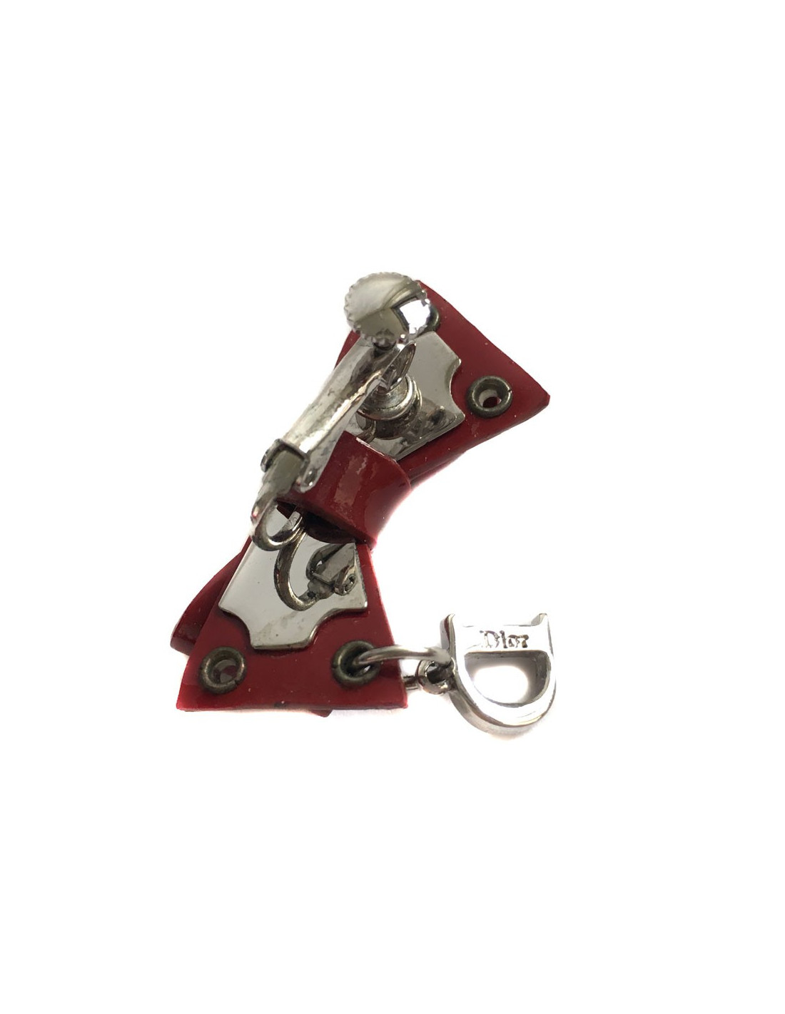 Petite broche DIOR vintage en forme de noeud bordeaux verni clouté. Petit D, avec les initiales DIOR inscrites dessus, sur un côté de la broche. Fermoir clip avec une petite vis permettant de régler la broche à l'épaisseur du vêtement.