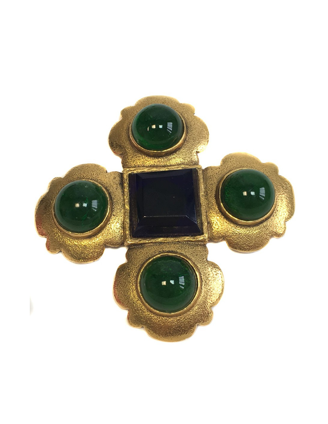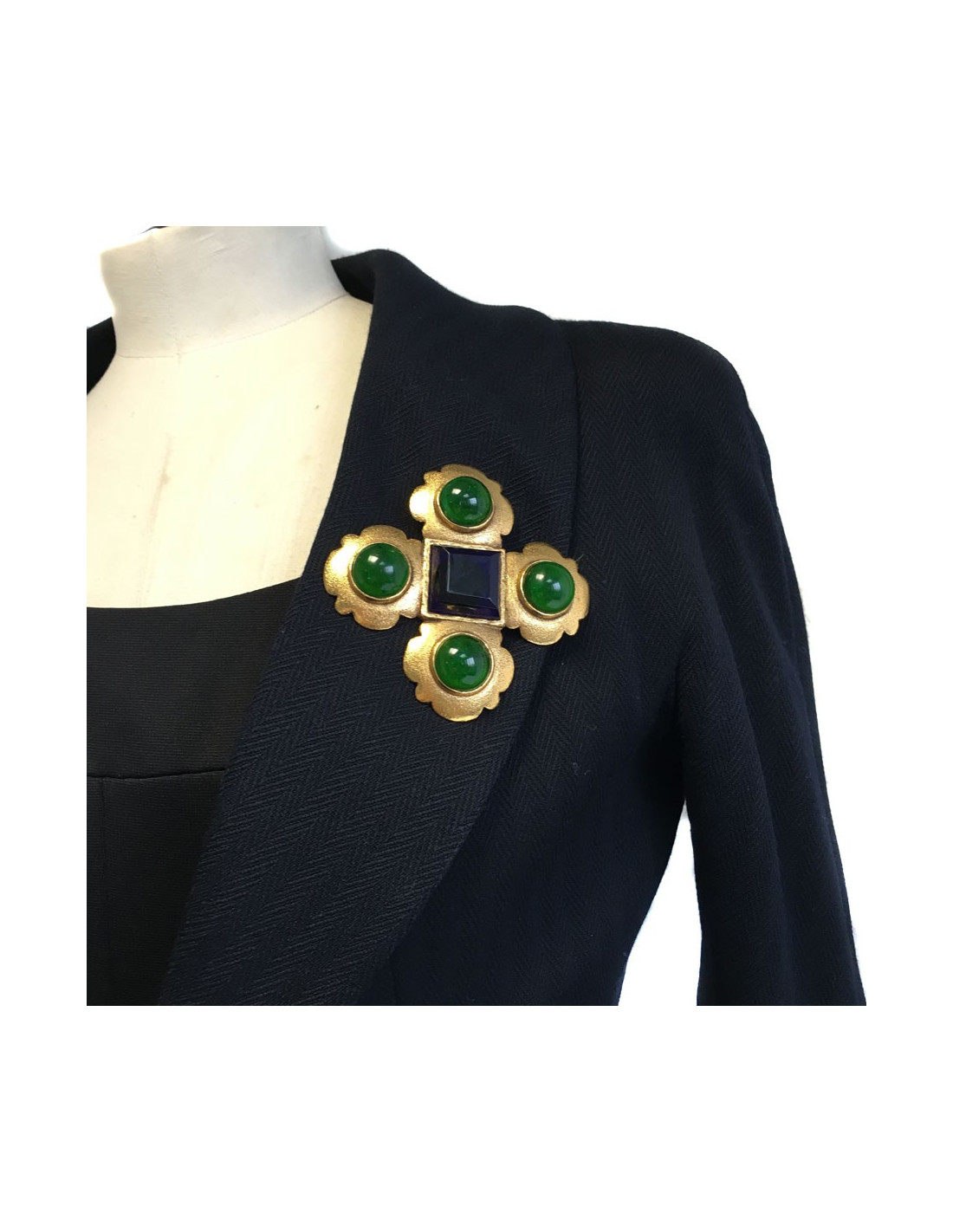 La broche est en métal doré en forme de croix ornée de 4 pierres en pâte de verre émeraude de forme ronde et d'une pierre carré de couleur saphir.