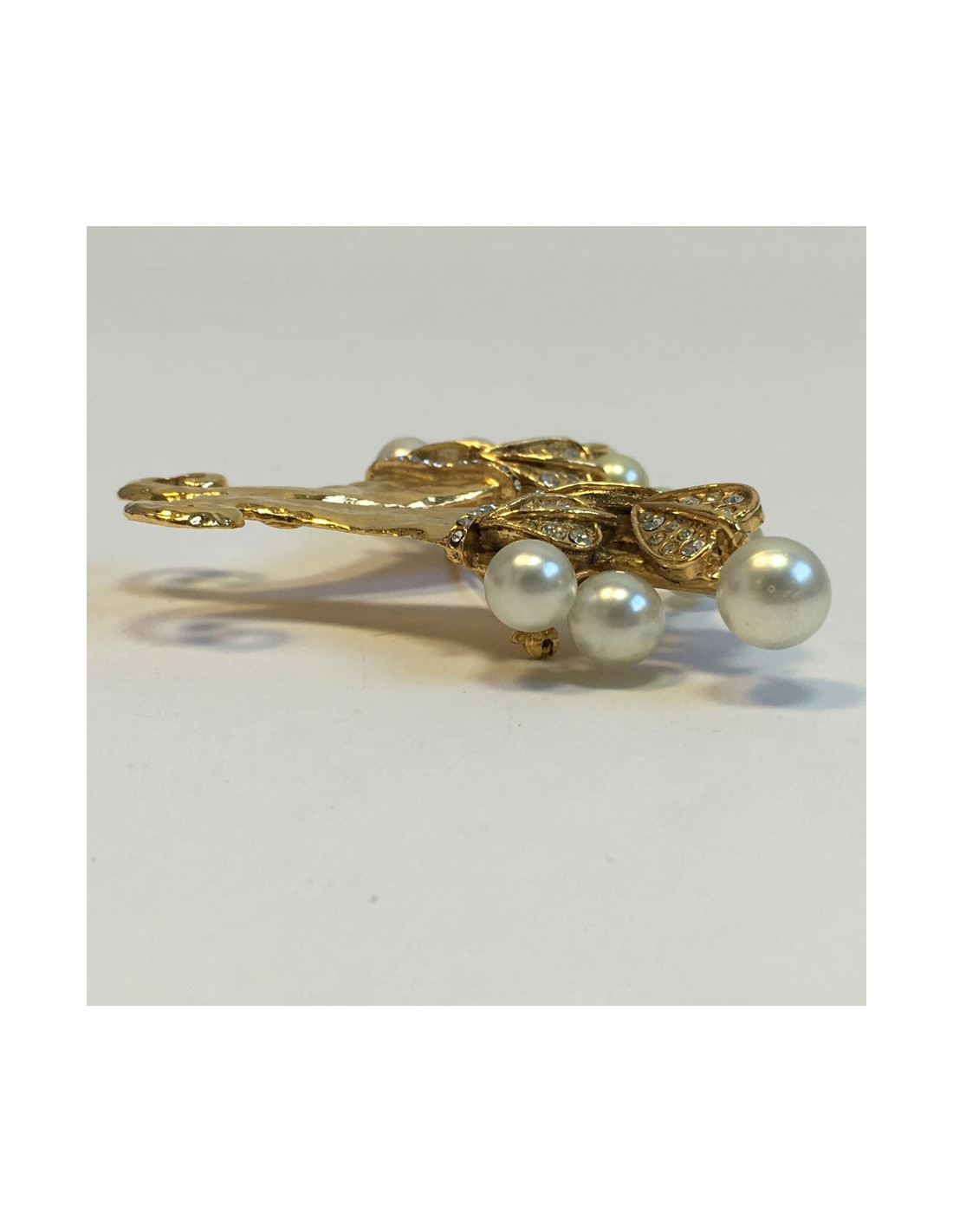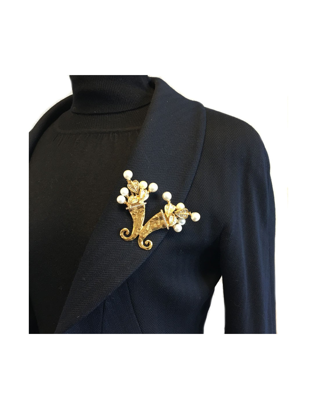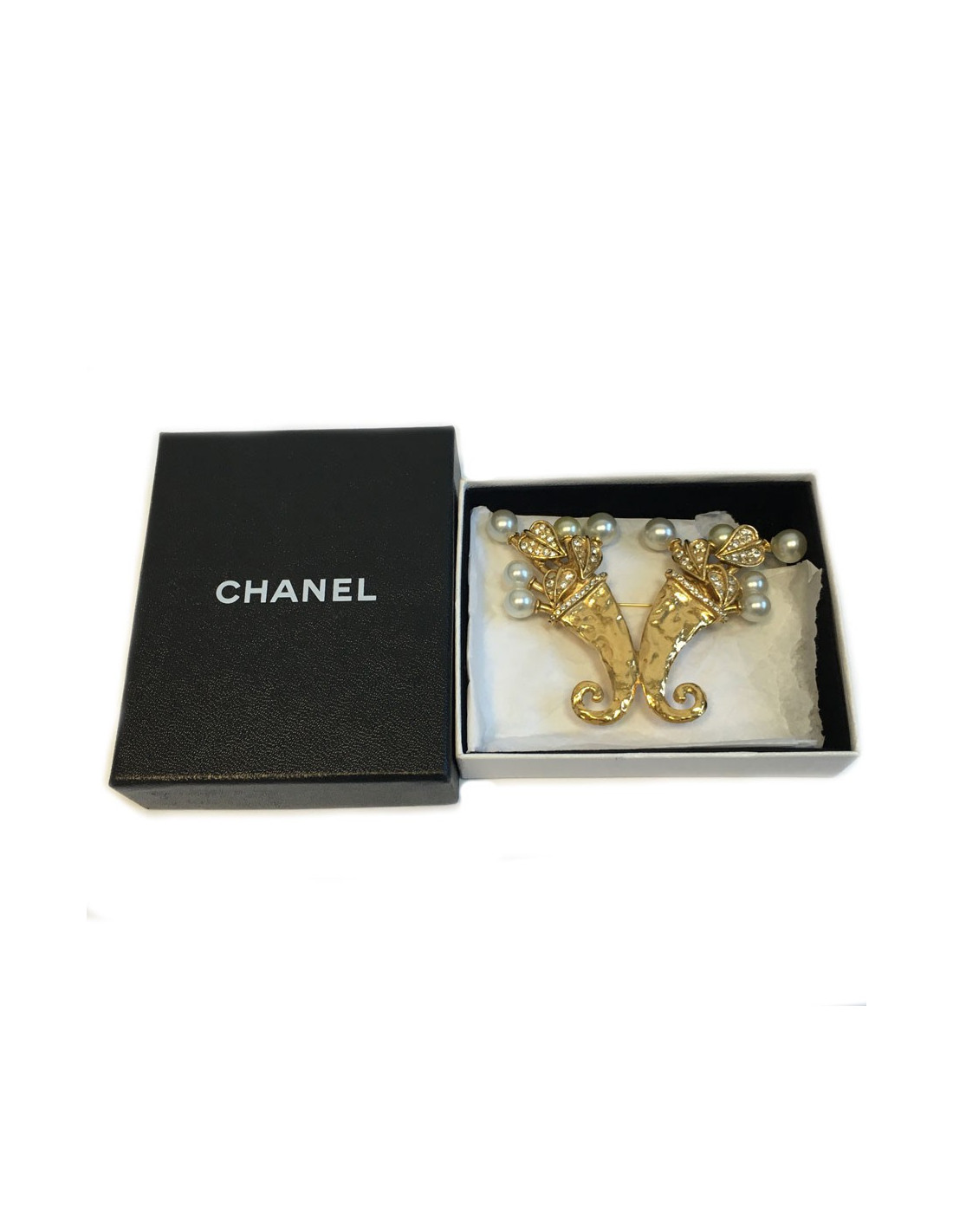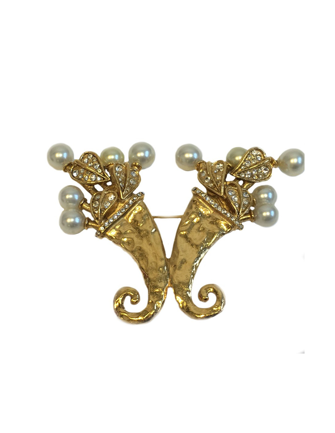 Splendide et imposante broche CHANEL cornes d'abondance, en métal doré martelé, brillants et perles nacrées. "S" des soldes sur la pastille de la marque au dos. Elle n'a jamais été portée
