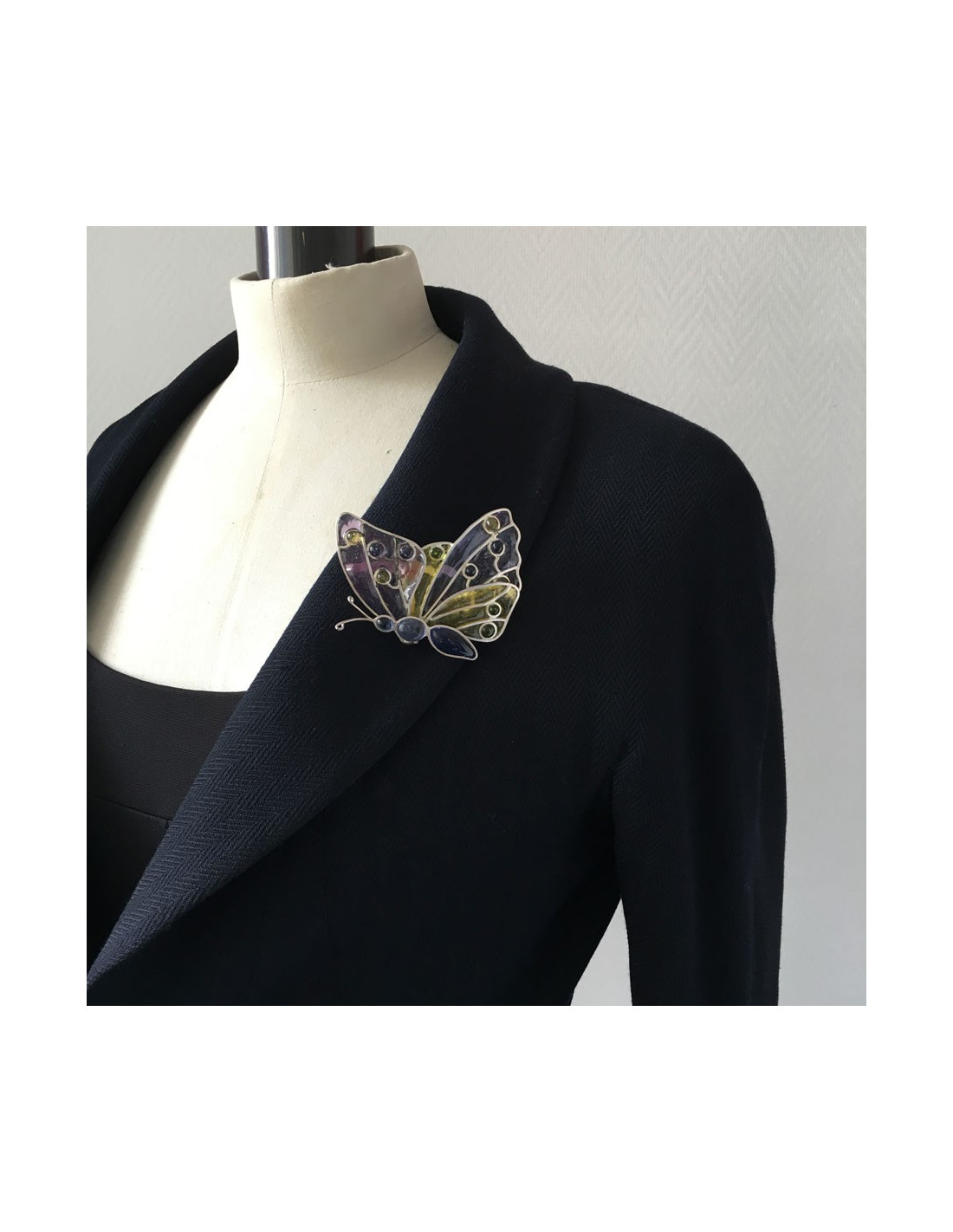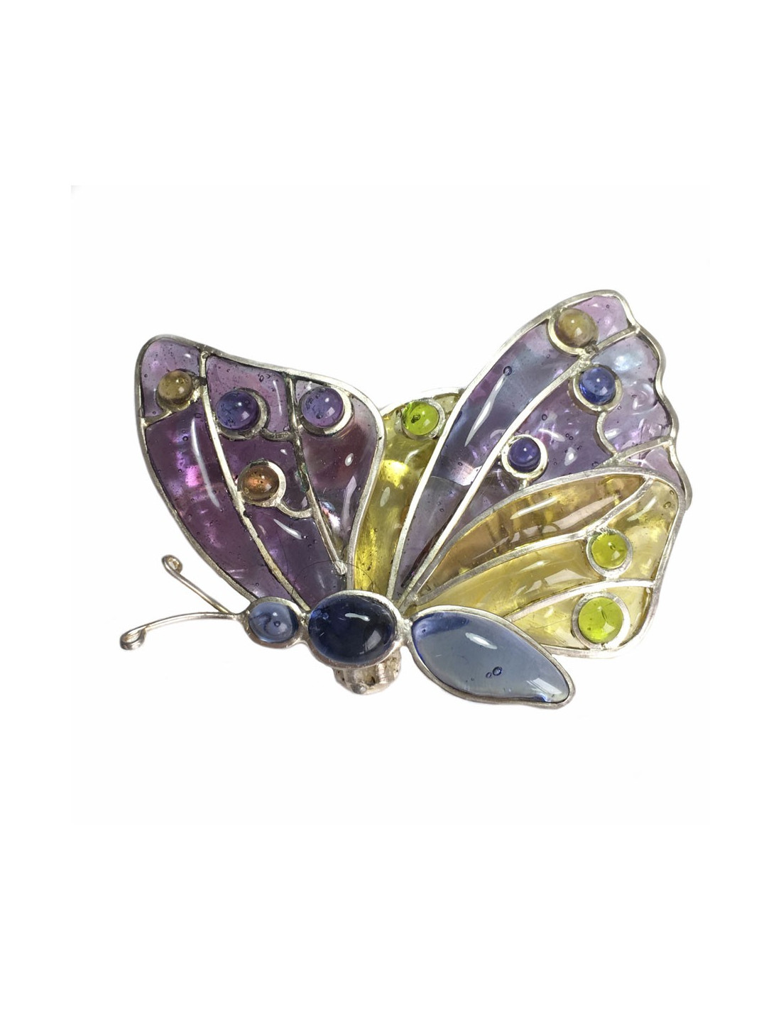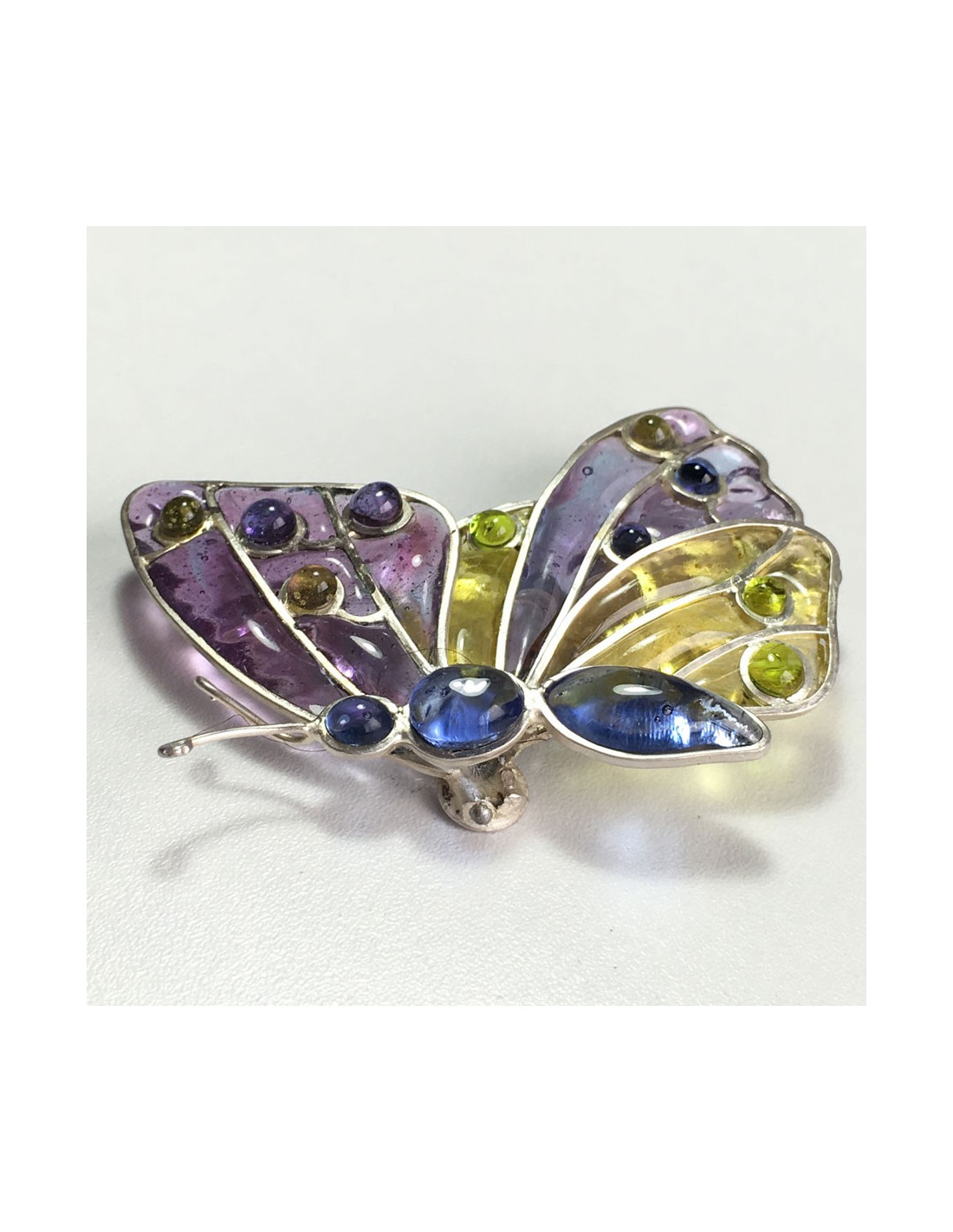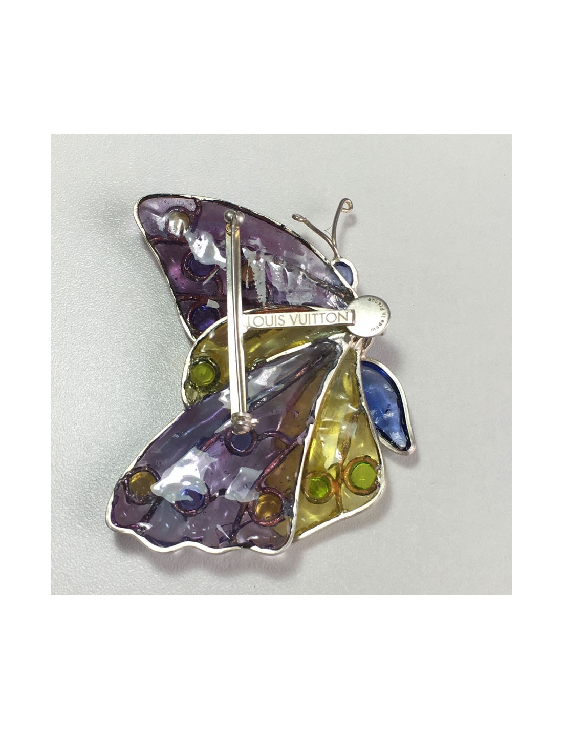 Broche LOUIS VUITTON papillon en pâte de verre multicolore et métal argenté