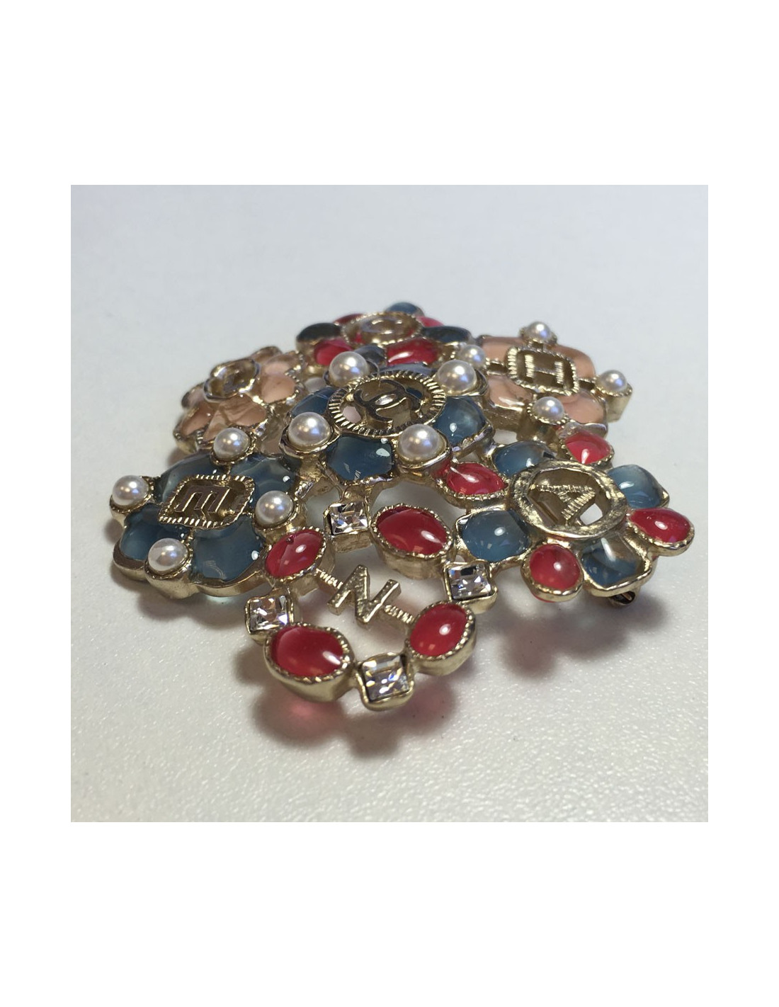 Superbe broche Chanel en métal doré or pâle, avec incrustations en résine bleu, rose et fuschia, perles nacrées et strass. Collection Printemps/ été 2016. Il y a l'inscription "C H A N E L" en lettres dorées. En très bon état.