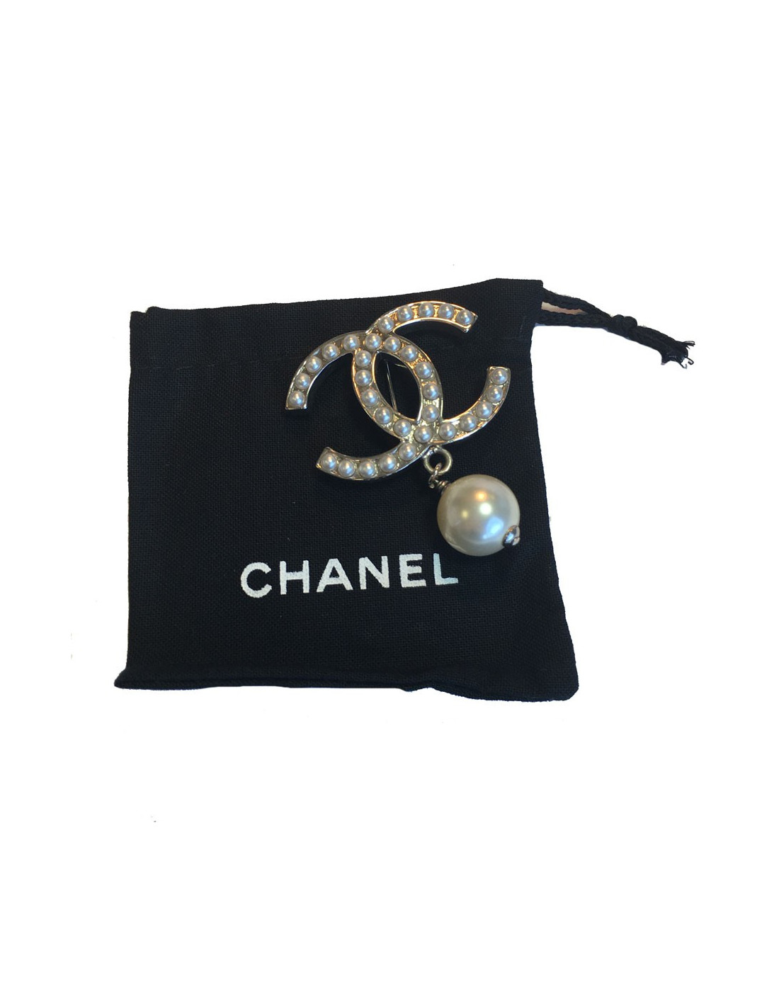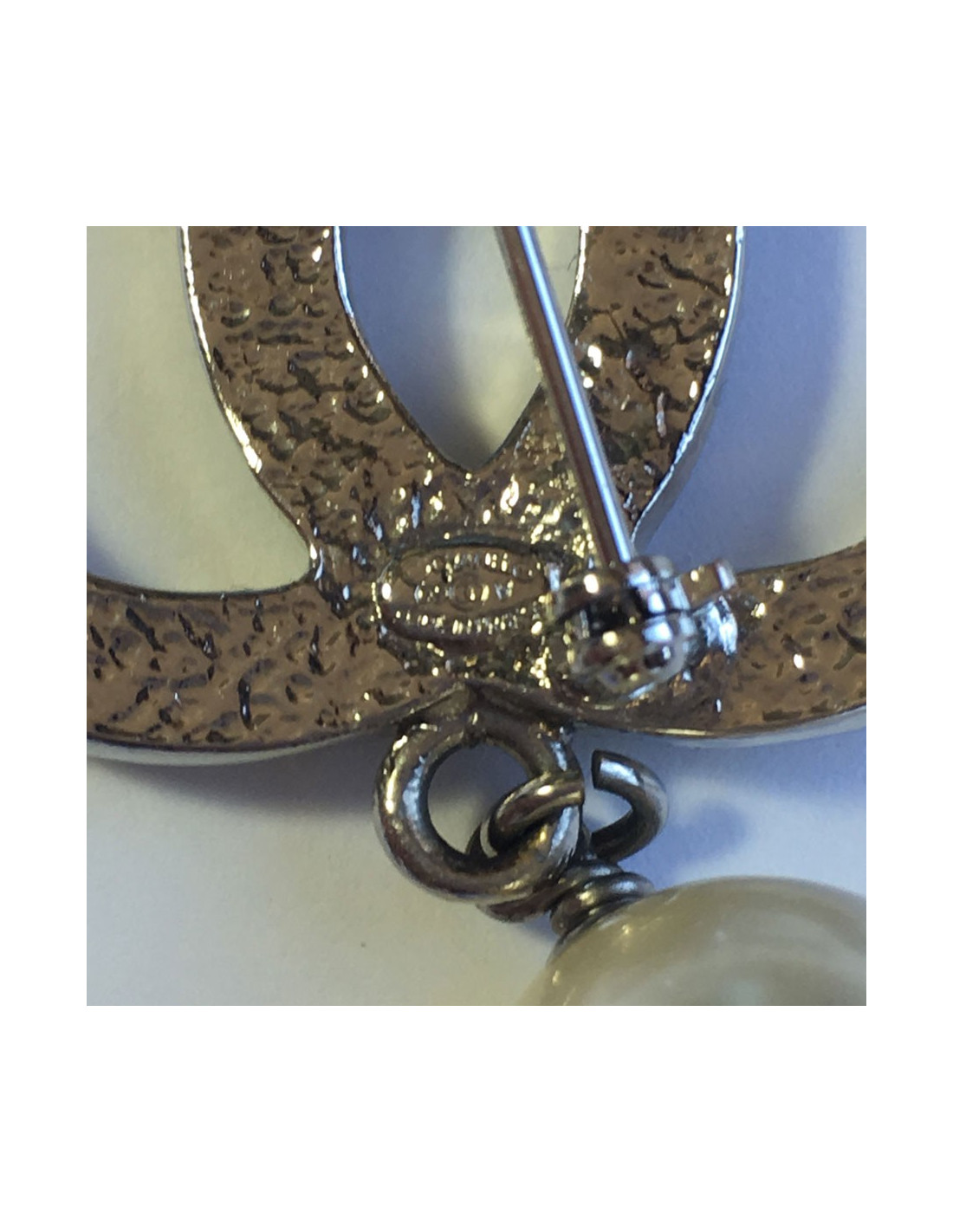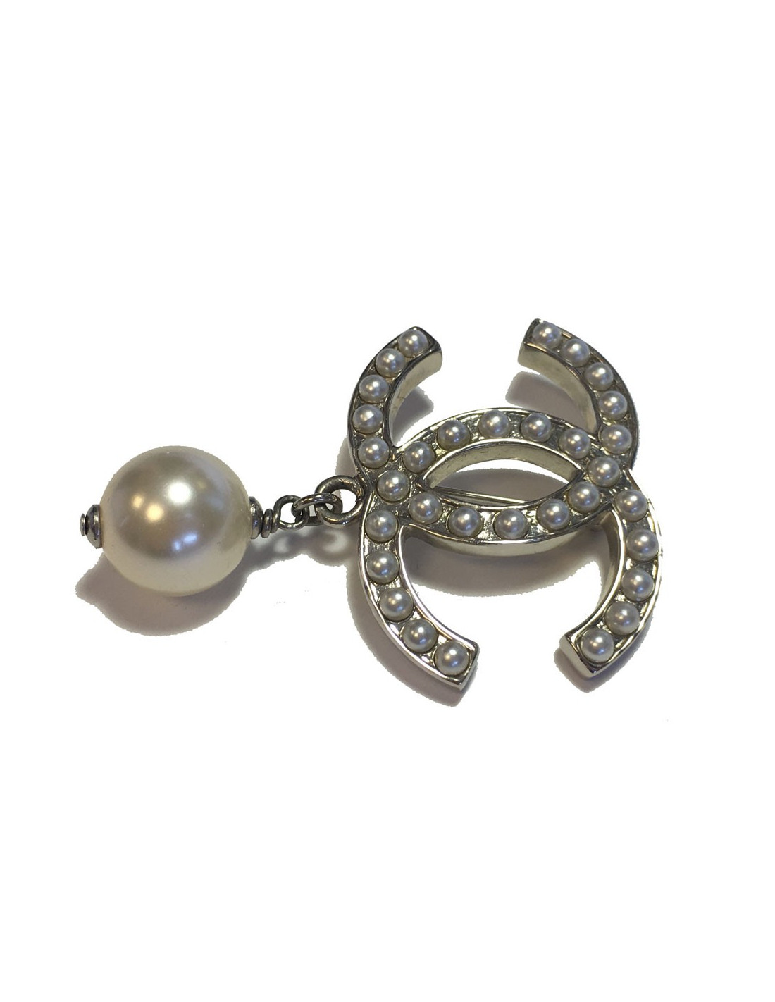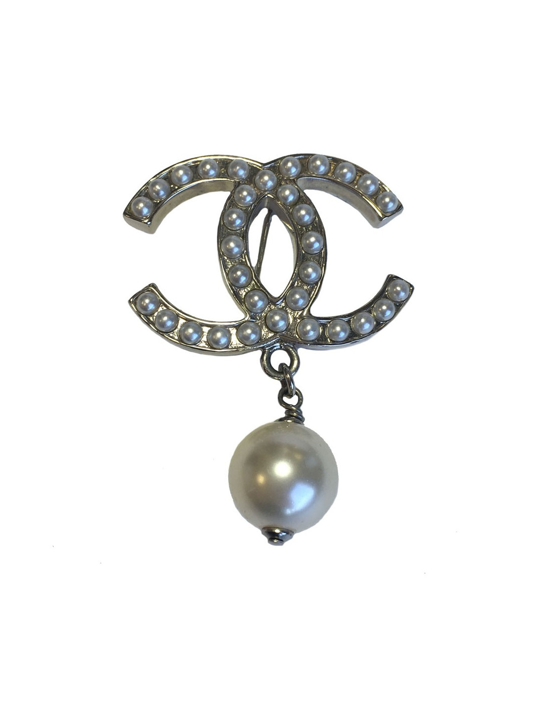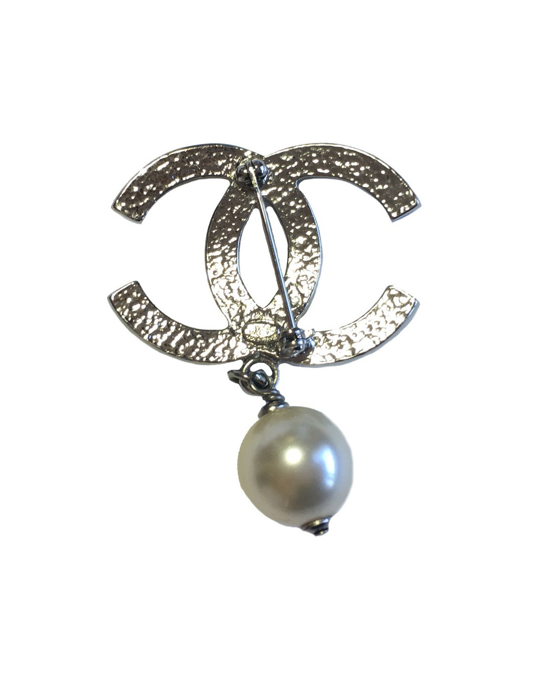 Broche CHANEL CC en métal argenté et perles nacrées