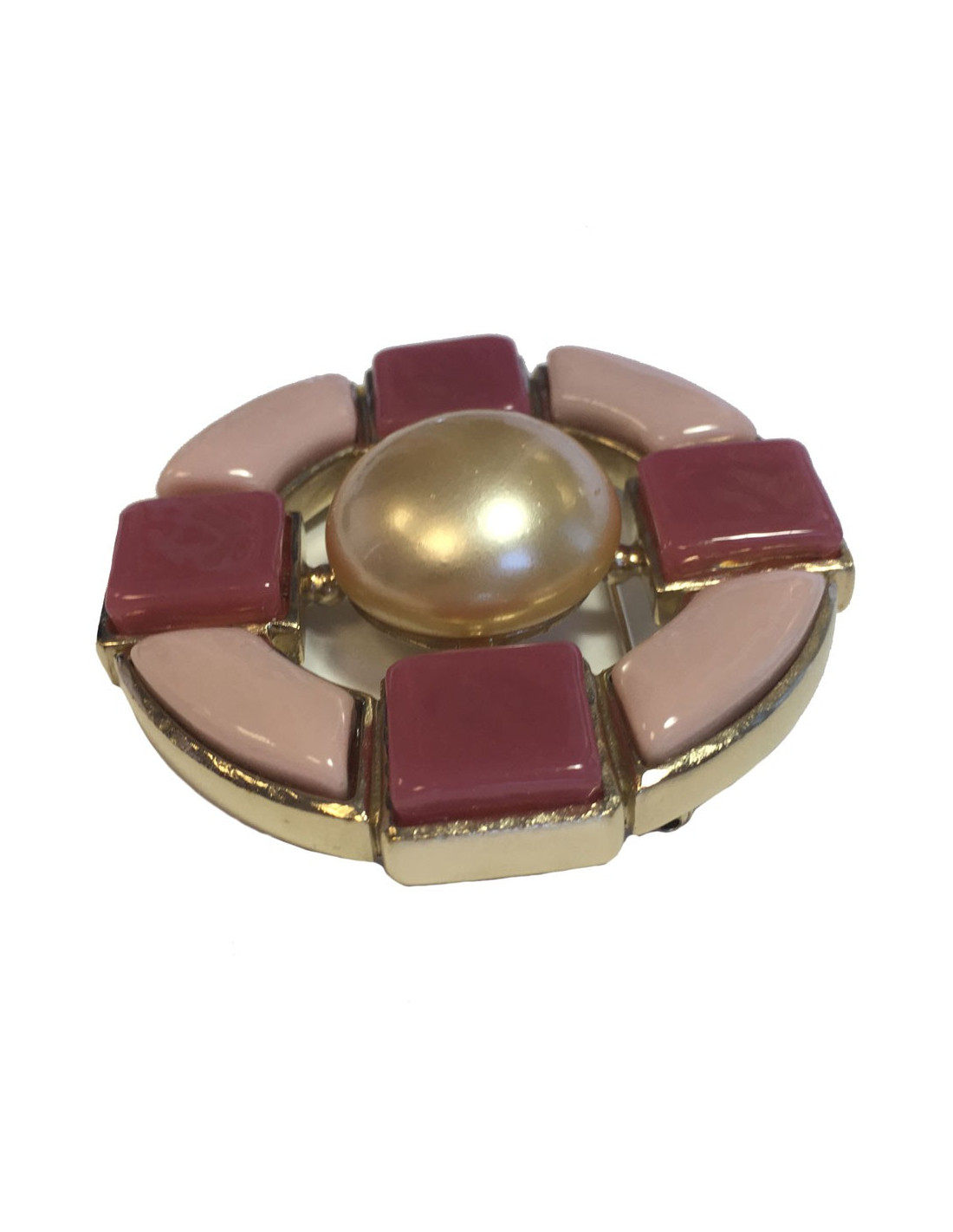 Broche CHANEL en métal doré, perle nacrée et pâte de verre rose