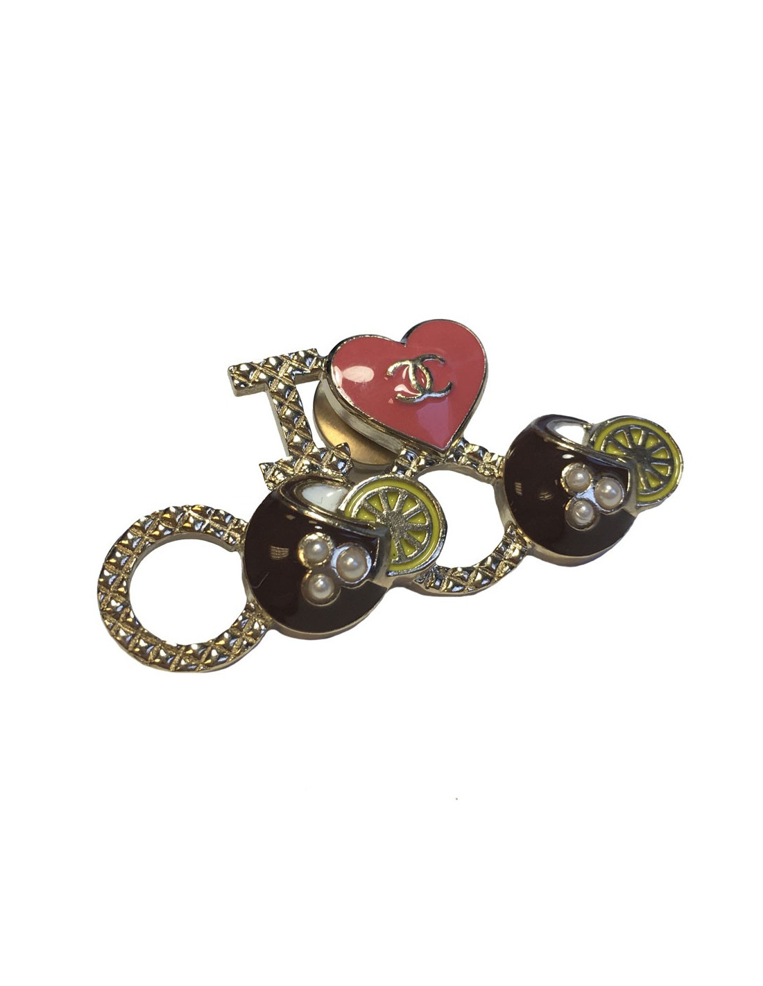 Pin's CHANEL "I love COCO" en métal doré, résine et petites perles nacrées. Coeur de couleur rose.