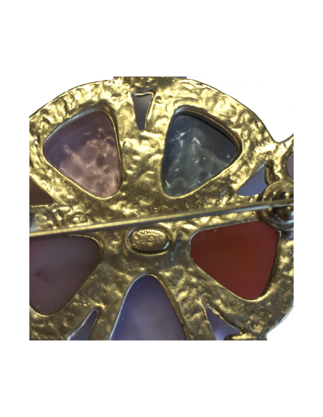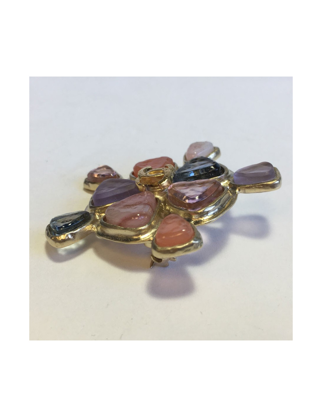 Très belle broche CHANEL en métal doré sertie de pierres en résines colorées dans les tons de rose et mauve. Un CC doré se trouve au centre du bijou.