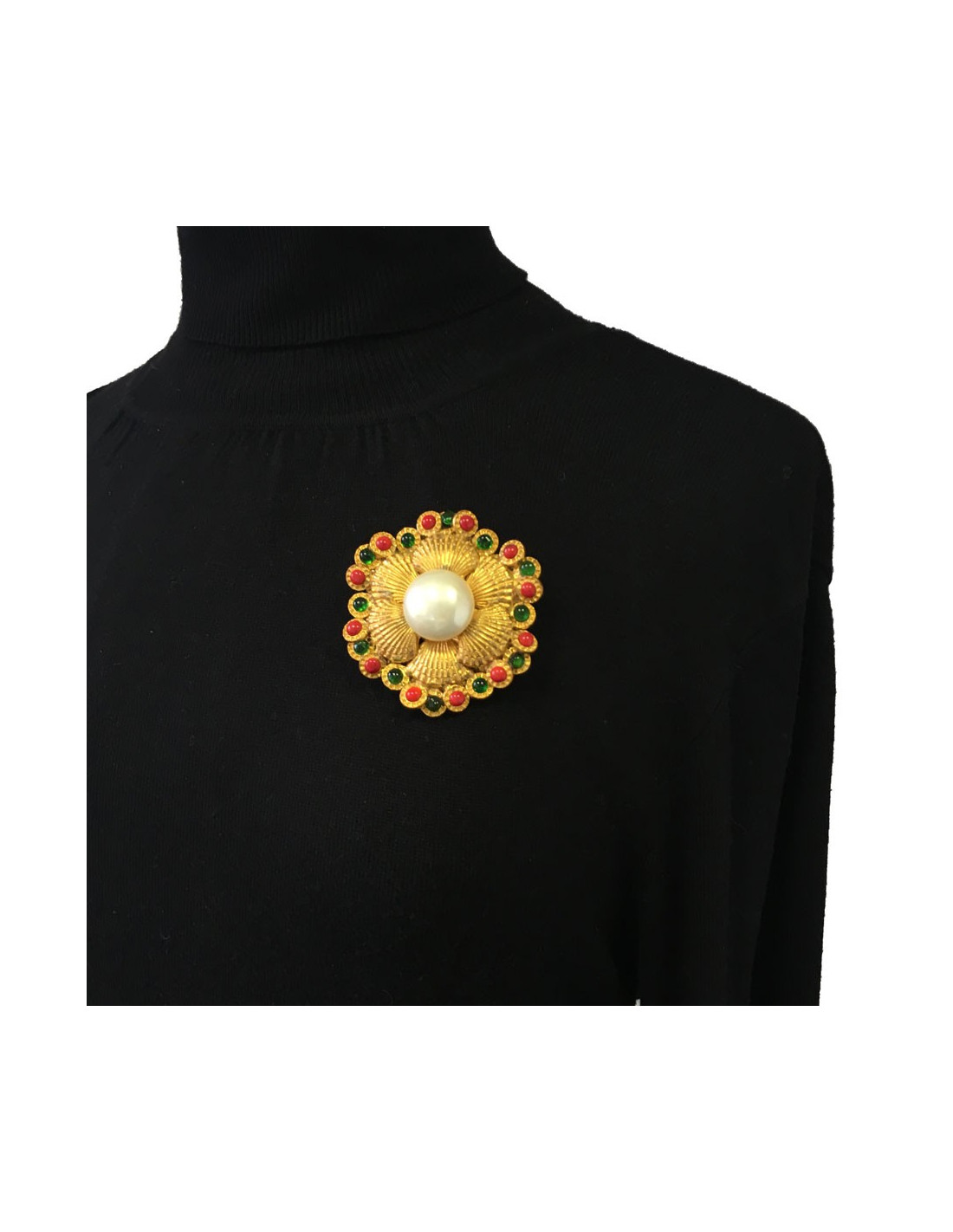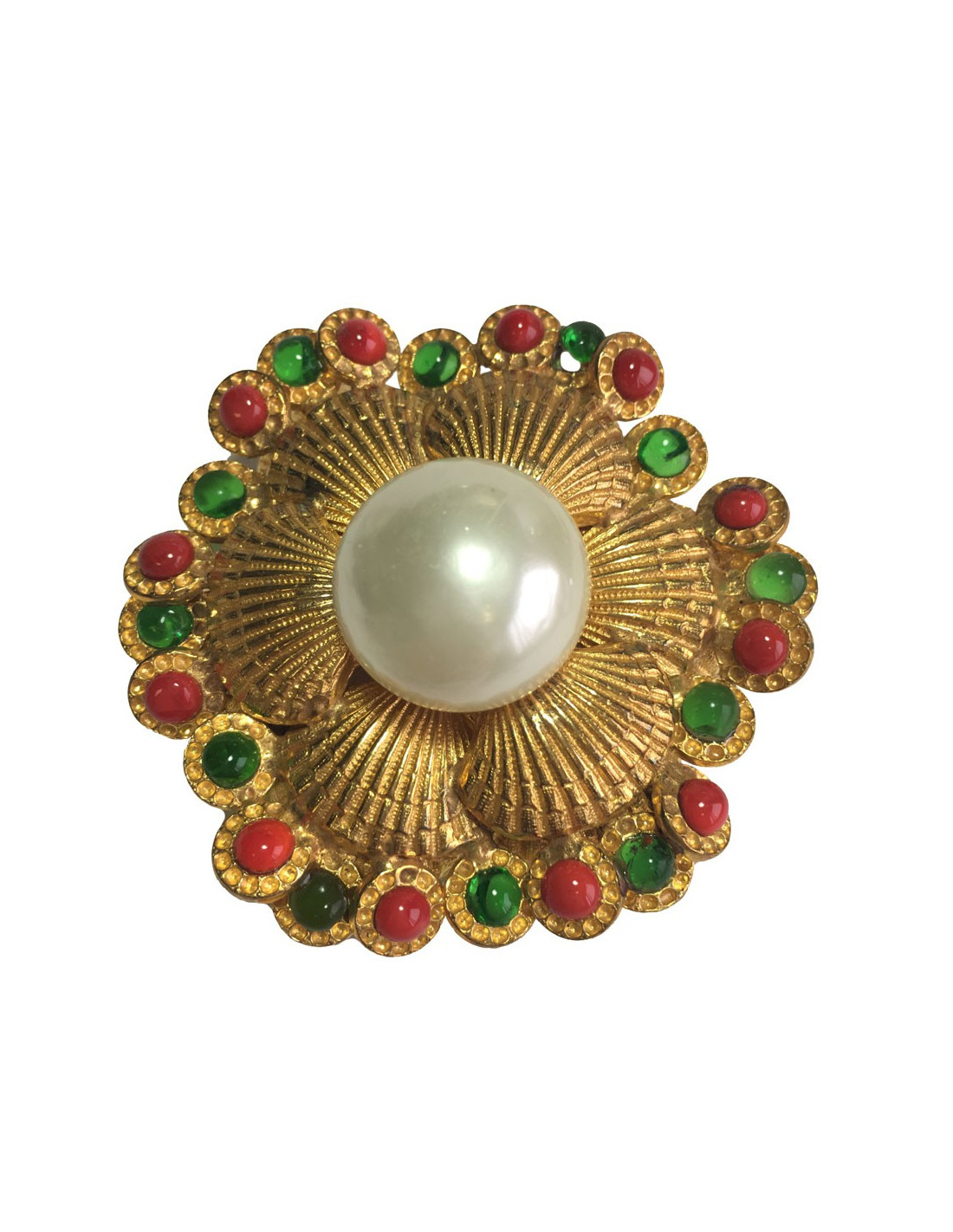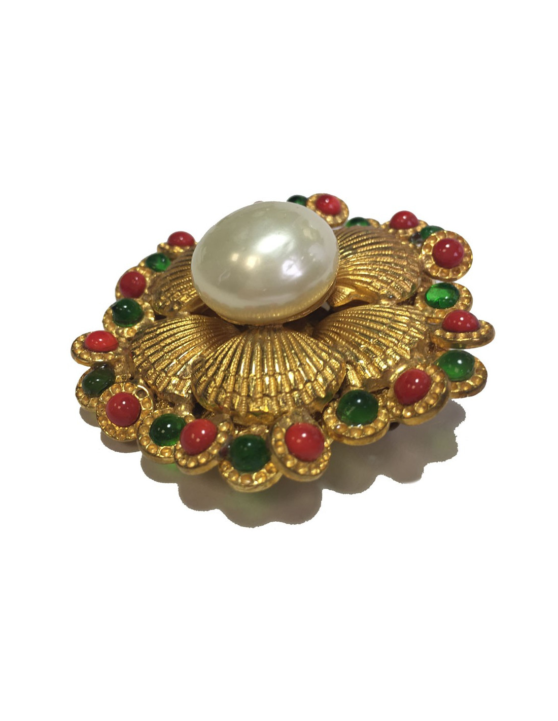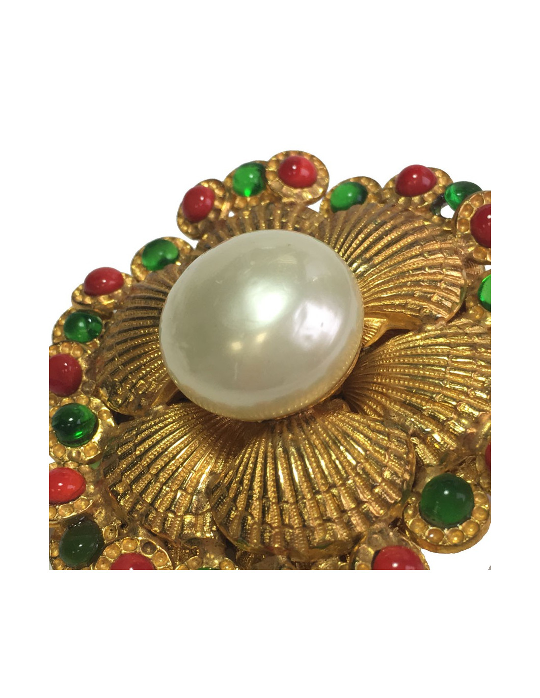 Exceptionnelle broche Couture, en forme de coquillage, en métal dorée sertie de cabochons fabriqués en pâte de verre rubis et vert émeraude. Elle a au centre une belle perle en pâte de verre fabriquée artisanalement nacrée. Le cryptogramme CHANEL est inscrit au dos de la broche. Il devient très difficile de trouver des pièce rares Chanel. Elle est en très bon état.