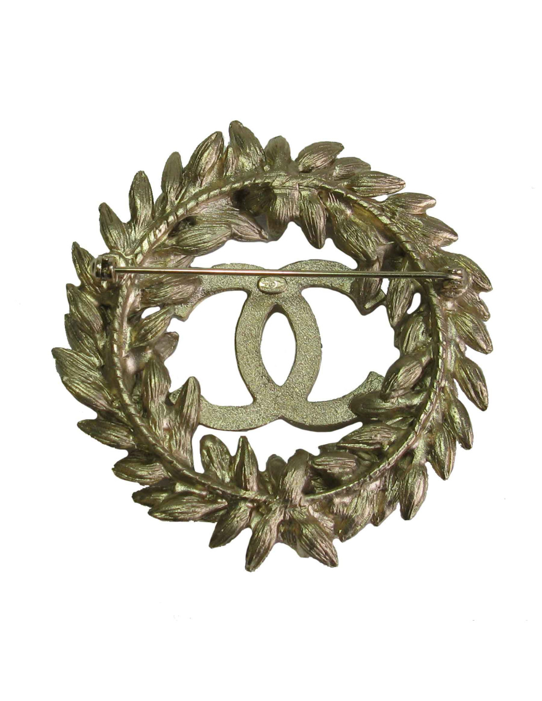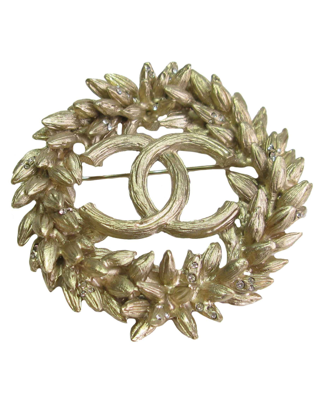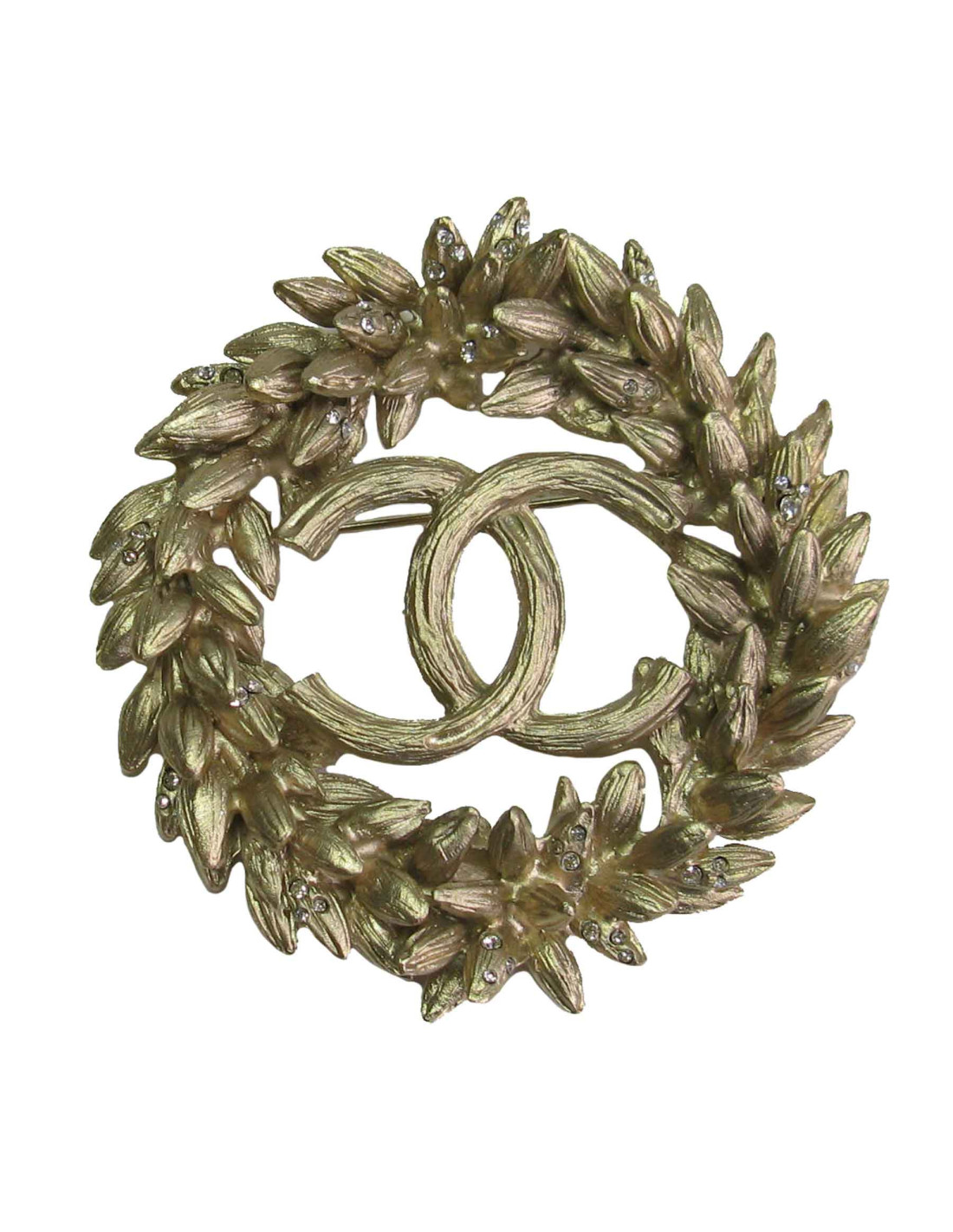 Magnifique broche Chanel, motif épi de blé, en métal doré de couleur or mat sertie de petits strass tout autour. Un beau CC se trouve au centre.