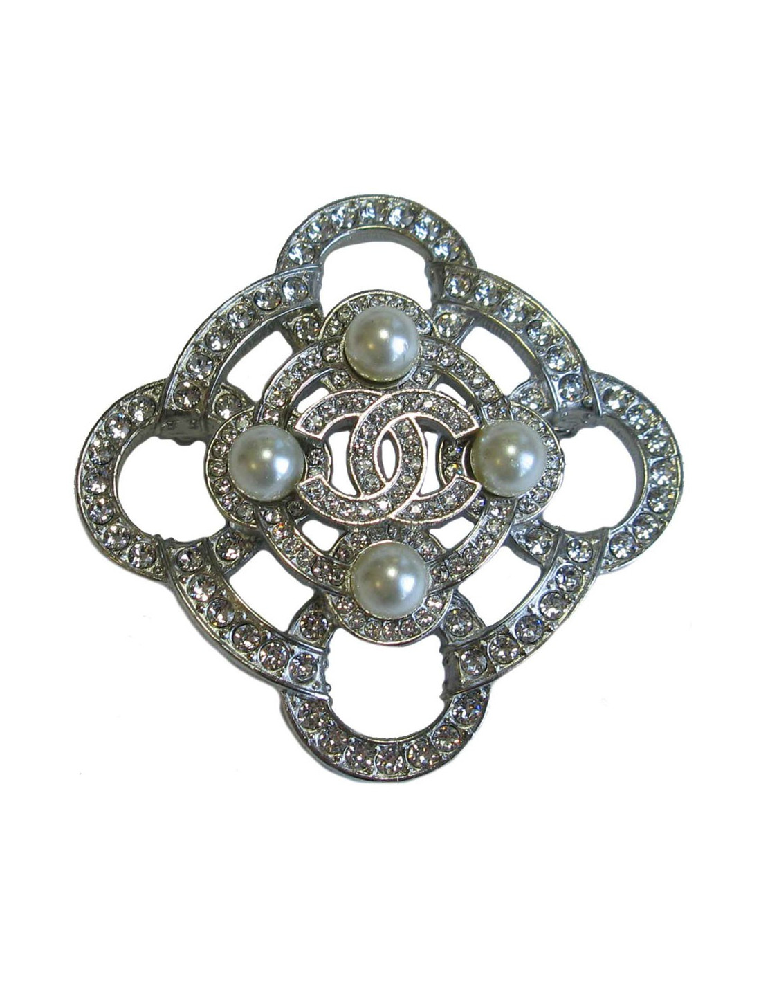 Très belle broche Chanel strass en métal argenté sertie de brillants et de 4 perles nacrées. Le "CC" est serti de 2 tailles différentes de strass Swarovski. En très bon état, portée une fois.