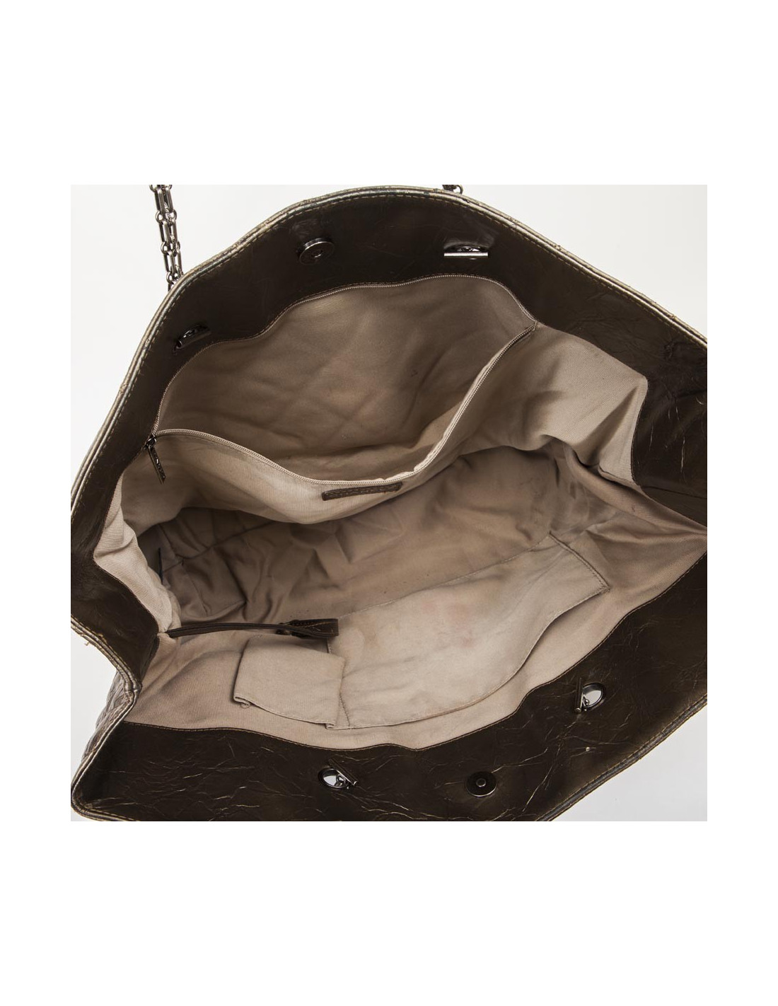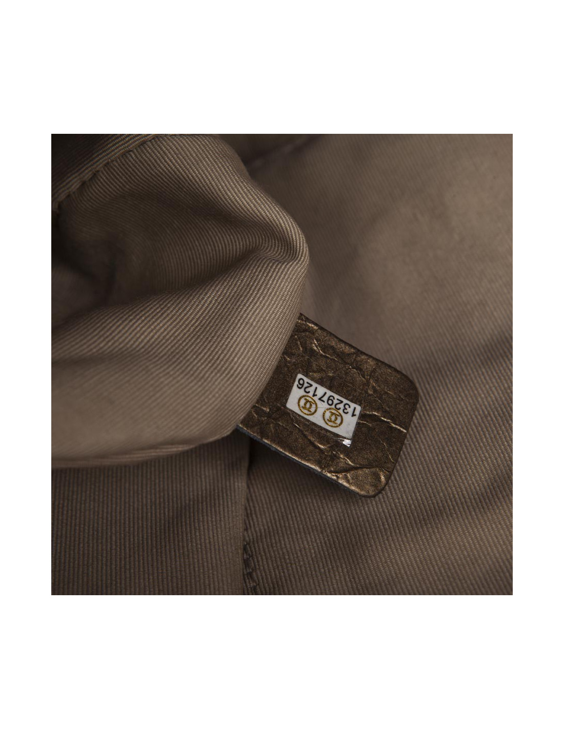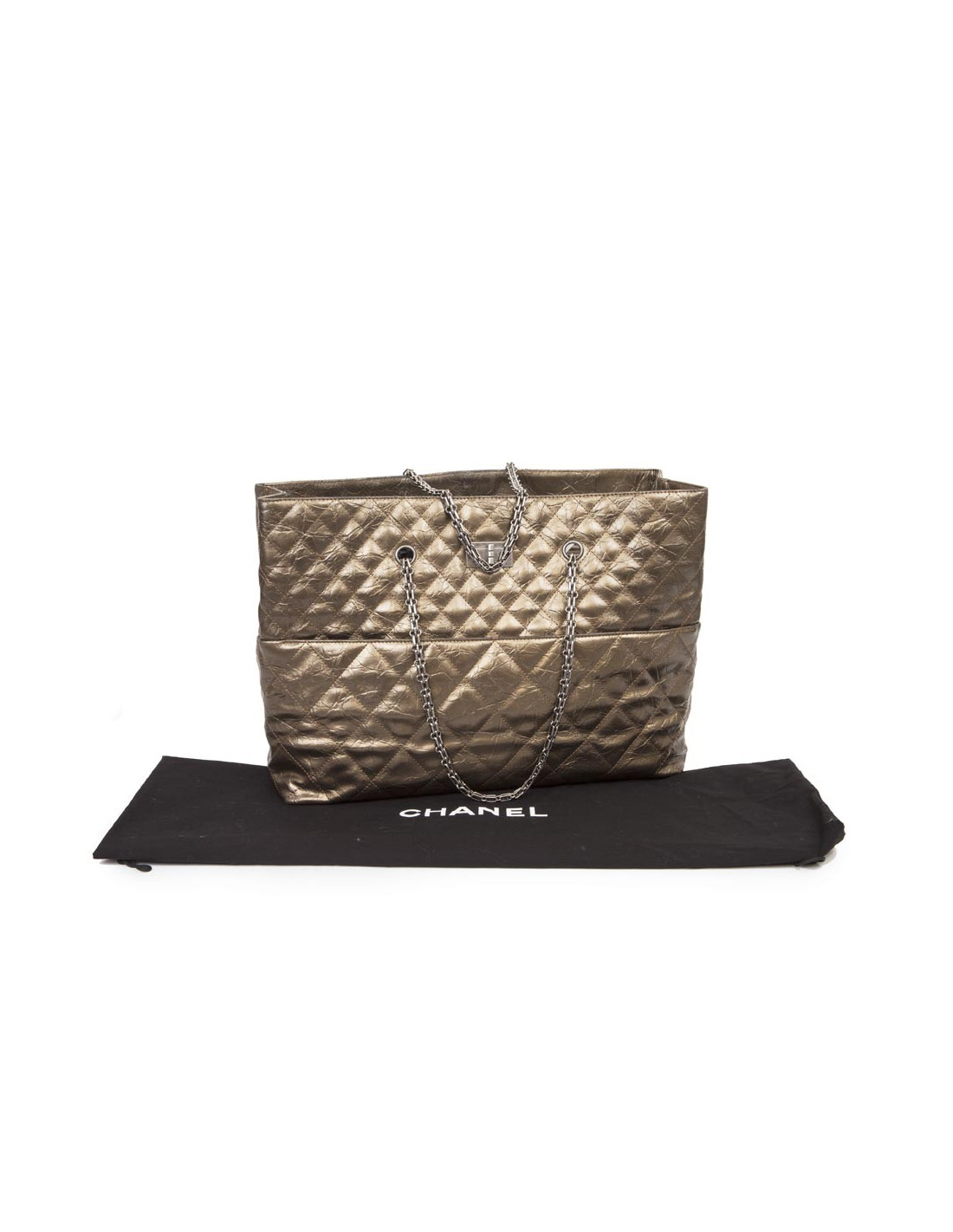Sac Cabas CHANEL en cuir vieilli bronze doré. Il a une boucle du 2.55 en métal argent vieilli. Il se ferme par un bouton pression (au centre, mais ne ferme plus) et se porte à l' épaule par 2 anses. Il a une fente extérieure à l'avant. L'intérieur est en toile beige avec 3 poches dont une zippée et un porte clé. Hologramme 1329... pas de carte d'authenticité.