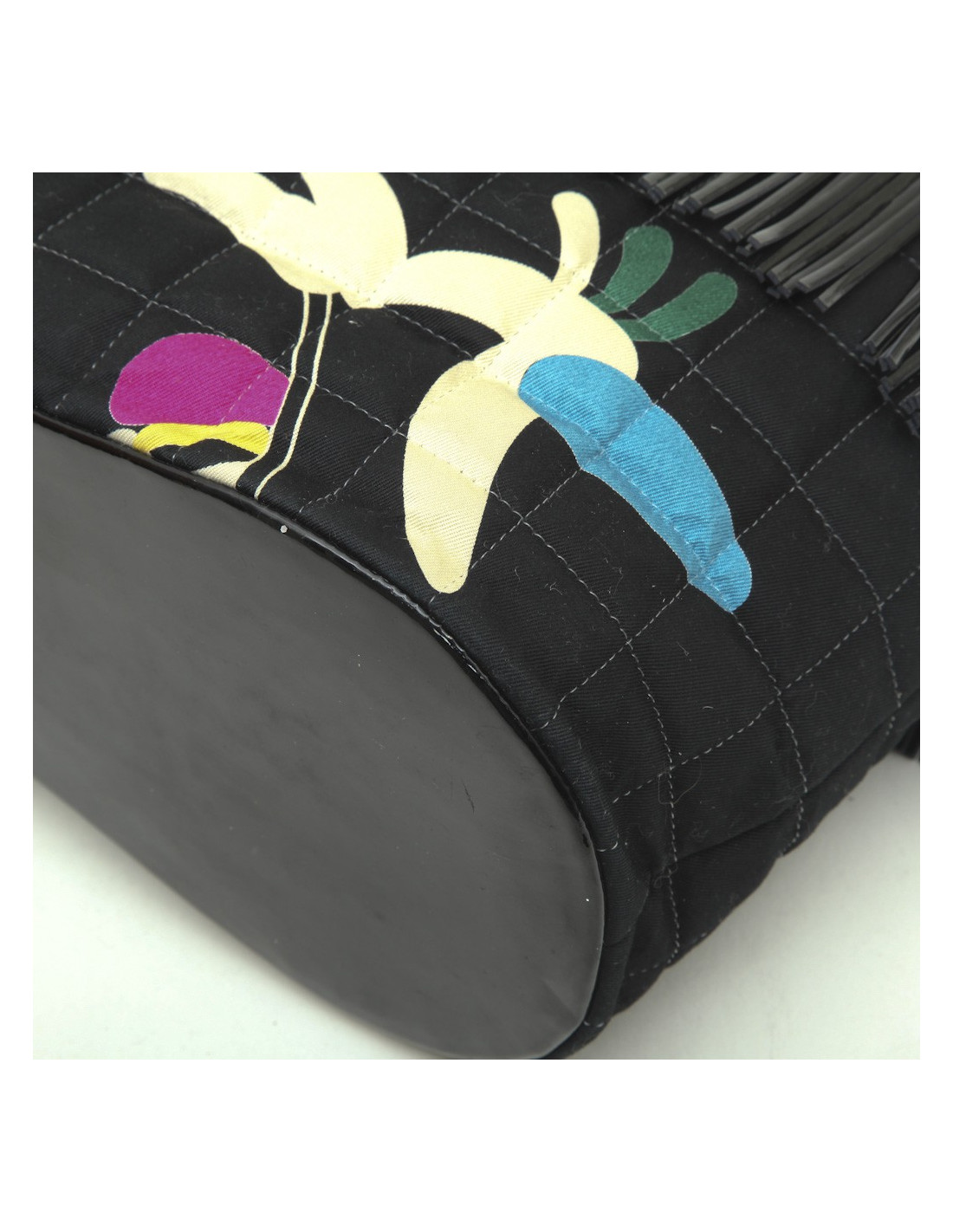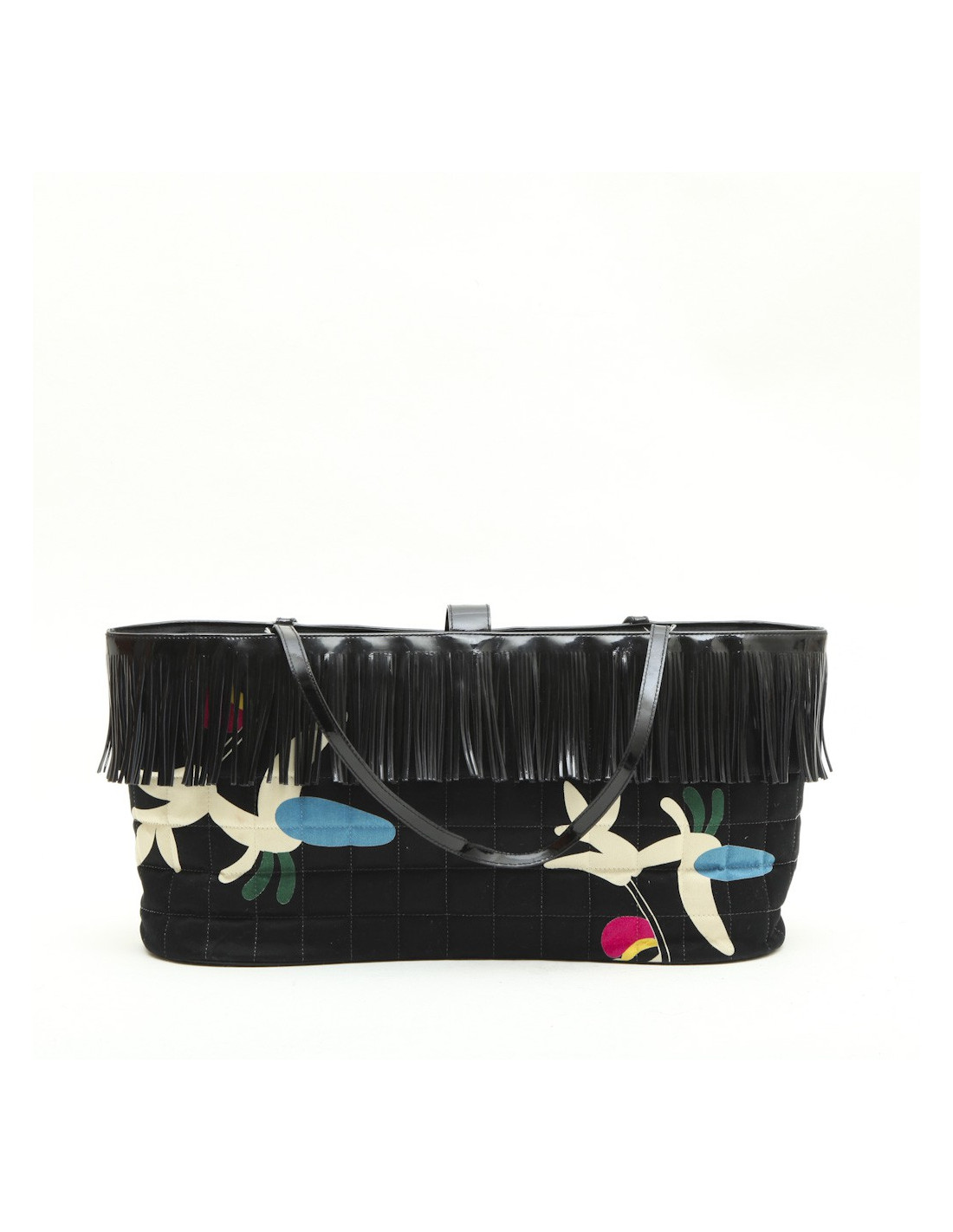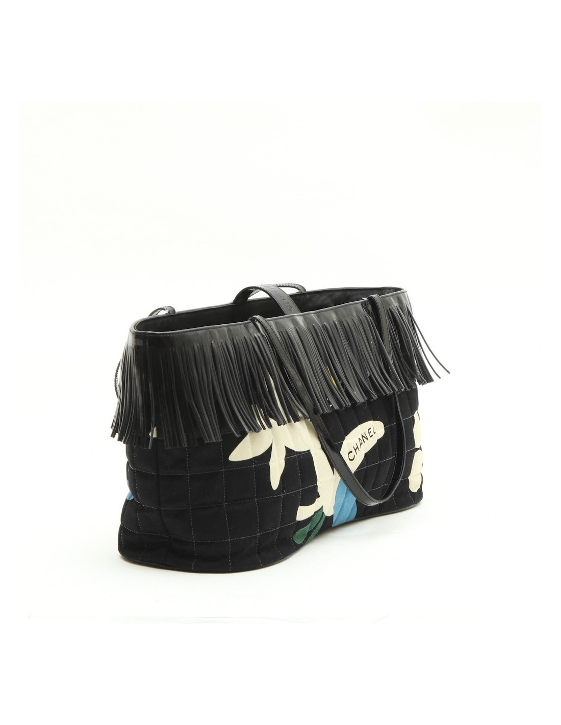Sac Chanel à franges en toile matelassée multicolore. Collection été 2000. Les anses et les franges sont en cuir verni noir. L'intérieur est en toile noire.
