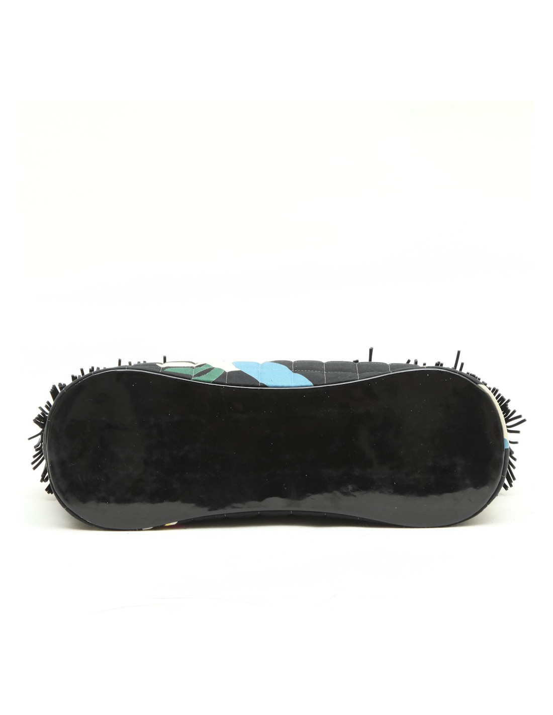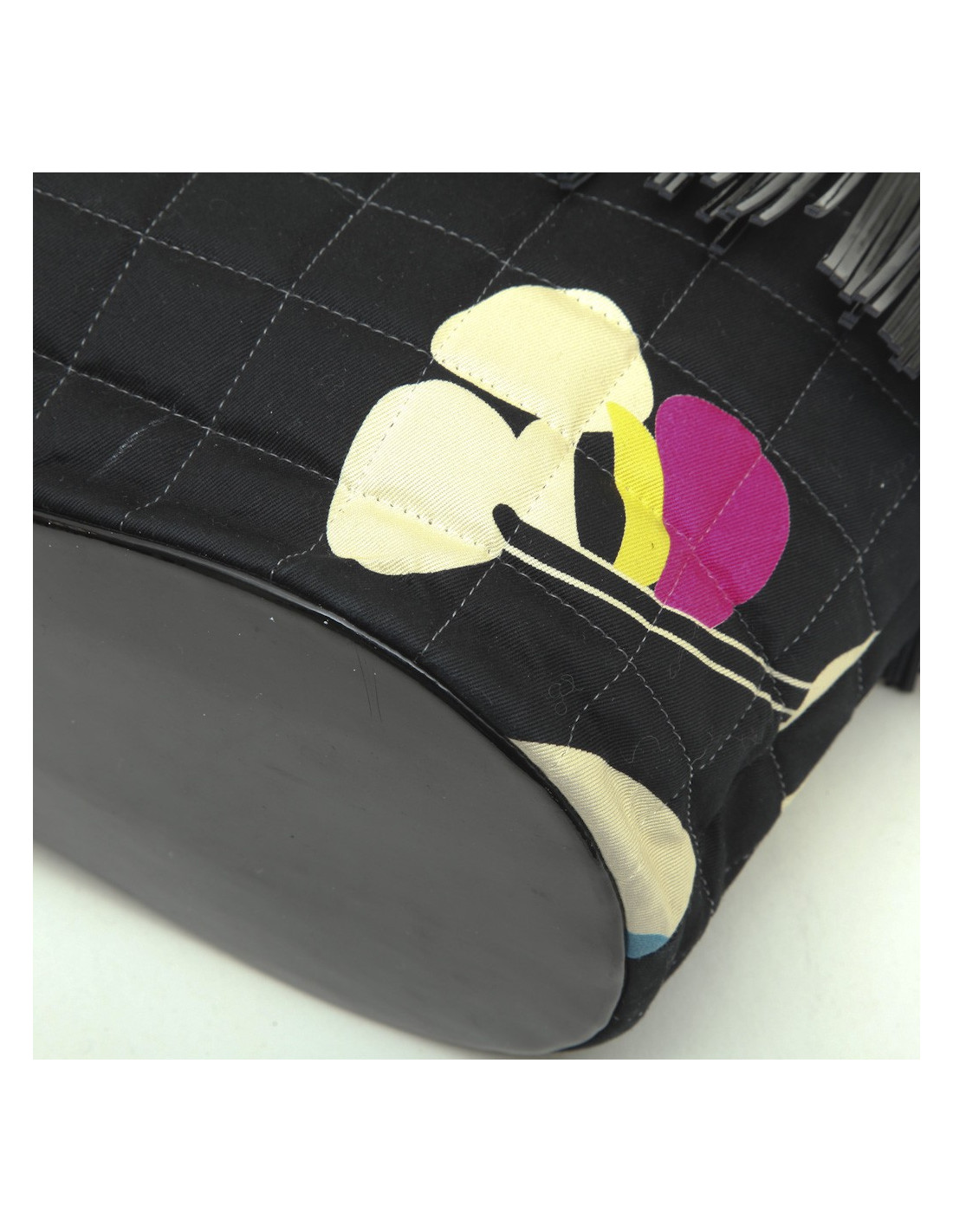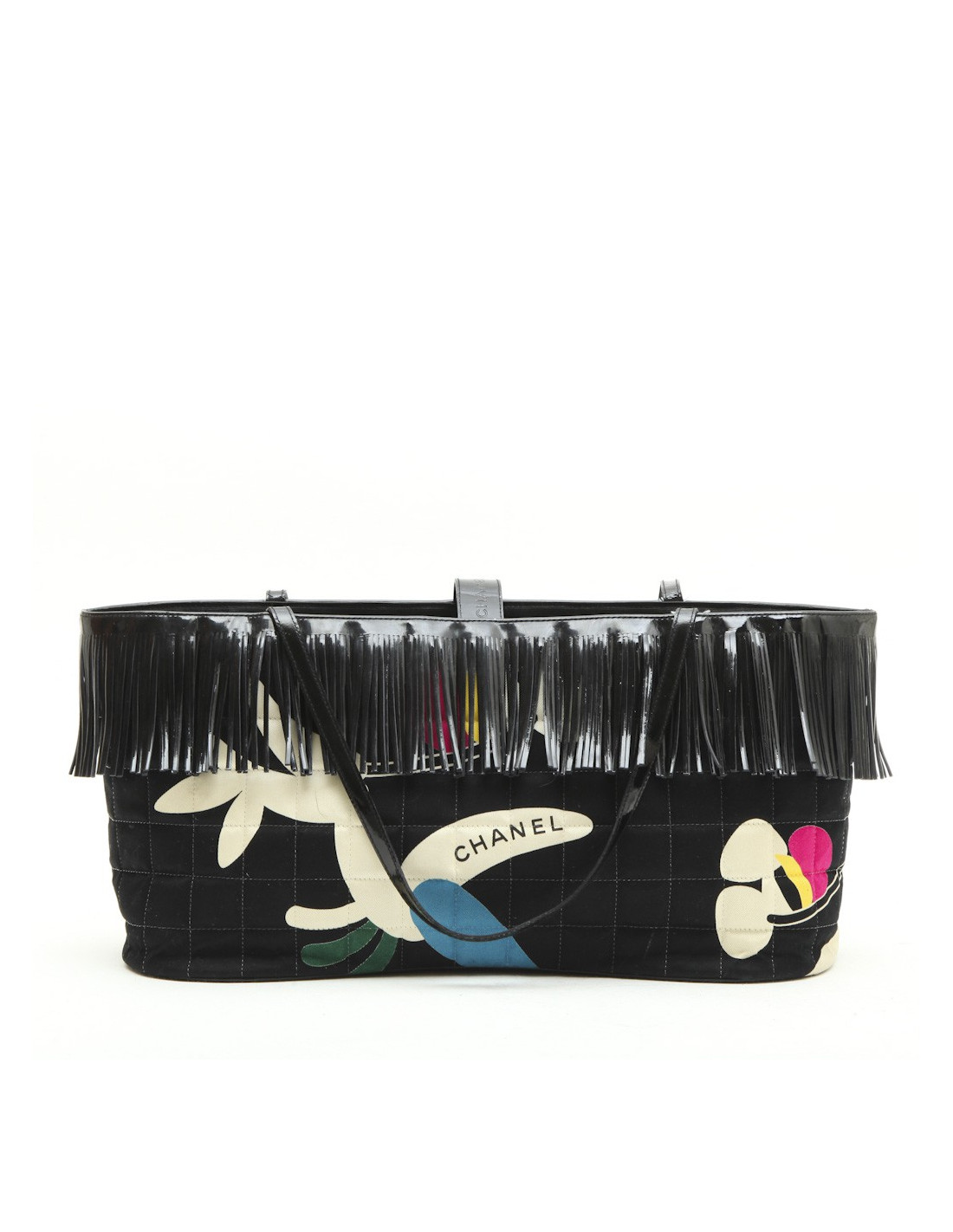 Sac Chanel à franges en toile matelassée multicolore. Collection été 2000. Les anses et les franges sont en cuir verni noir. L'intérieur est en toile noire.