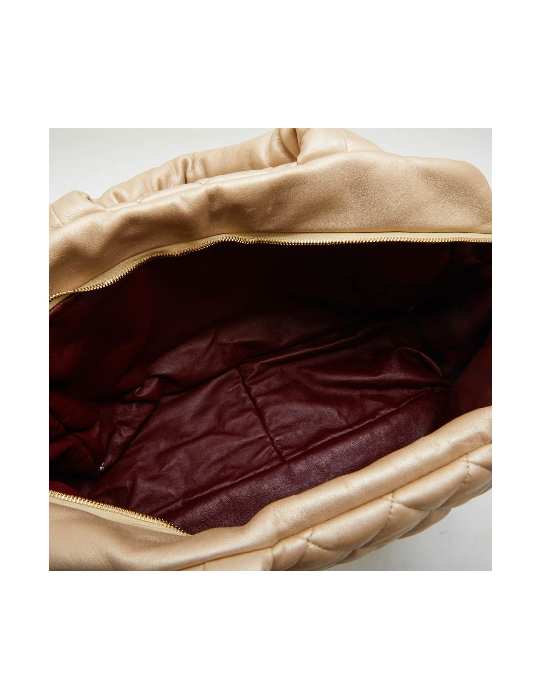 Sac "Cocoon" Chanel en cuir matelassé or, entièrement doublé en cuir bordeaux avec une poche zippée et un porte clef. Hologramme : 1333... pas de carte d'authenticité. Made in Italy. En très bon état. Extrêmement léger, il sera votre compagnon de voyage. Double fermeture zippée.