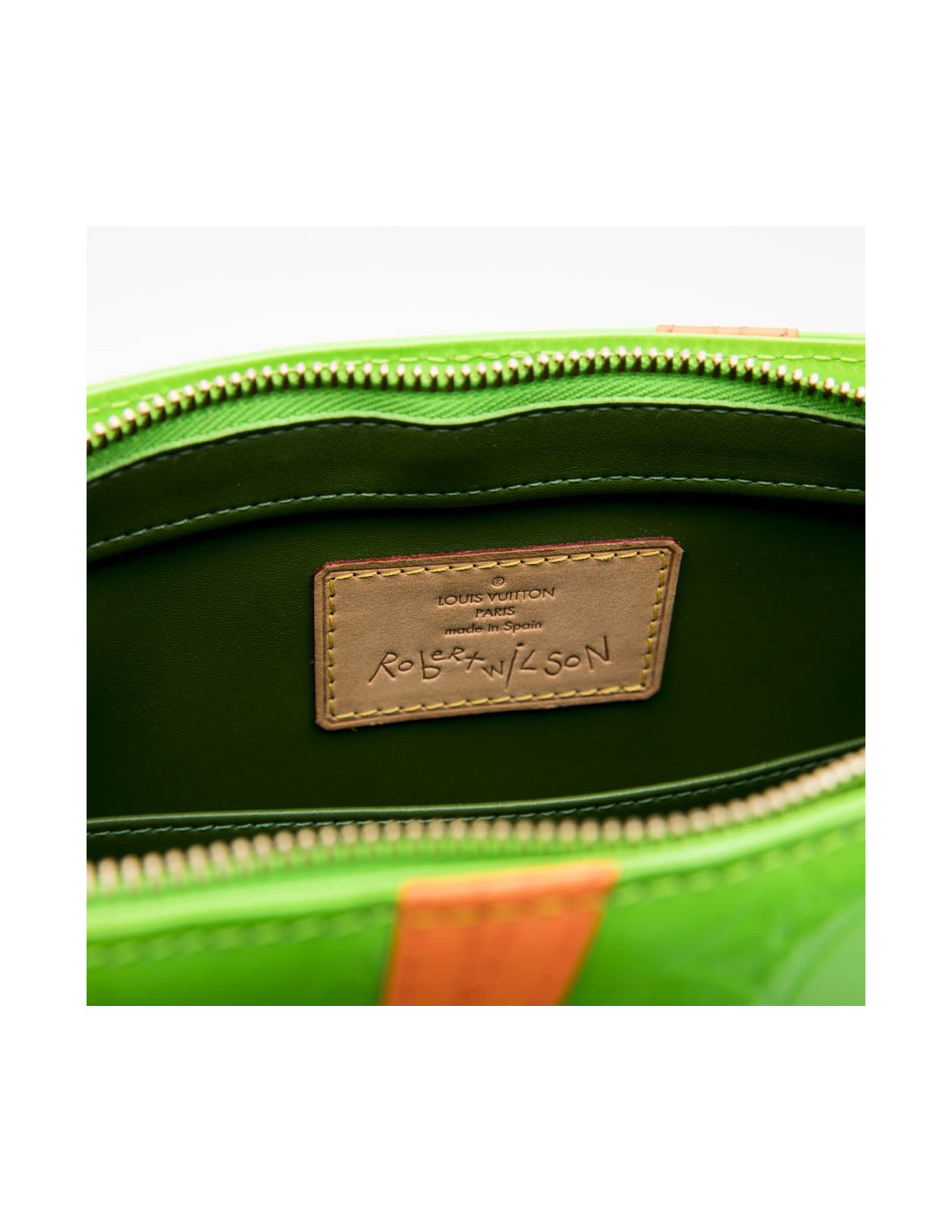 Ce sac Houston de la Maison Louis Vuitton est en cuir verni Monogram vert fluo. C'est une série Limitée créée par Robert Wilson. La bijouterie est en laiton dorée. Il a une fermeture zippée. Les finitions sont en cuir de vache naturel.