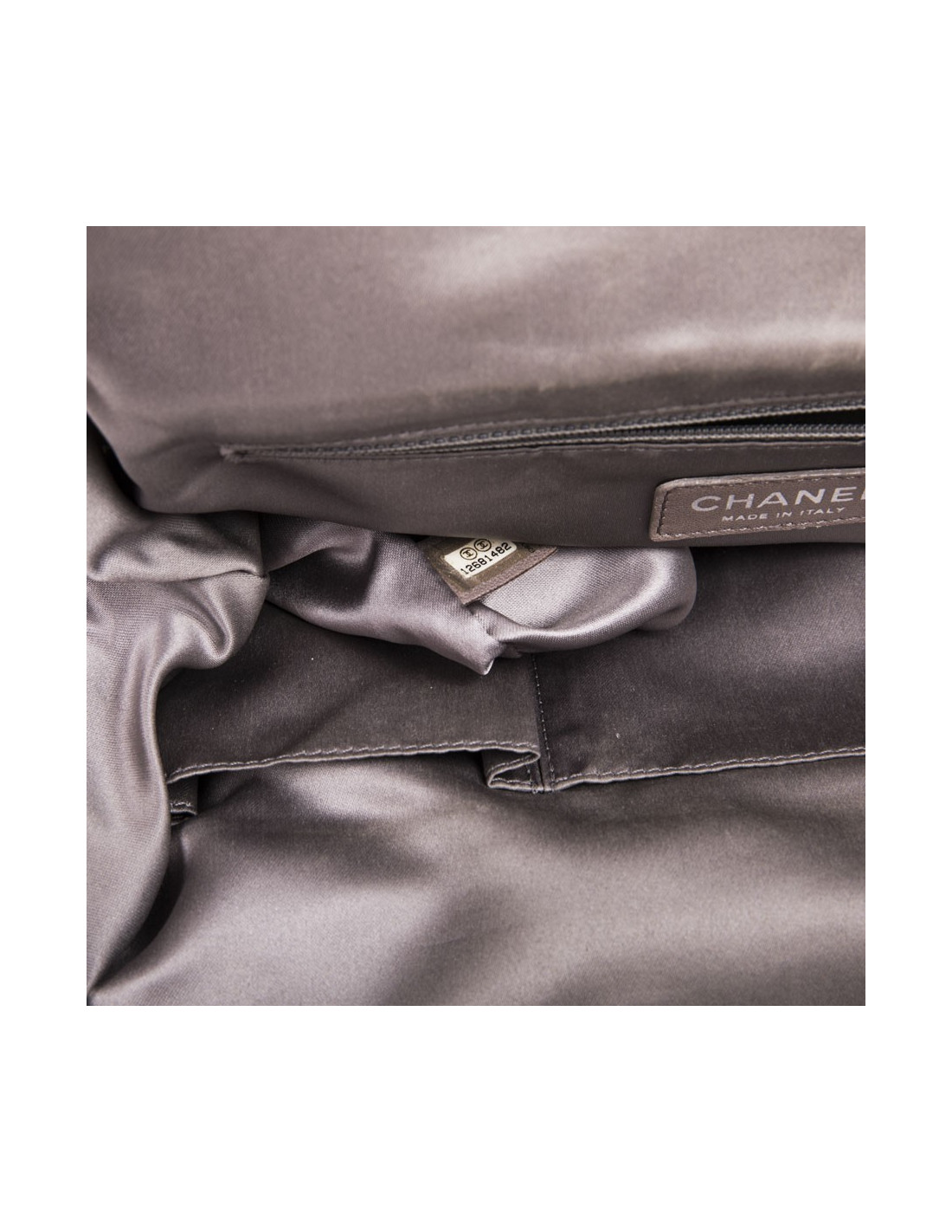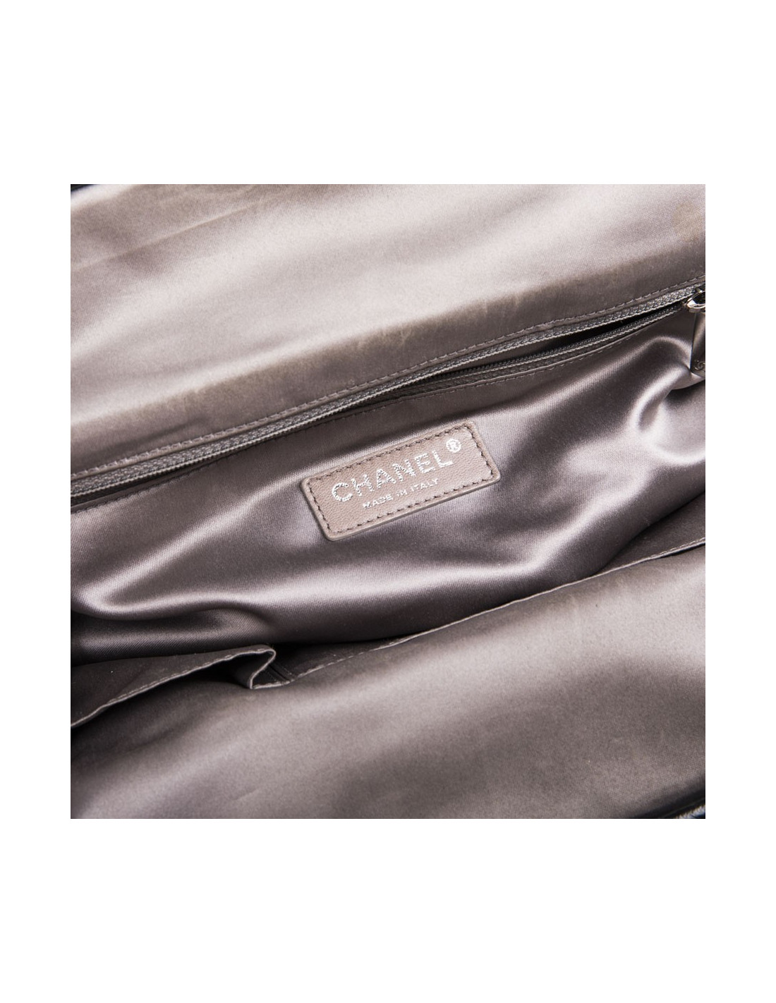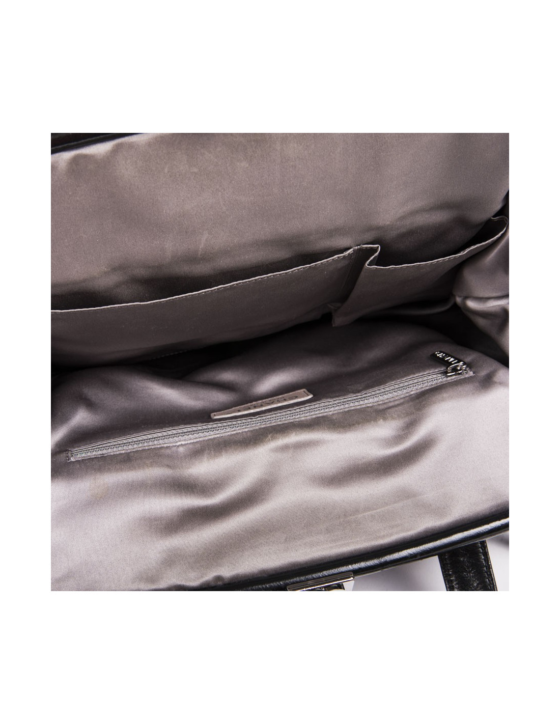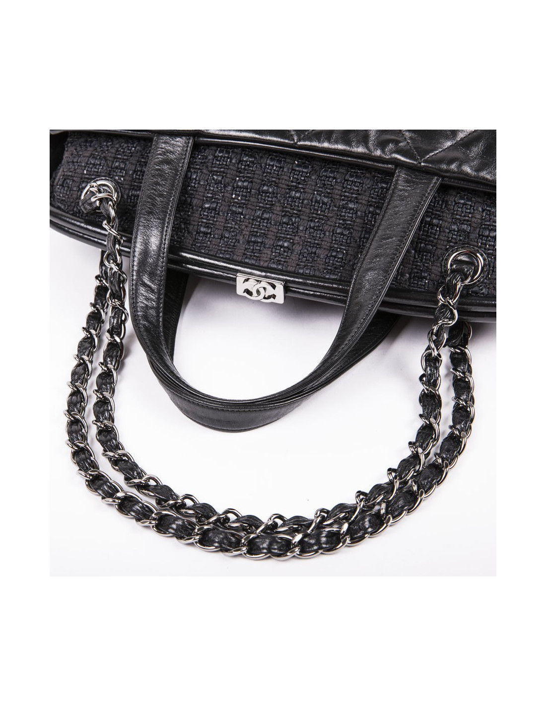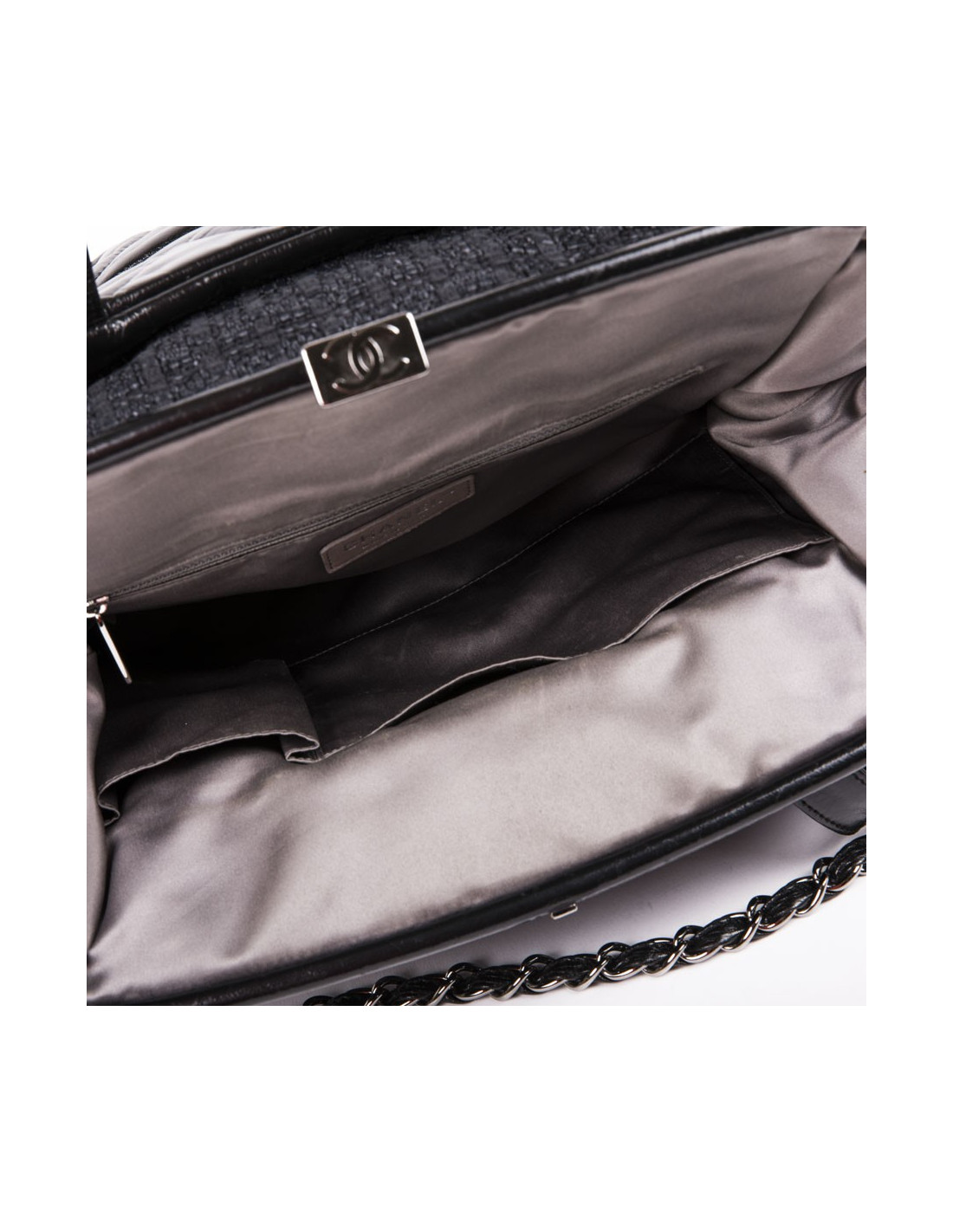 Ce sac d'occasion CHANEL est en cuir matelassé noir vieilli et tweed noir. La bijouterie est en argent palladié. L'intérieur est en satin gris avec plusieurs poches dont une avec fermeture éclair. Il peut se porter à la main avec ses deux petites anses en cuir ou à l'épaule avec ses chaines en argent tressées de cuir. Il se ferme sur le dessus par un fermoir à bascule " CC ". Il est en très bon état.