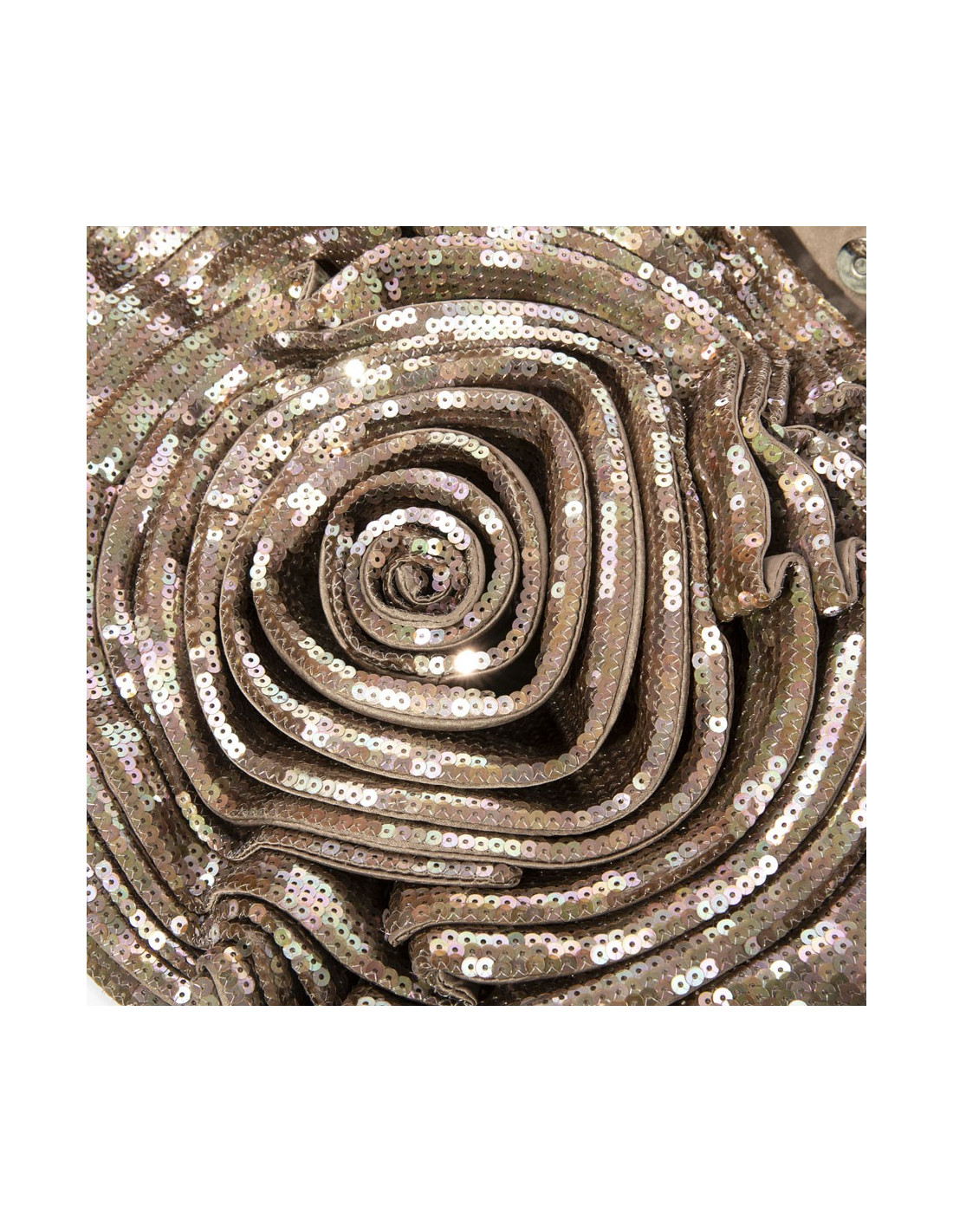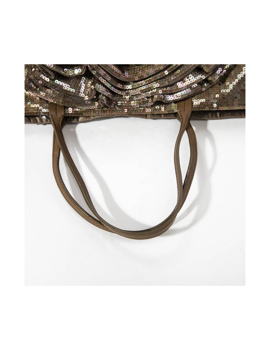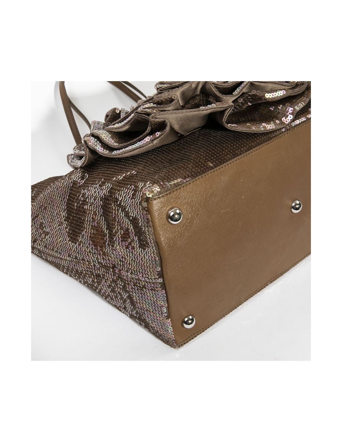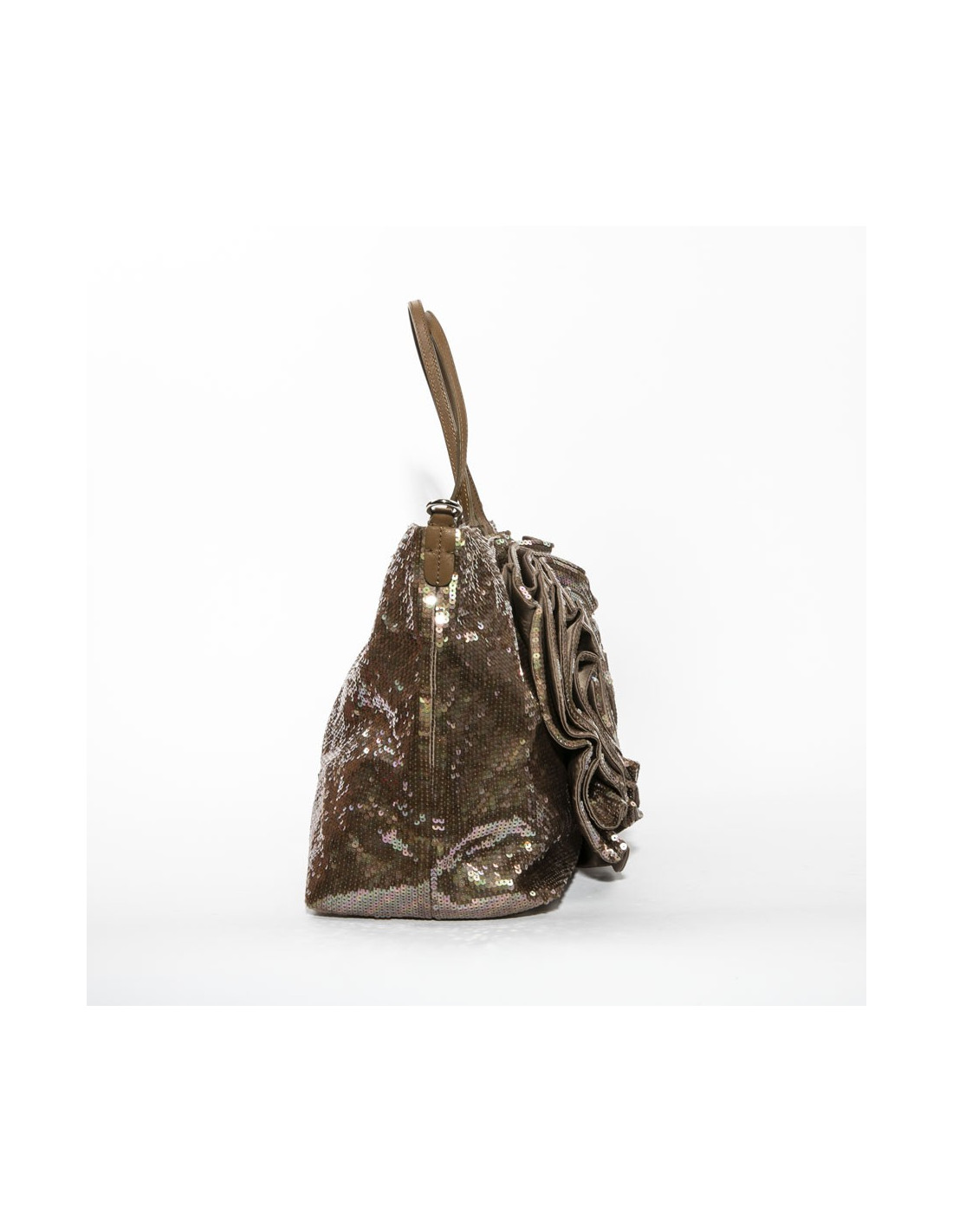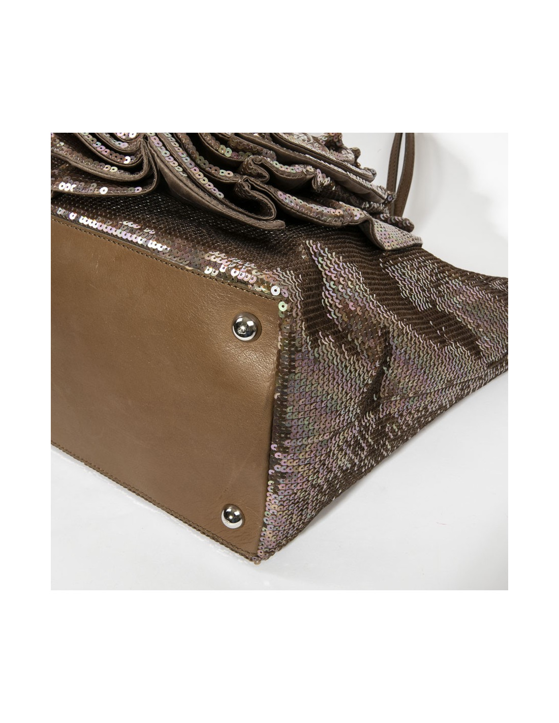 Sac VALENTINO en sequins marrons aux reflets roses, grande fleur en relief d'un côté, anses en cuir.